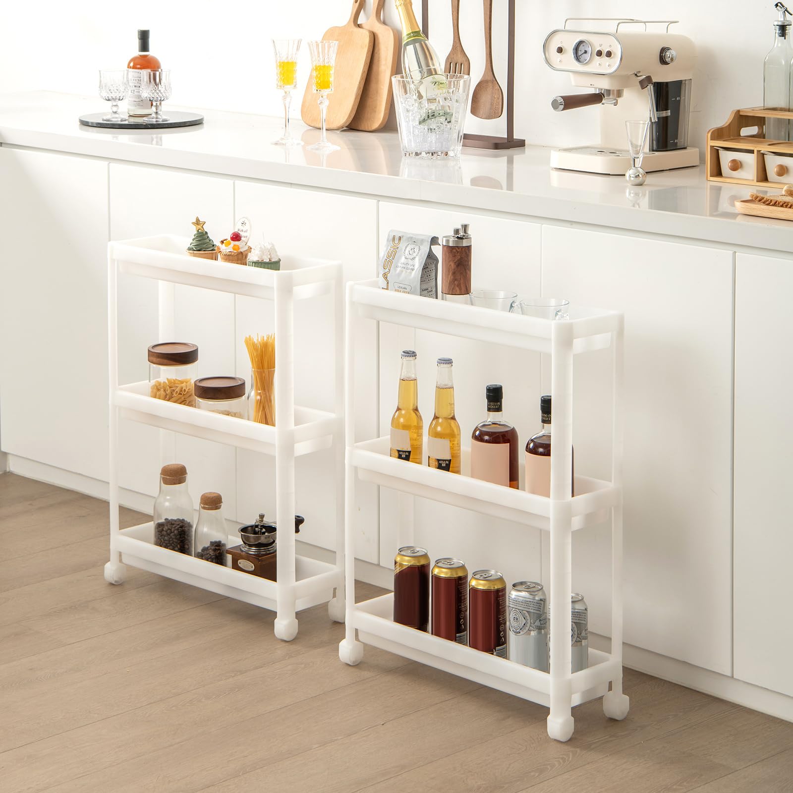 After simple assembly, these 3-tier open shelves are ready to accommodate different items. And then, these smooth casters allow you to push these utility carts wherever you want, such as the kitchen, bathroom or laundry room. After that, just push them into the narrow gaps for space-saving.
