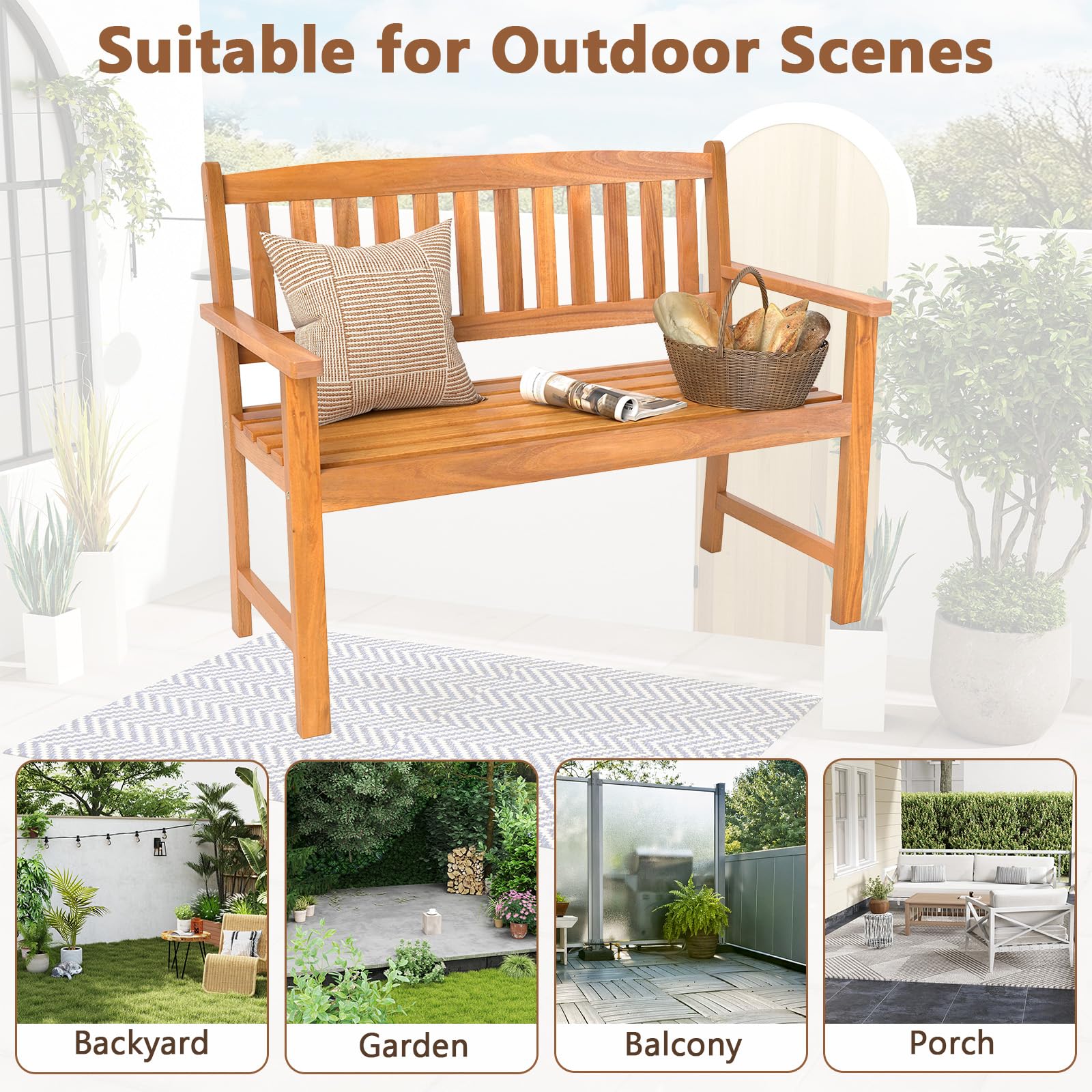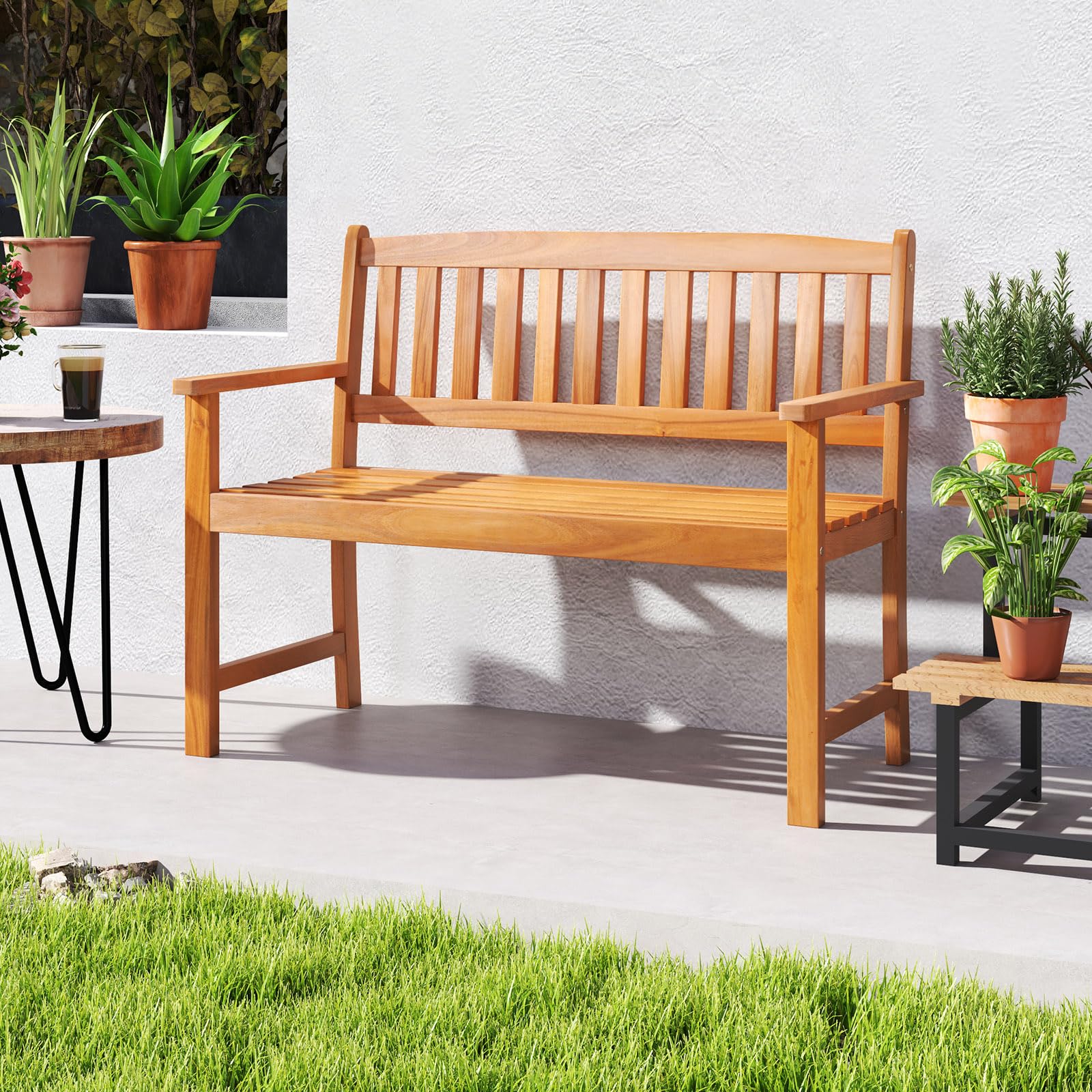 Crafted from acacia wood, this wooden bench offers the perfect blend of style and functionality. Spacious seat easily accommodates 2 people, with a maximum weight capacity of 800 lbs, making it an ideal choice for enjoying some relaxed time outdoors. Ergonomically designed with comfortable backrest, curved seat and comfy armrests, the bench promises enduring comfort. Plus, the smooth surface is easy to clean, slatted design adds aesthetic appeal, and the solid wood frame ensures stability. Suitable for various outdoor settings like patio, garden, or deck, the acacia wood patio bench allows you to unwind outdoors.
