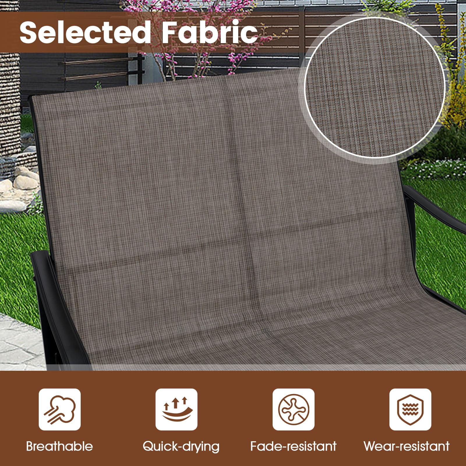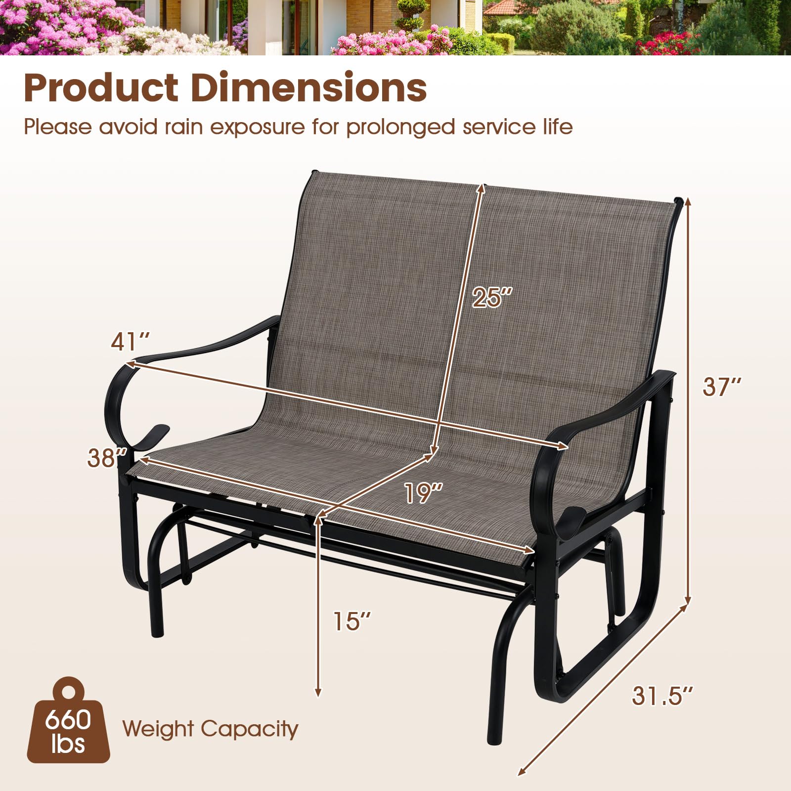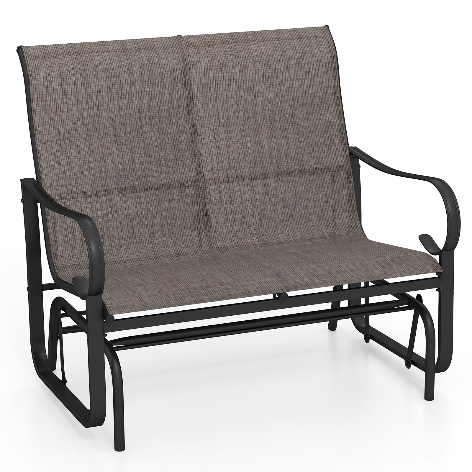 Constructed with a sturdy metal frame and reinforced crossbars, this porch glider can comfortably support up to 660 lbs, making it both strong and reliable. Its smooth gliding mechanism ensures that you and a loved one can relax in ultimate comfort, while the breathable, quick-drying mesh fabric of the patio swing bench keeps you cool and comfortable on summer days, and is also fade-resistant for durability. Moreover, the spacious design features a 38" seating area, 25" high backrest and curved armrests, ensuring roomy comfort on this elegant balcony loveseat.