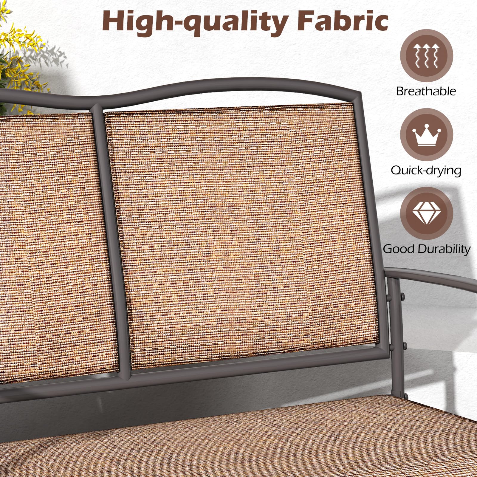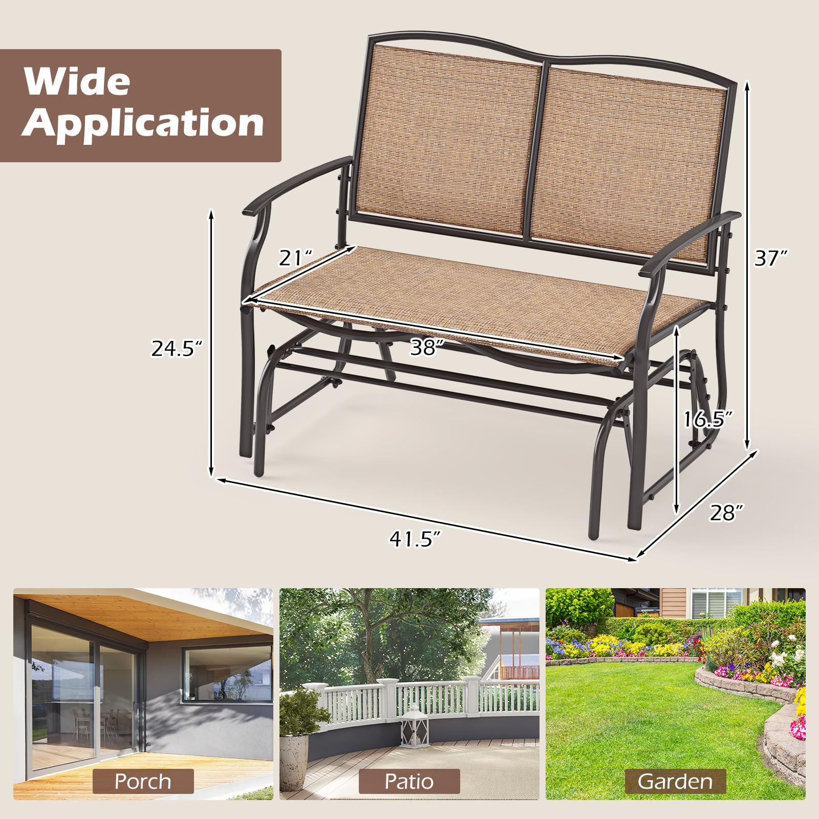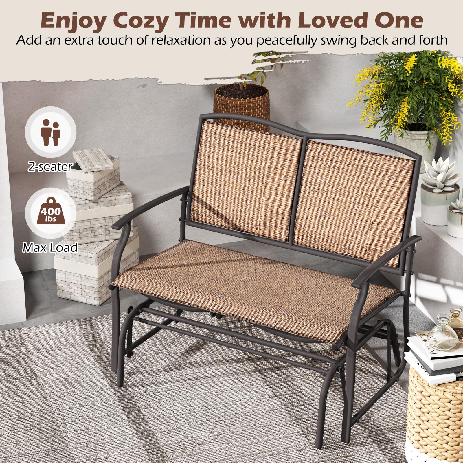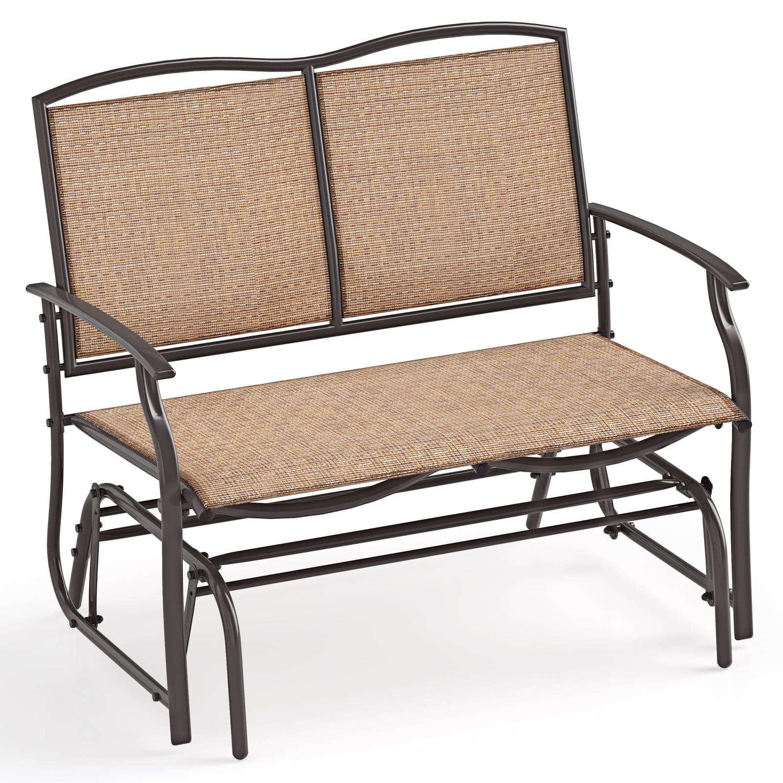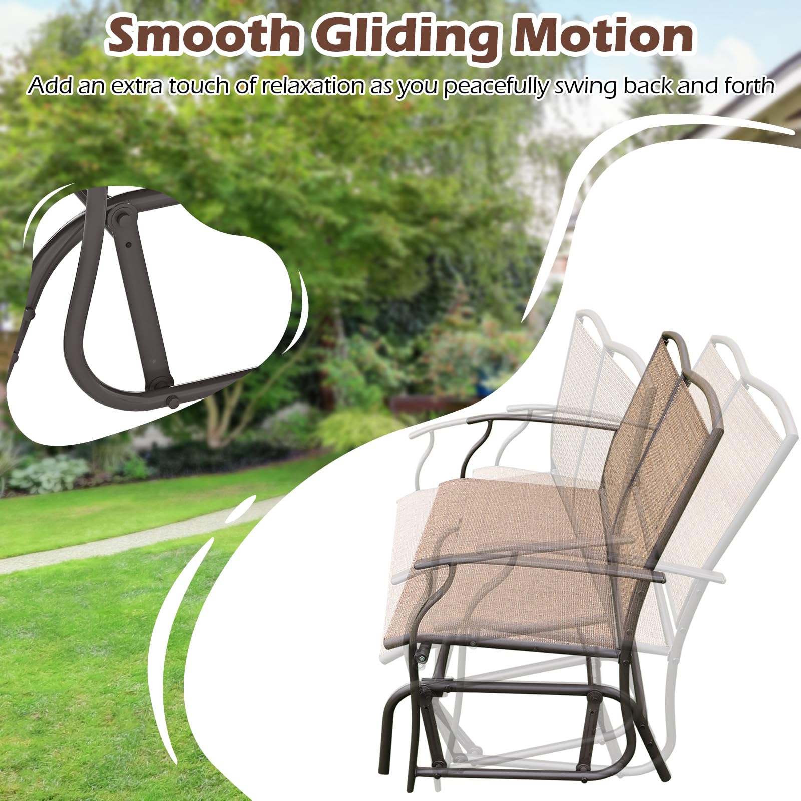 Crafted from high-quality, breathable fabric that's both comfortable and long-lasting, this patio small loveseat is ideal for your porch, garden, patio or backyard. Designed to accommodate 2 people comfortably with its strong loading capacity, this outdoor bench features a sturdy metal frame that ensures stability. Enjoy a serene glide with its smooth motion and quiet glide technology, perfect for relaxing days or cozy evenings enjoying the great outdoors.