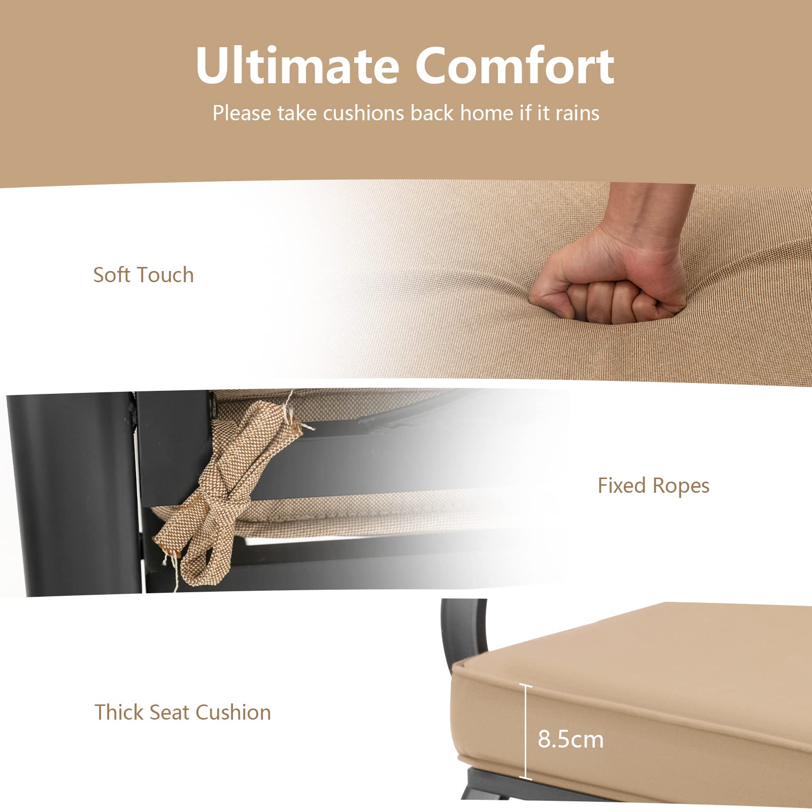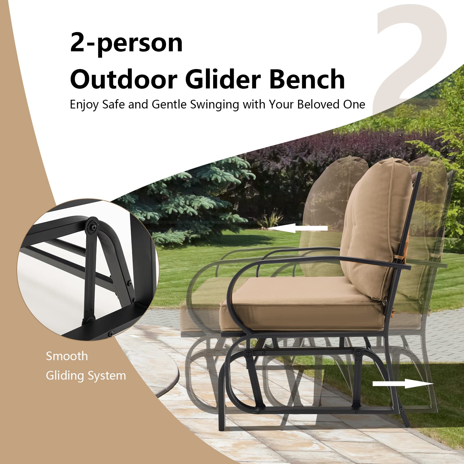 A slight rocking back and forth will make the outdoor time more leisurely. And the soft cushions and ergonomic armrests allow you to relax completely. Even if you sit for a long time, this porch glider will always remain stable because of the heavy-duty steel frame with anti-slip foot pads. And it is suitable for different outdoor places, such as the porch, patio, garden, and backyard, etc.