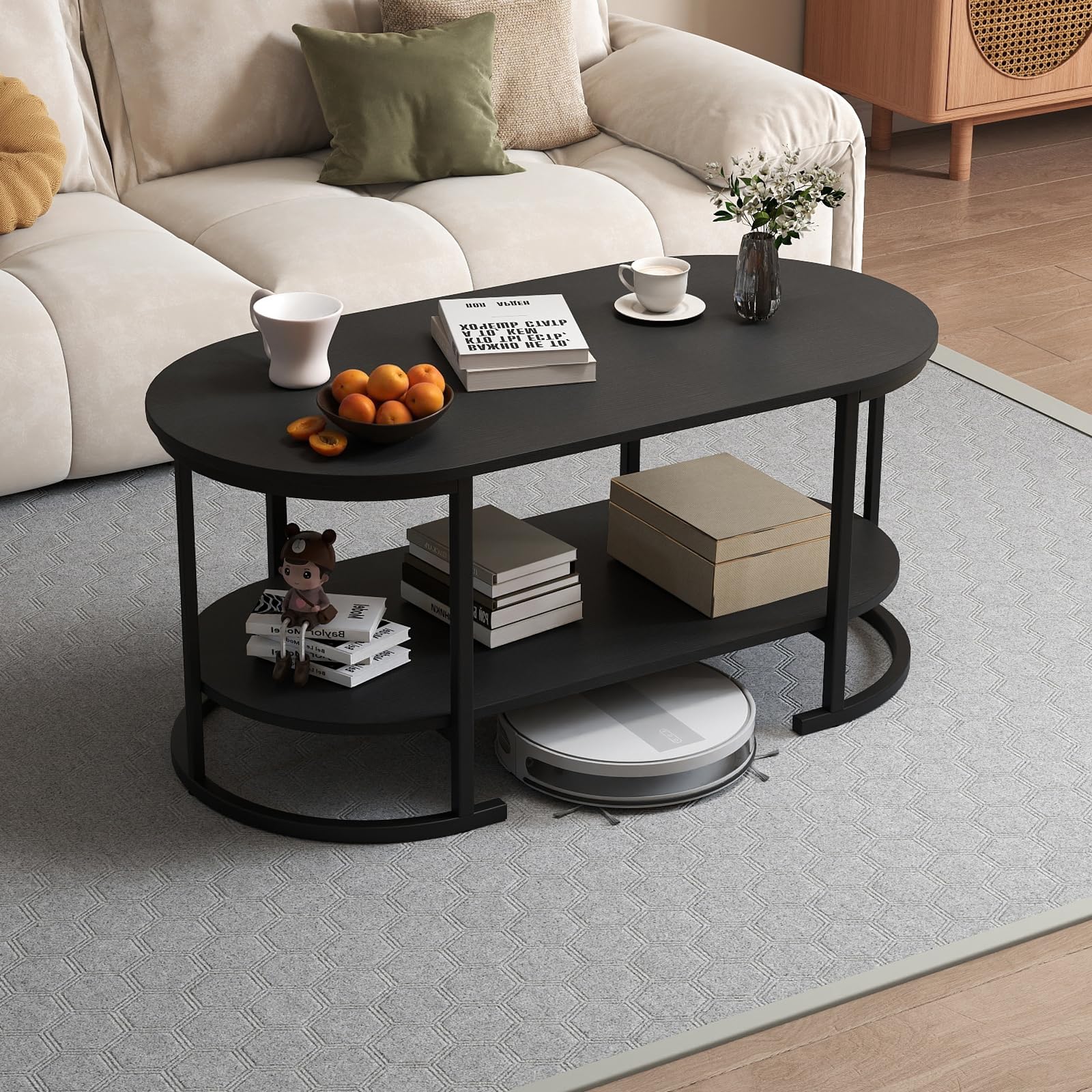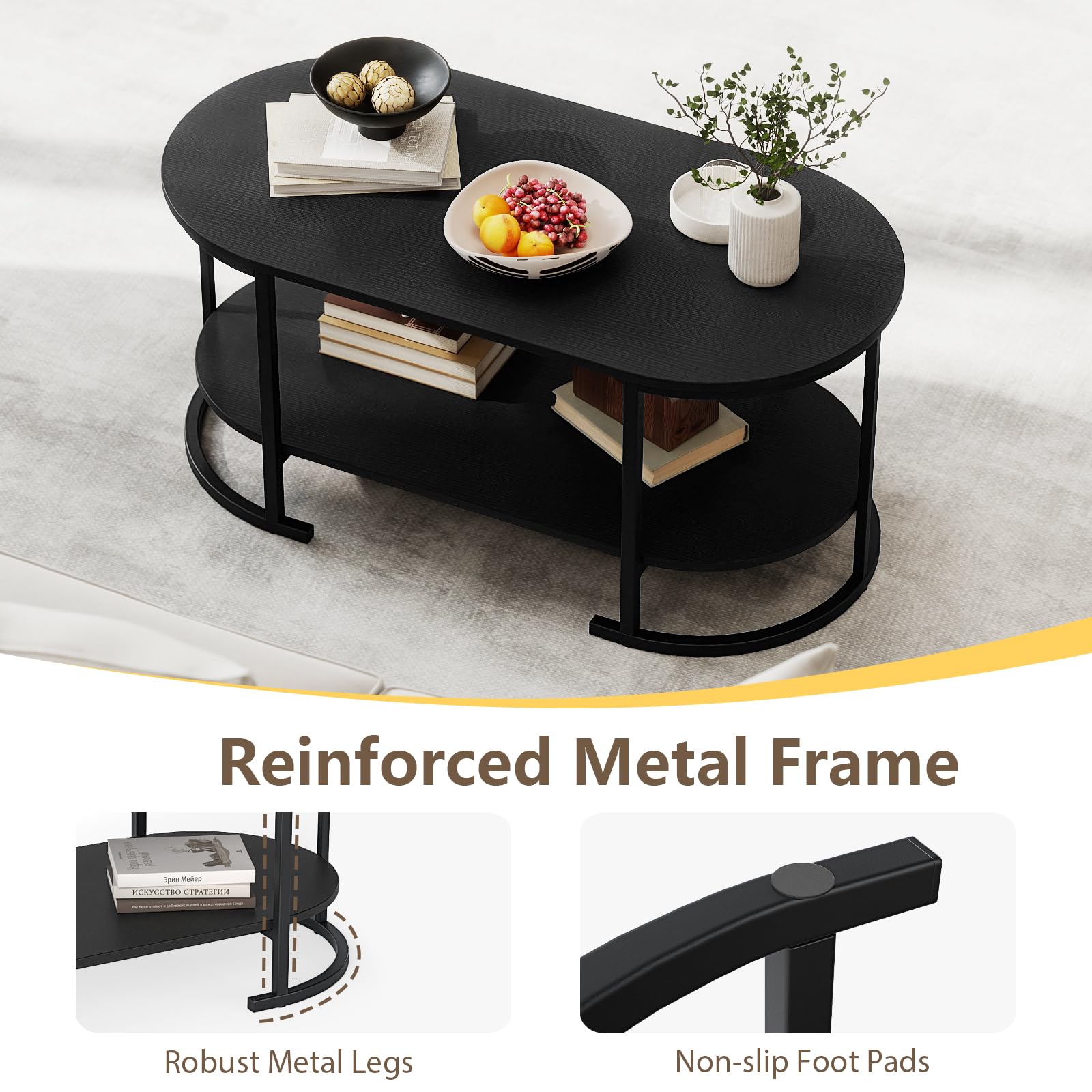 Discover the blend of elegance and practicality in our oval coffee table! With its chic oval design and an exquisite faux-marble texture/a rustic wood-grain finish, this accent table becomes the stunning centerpiece of any room. Enjoy the convenience of its spacious 2-tier design—perfect for displaying your favorite art or storing game night essentials. Built to last with a solid metal frame that confidently handles up to 176 lbs in total, and robot-vacuum friendly features, it’s designed for effortless maintenance. Whether transforming from a day-time office space to an evening relaxation spot, this center table adapts to your dynamic lifestyle, enhancing both the function and style of any living space. Elevate your home with this versatile showstopper!