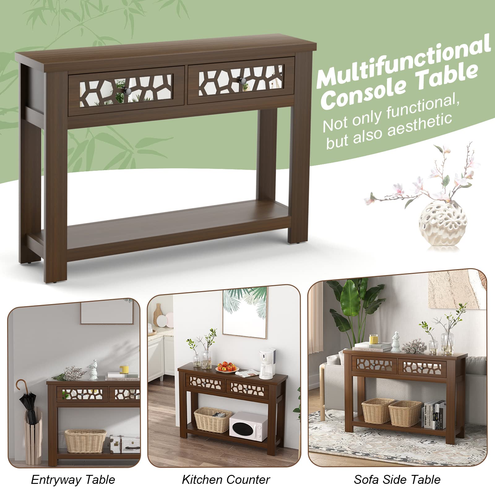 Are you looking for a narrow table which could fits the space at the entrance? This console table is a good choice for you! It can be a 3-tier console table for anywhere. It has wide table top and 2 storage drawers, as well as the bottom shelf. You can choose to display your collection or store the books or magazines on the shelf. The mirrored front of the console table makes it look extra stylish and attractive. Suitable for living room, bedroom or any small space! This entryway table can add a modern and charming feeling to your room.