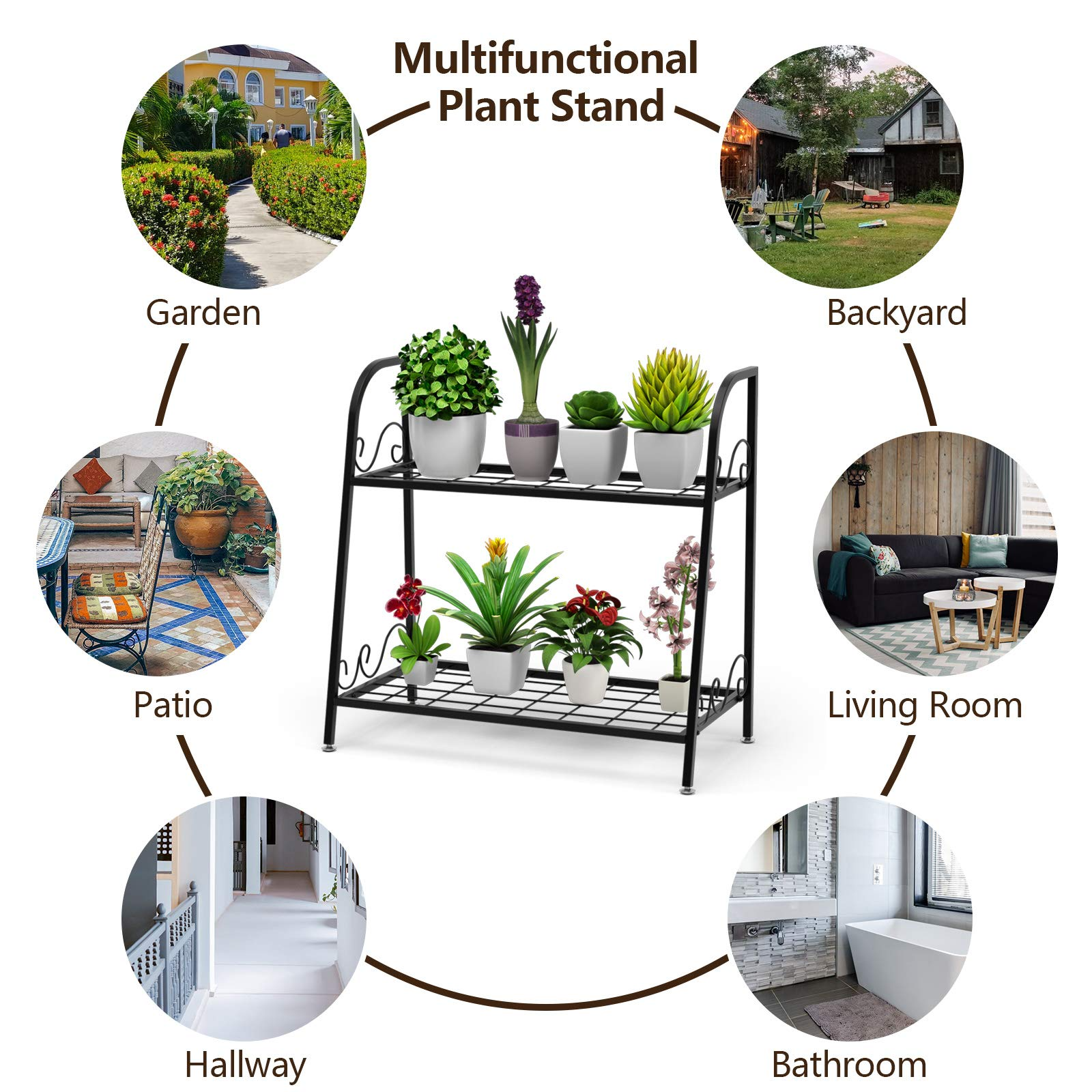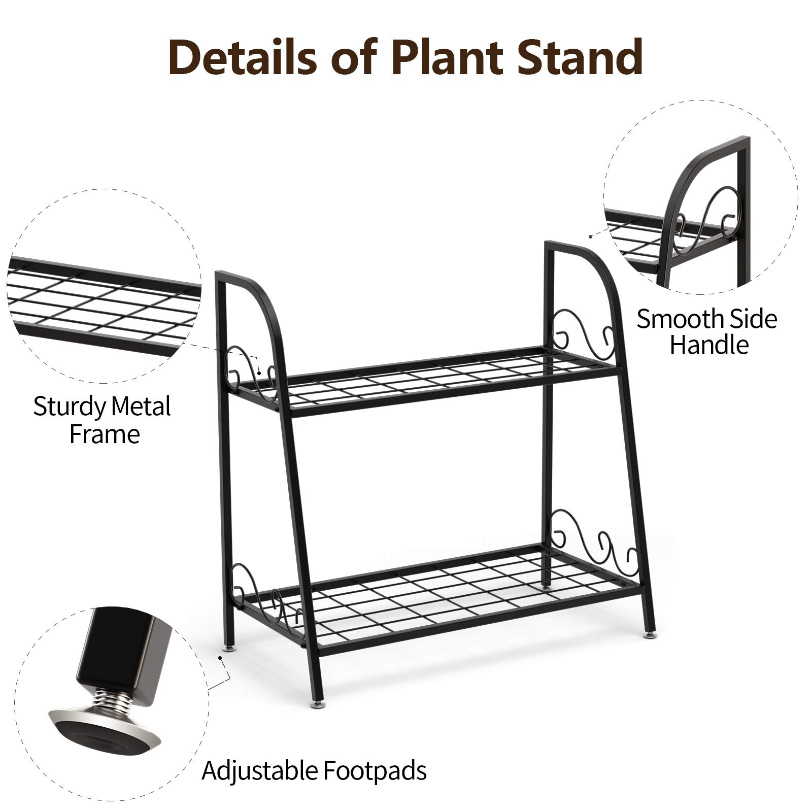 This 2-tier metal plant stand adds glamour of color to your home. Made of heavy-duty steel frame and weather-resistant powder-coated finish, this plant stand is sturdy and durable for long service life. And the slightly adjustable footpads add additional stability and protect the floor from being scratched. 2-tier design provides enough space to place various sized plants and it is also suitable for holding a variety of items, such as books, decorations, shoes, etc. With simple and elegant design, this metal plant stand fits to most home decoration and suitable for living room, balcony, garden, etc.