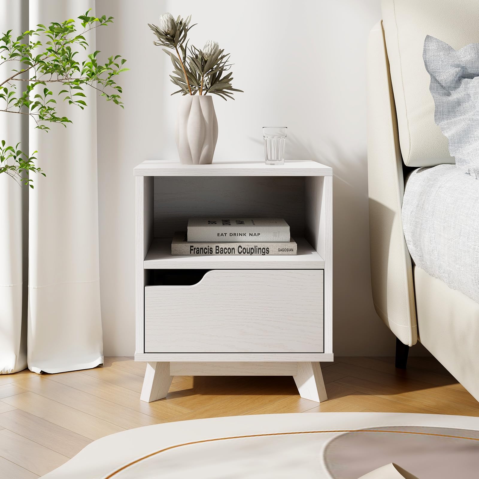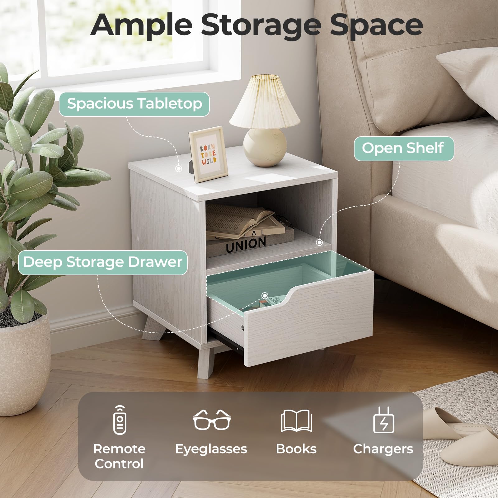 - [Ample Storage Space]: This mid-century modern nightstand features a spacious storage drawer and an open shelf, providing ample space for all your essential bedside items such as books, remote control, electronics, and more.