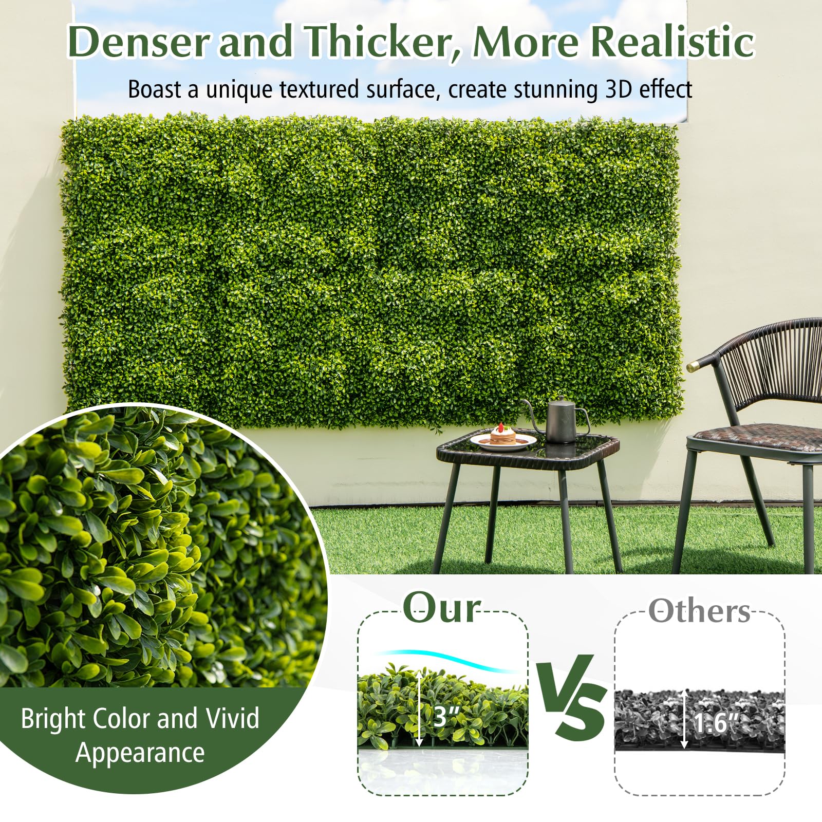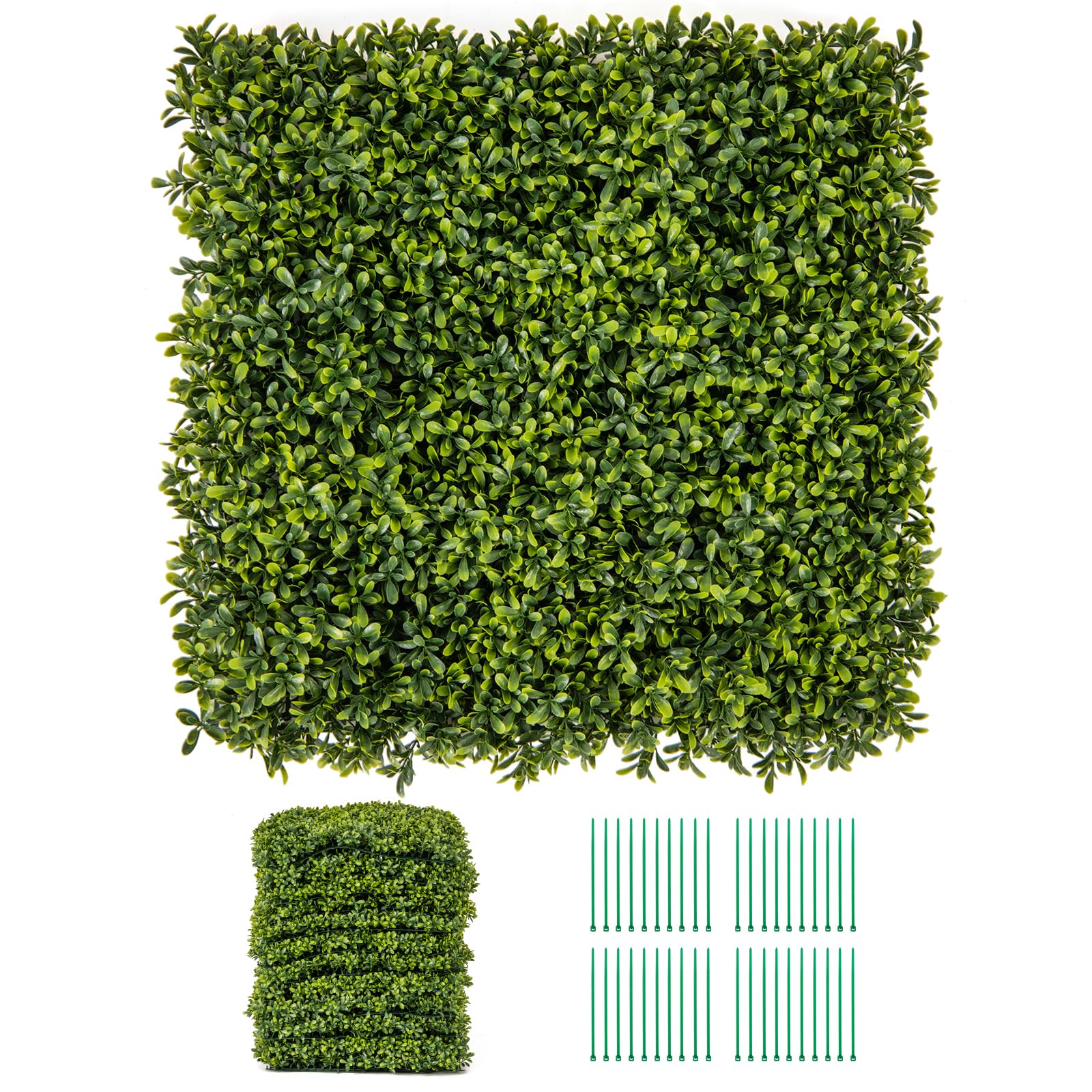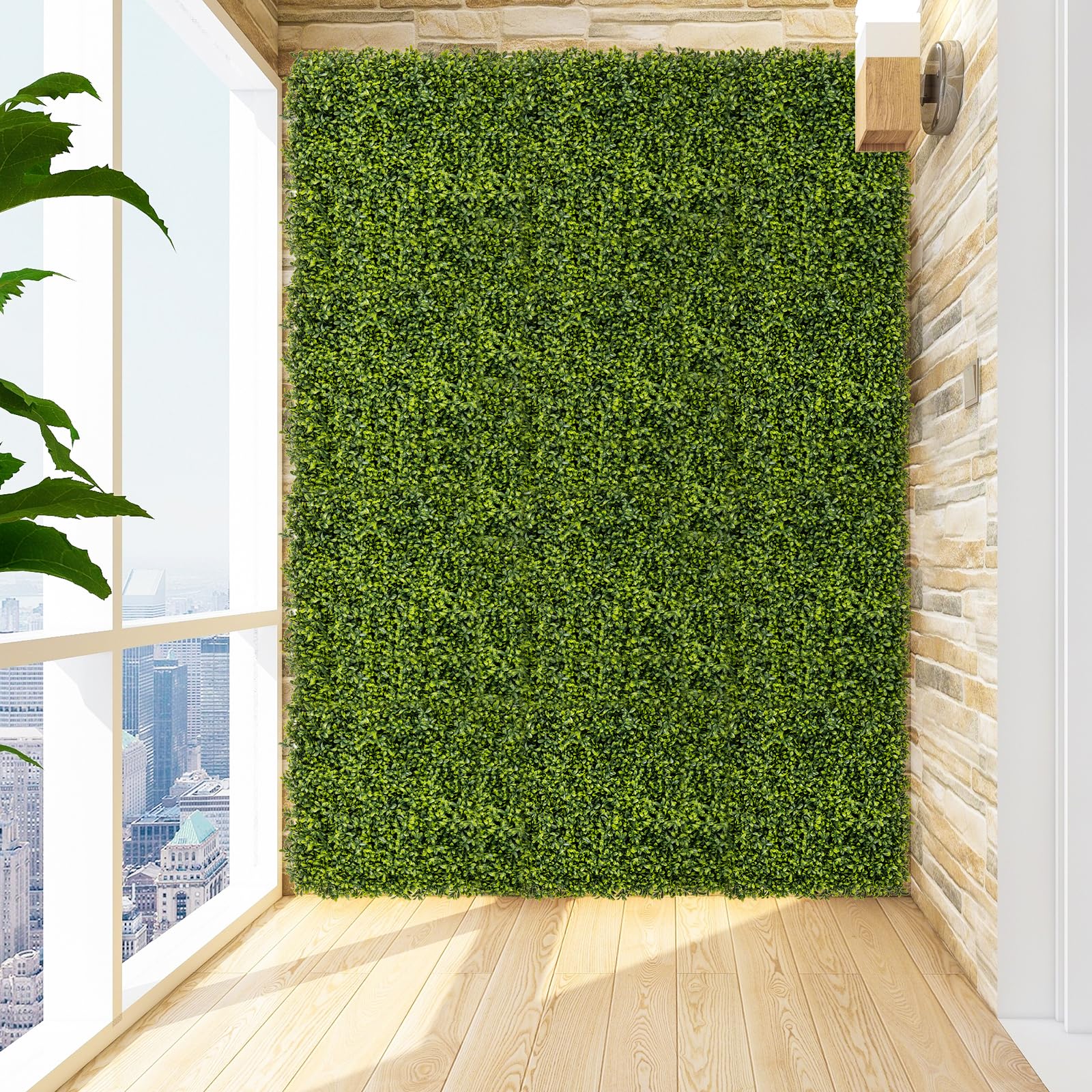 Our artificial hedge features 12 intricately designed 20'' x 20'' faux grass wall panels, standing at 3'' high, offering a lush and realistic appearance. Besides, the leaves are made of premium PE material, which is not only safe but also resistant to sun and water, ensuring long-lasting durability without fading. Installation is also a breeze with the innovative interlocking connectors, allowing for quick and secure assembly within seconds. Whether you're looking to decorate your outdoor sanctuary or bring a touch of nature indoors, these faux grass wall panels backdrop offer a convenient and maintenance-free solution for all your decor needs.