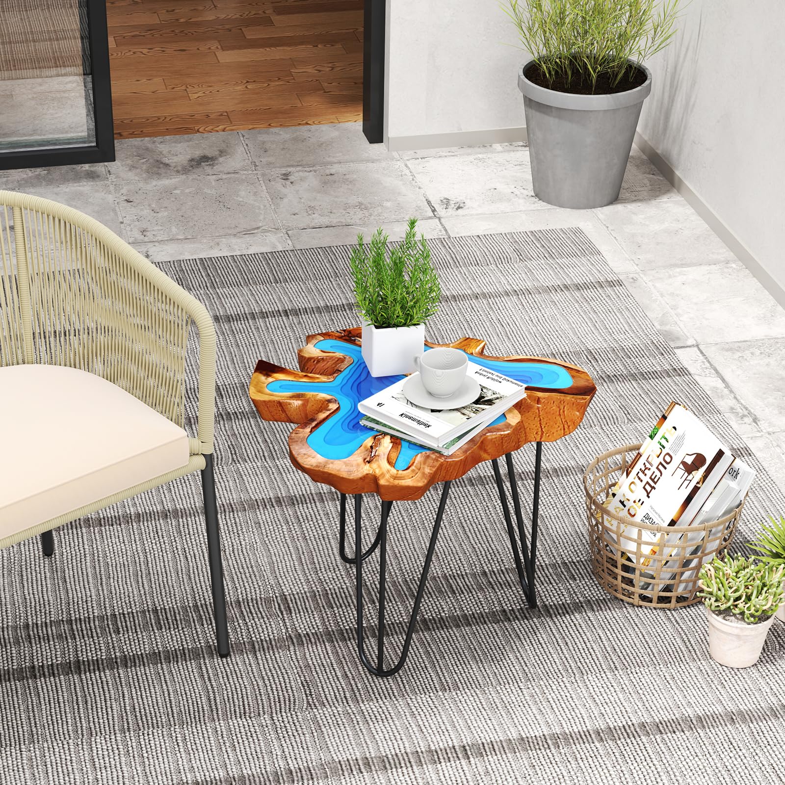 Enhance your indoor and outdoor spaces with this charming irregular side table. Constructed from premium teak wood, this outdoor end table is designed to withstand the test of time. Featuring sturdy metal tapered legs for stability on any surface, this table is as reliable as it is stylish. The unique irregular tabletop, crafted with clear epoxy resin, showcases the natural contours and beautiful wood grain, ensuring each piece is delightfully unique. The solid natural edge design adds a touch of rustic refinement that effortlessly complements any environment. Whether adorning your living room, porch, or poolside, this side table brings both elegance and functionality—perfect for holding beverages, books, or decorative items.
