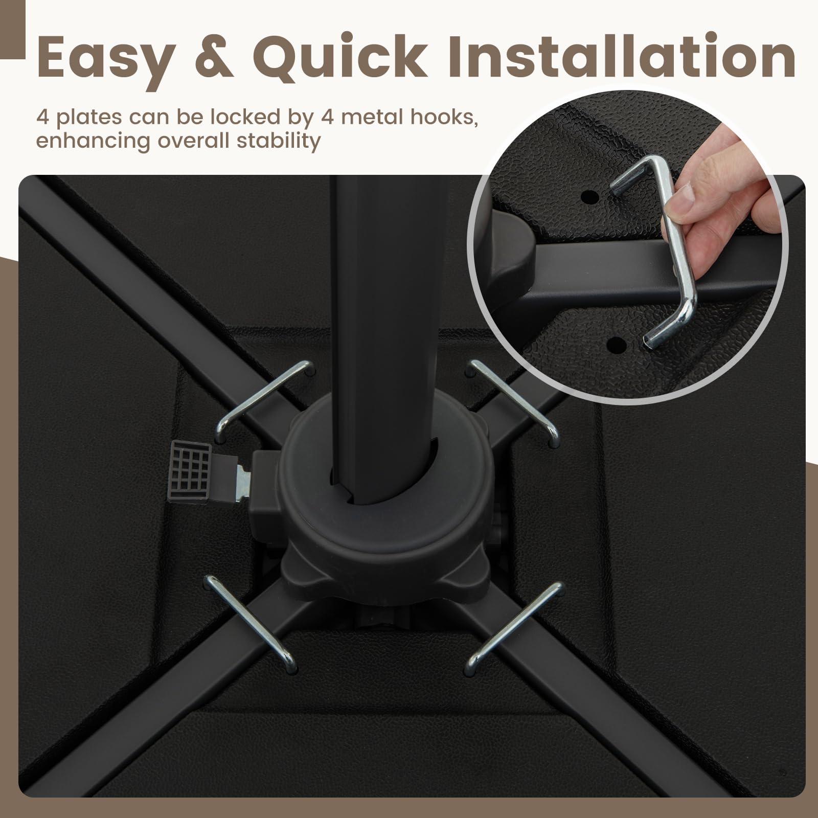 Secure your cantilever umbrella with this durable and space-efficient 4-piece umbrella base set. Designed to fit most offset umbrella cross bases (not included), it's ideal for 9–10 ft umbrellas. Each plate features a large reservoir that can be filled with water, sand, or a combination—offering up to 225 lbs of weight for maximum stability in windy conditions. Built from weather-resistant HDPE, the base is UV-protected, waterproof, and fade-resistant for long-lasting outdoor use. With grooved handles and a stackable design, it’s easy to move and store. Quick to install—just place the plates on each corner and secure them with the included metal hooks. Perfect for patios, poolside areas, cafés, and more.