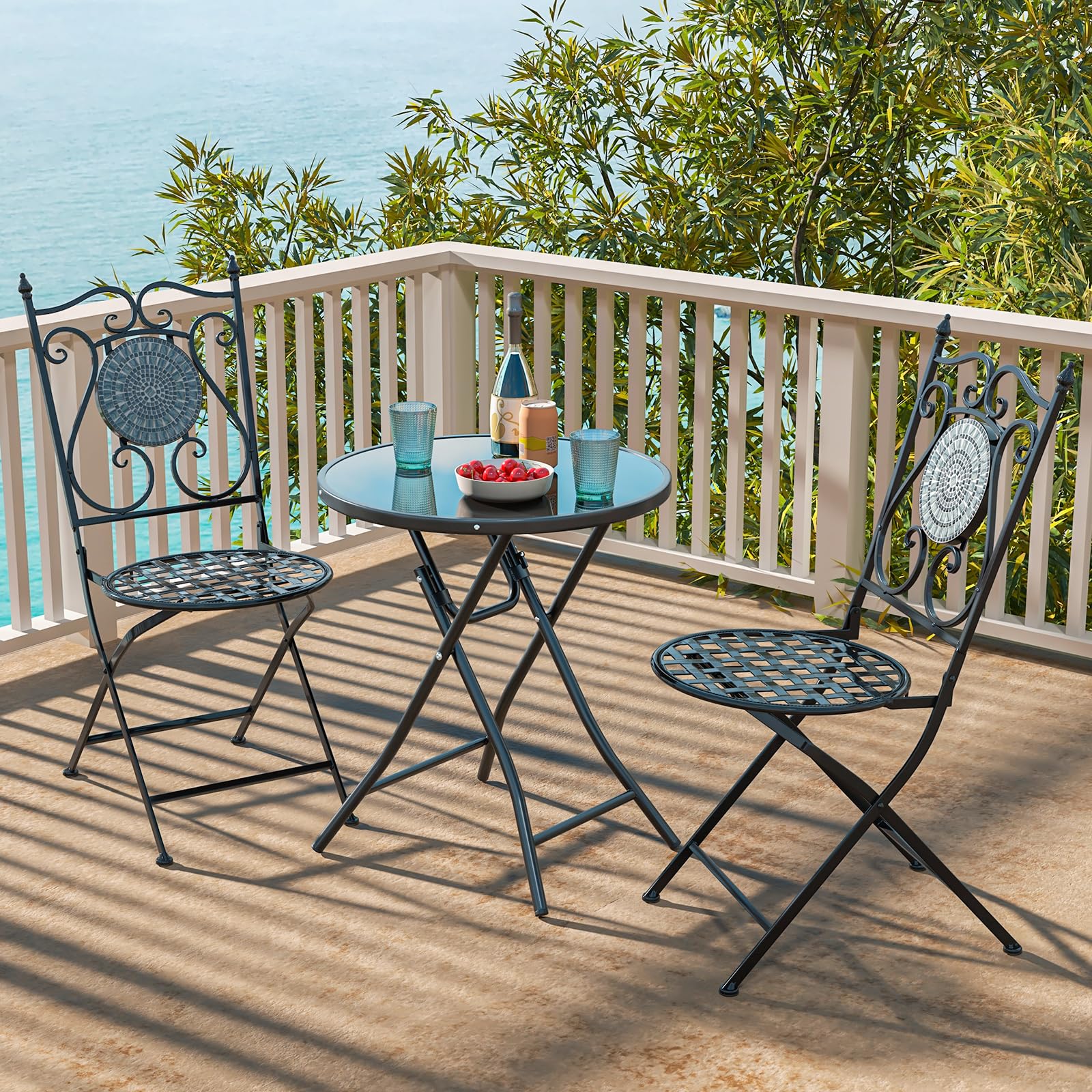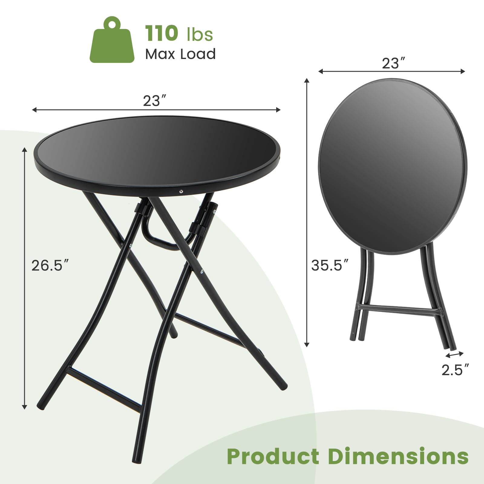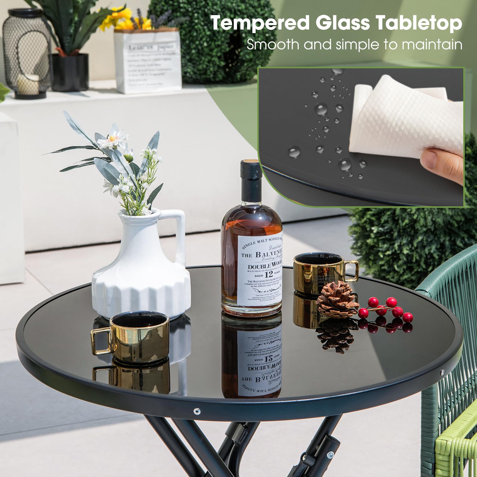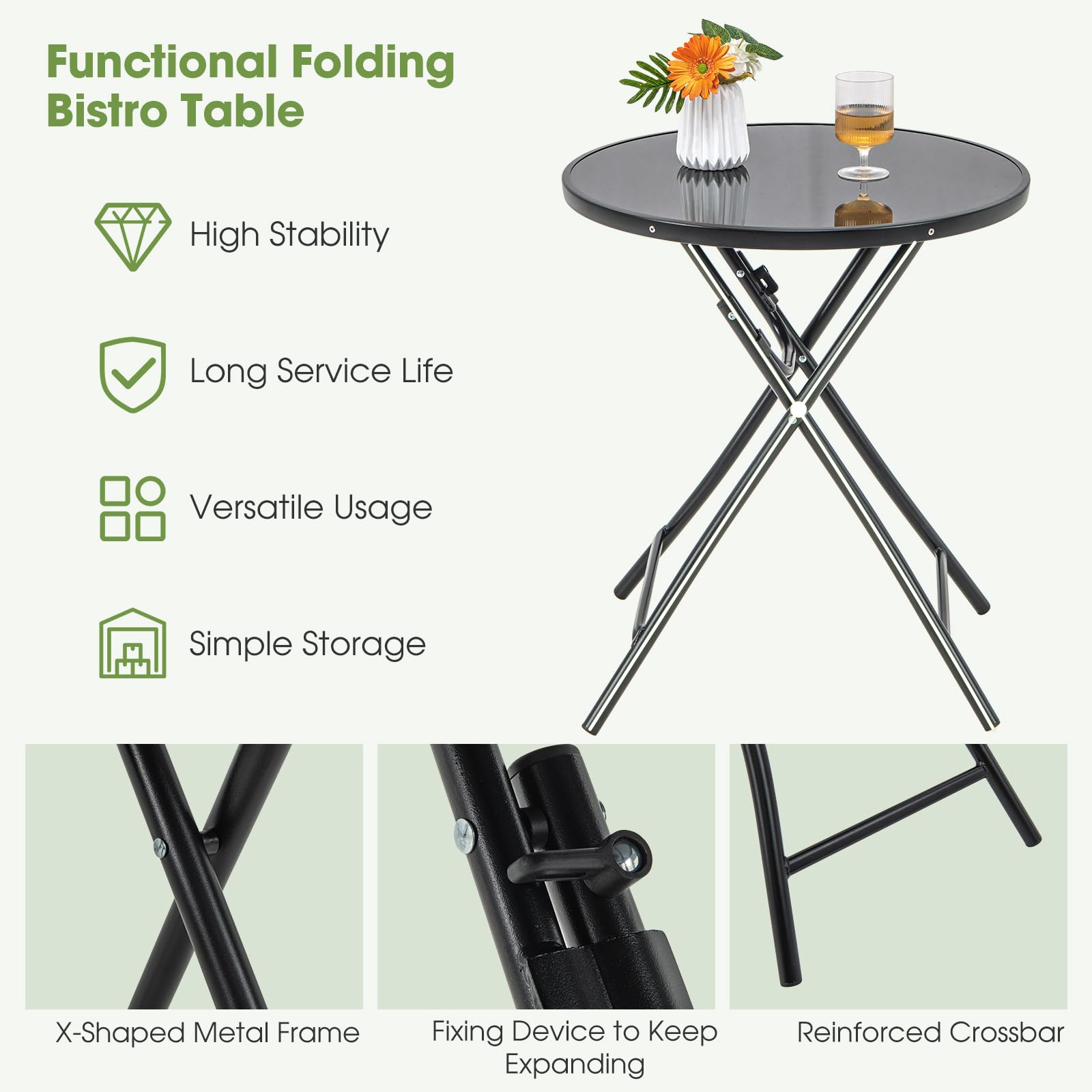 Its sturdy metal frame, which is rustproof, ensures durability and long service life, while the X-shaped metal structure and reinforced crossbars provide added stability. The high-grade tempered glass tabletop offers a perfect surface for snacks and adds an elegant touch to the surroundings. With compact folding size, this table also ensures simple storage and transportation, making it a convenient option. Suitable for a range of settings, from the backyard to the living room, this folding bistro table is the perfect choice for both functional and decorative purposes.