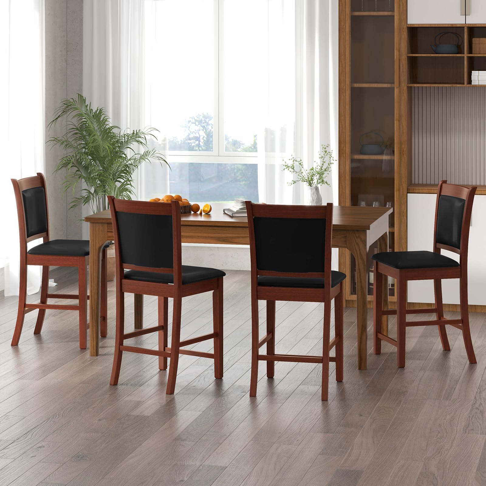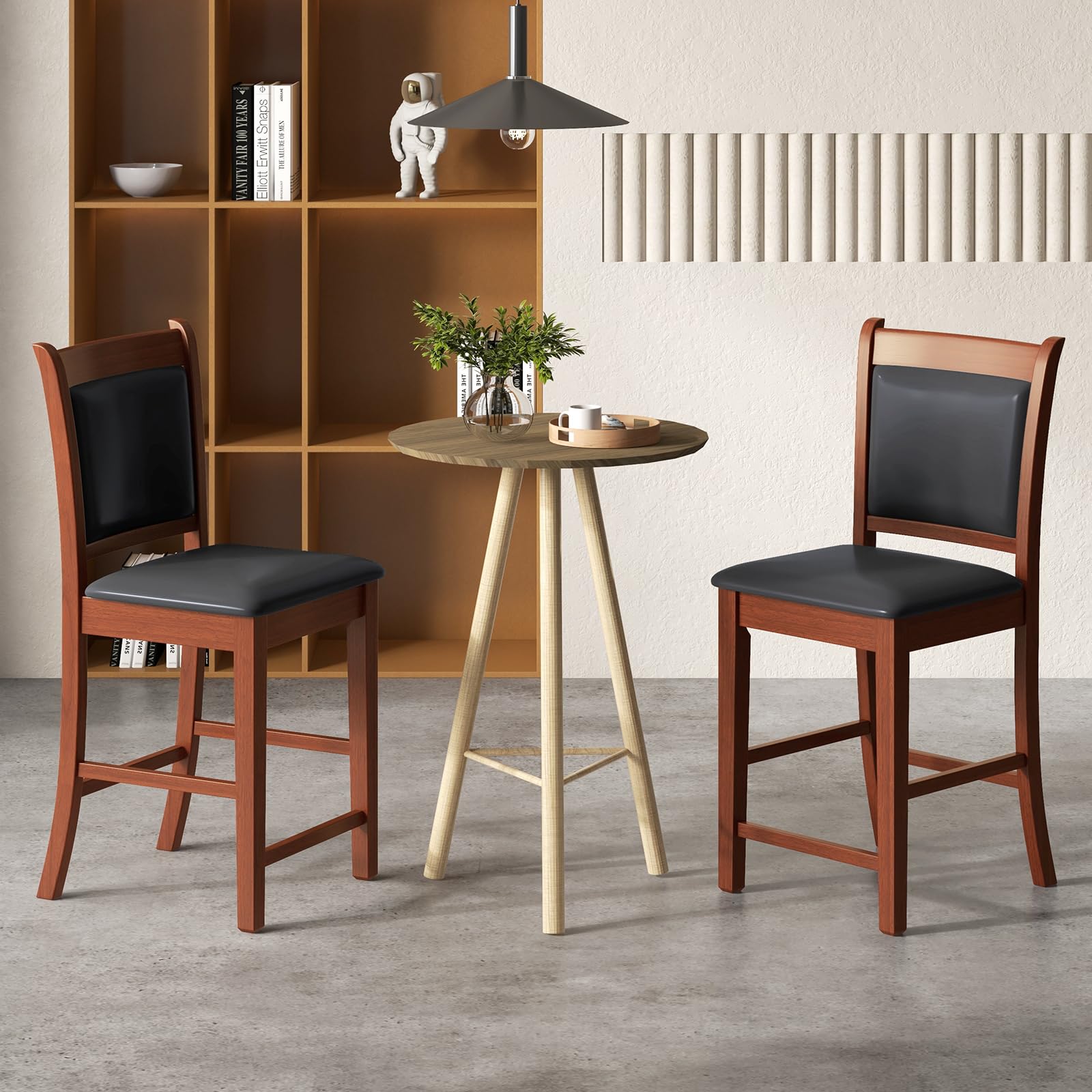 - [Comfortable Upholstered Chairs]: The seat and back of these barstools are thoughtfully upholstered with PVC leather, providing a plush and cozy sitting experience. Sit on the cushioned seat, relax against the padded backrest, and you can enjoy hours of uninterrupted comfort.