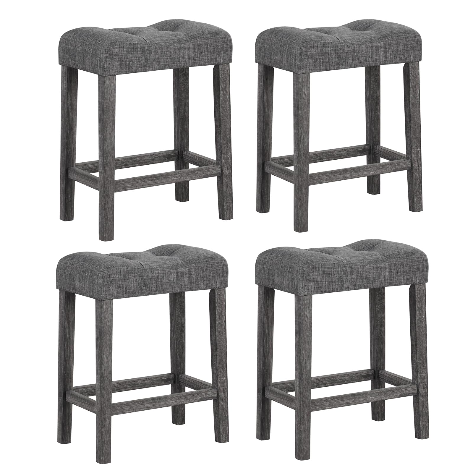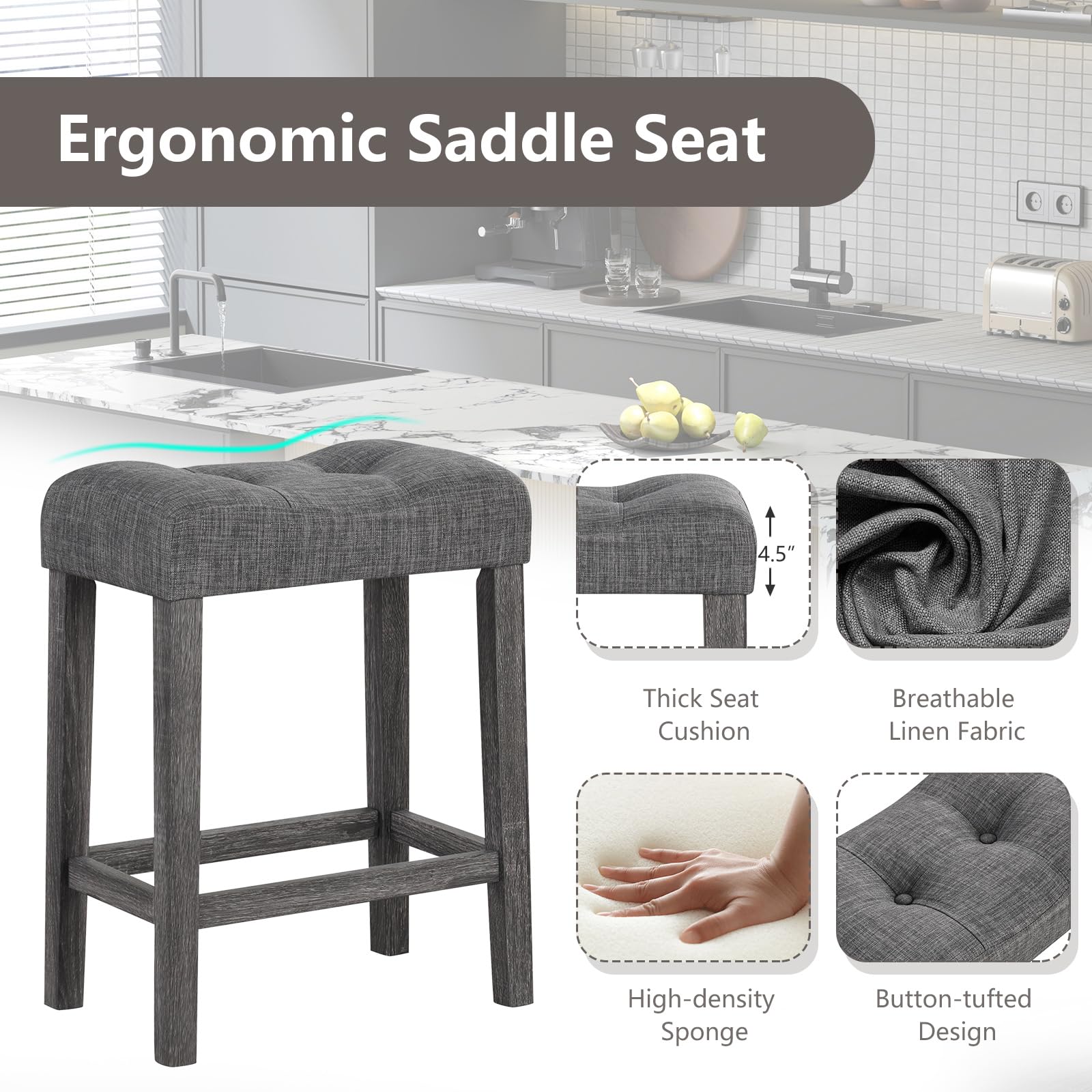 Excite your home bar area with our premium bar stool set, designed for both elegance and comfort! Featuring a unique, body-hugging saddle seat that alleviates pressure and enhances well-being during prolonged use. Wrapped in exquisite, breathable linen and supported by dense, luxurious cushioning, say goodbye to discomfort! The robustness is unmatched with its solid rubber wood construction, fit to withstand the rigors of daily life while safeguarding your floors with thoughtful foot pads. Effortlessly stylish, these stools boast a clever footrest for optimal comfort and posture benefits, making them perfect for any kitchen counter or home bar. At an ideal height, they tuck neatly under surfaces, ensuring space-efficiency. Transform your home into a hub of comfort and sophistication - perfect for the modern lifestyle.
