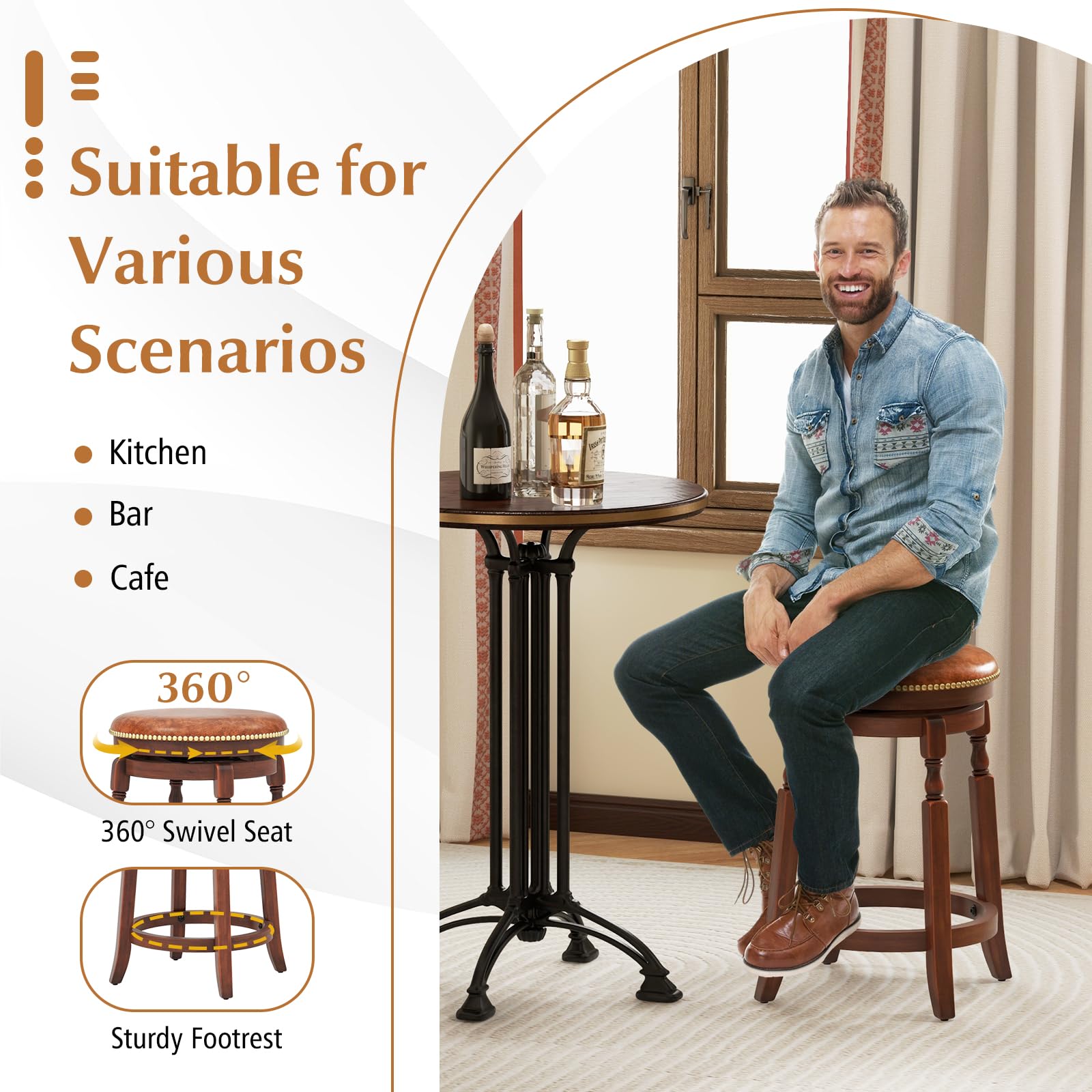 • [Built to Last]: Constructed with high-quality rubber wood material, this swivel bar stool offers exceptional sturdiness and longevity, ensuring it remains a staple in your space for years to come. Plus, the non-slip foot pads add extra stability.