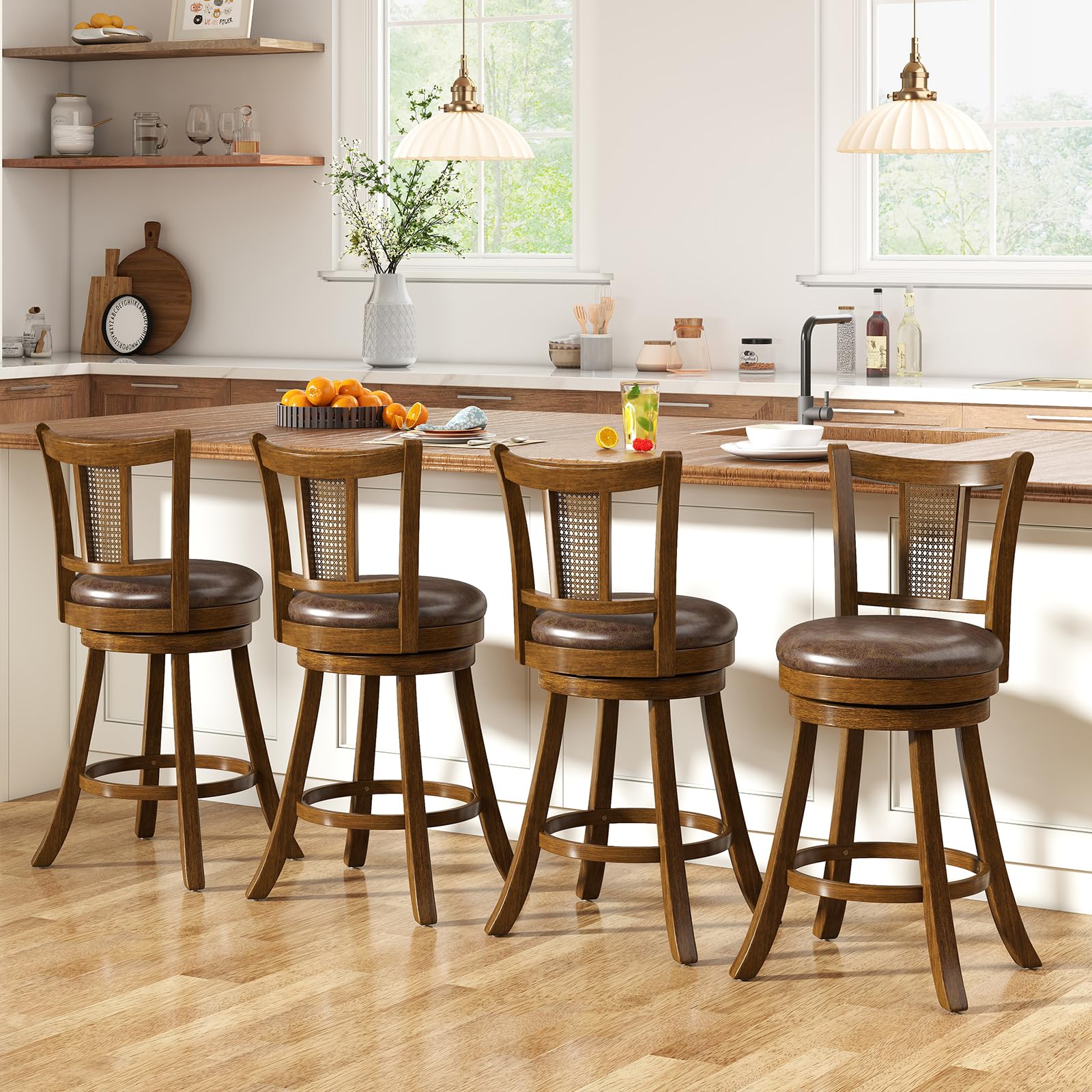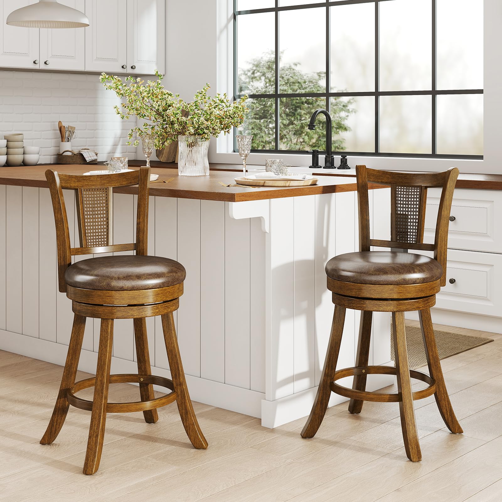 Sit more comfortably with this stylish bar chair set. The ergonomic design includes an inclined backrest and footrest to ensure maximum comfort. Enjoy the cozy padded seat made from skin-friendly leathaire and elastic sponge. More, the 360° swivel design allows you to easily chat with friends in different directions. Crafted from sturdy rubber wood, these bar stools can support up to 400 lbs and come with protective foot pads to preserve your floors. The charming rustic PE rattan design adds a touch of elegance to any space, with enduring quality that will last. Perfect for various settings including kitchen islands, dining rooms, and pubs, these barstools are compatible with bar table heights from 35" to 39".