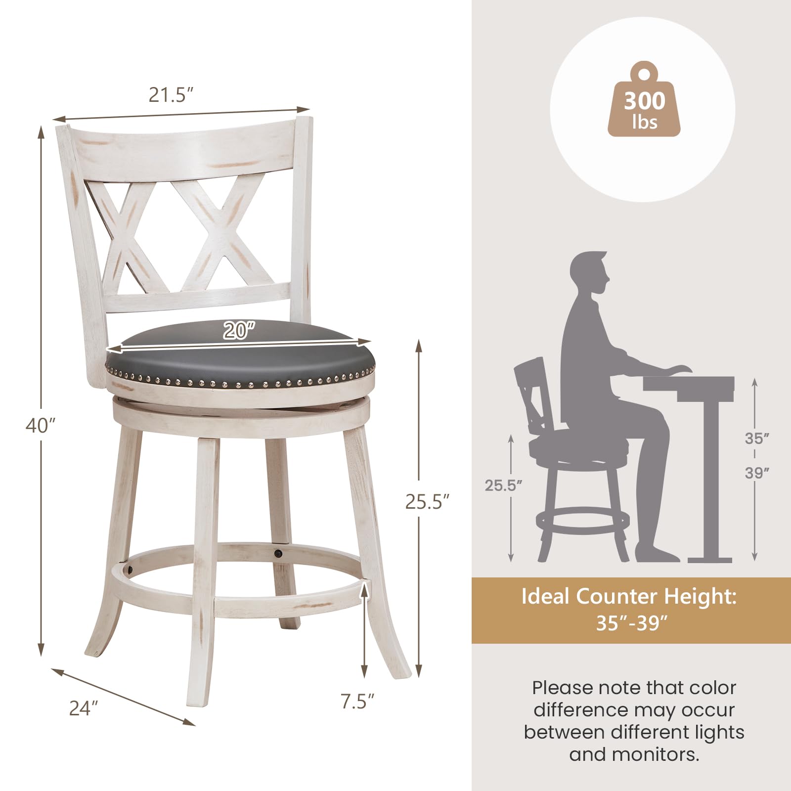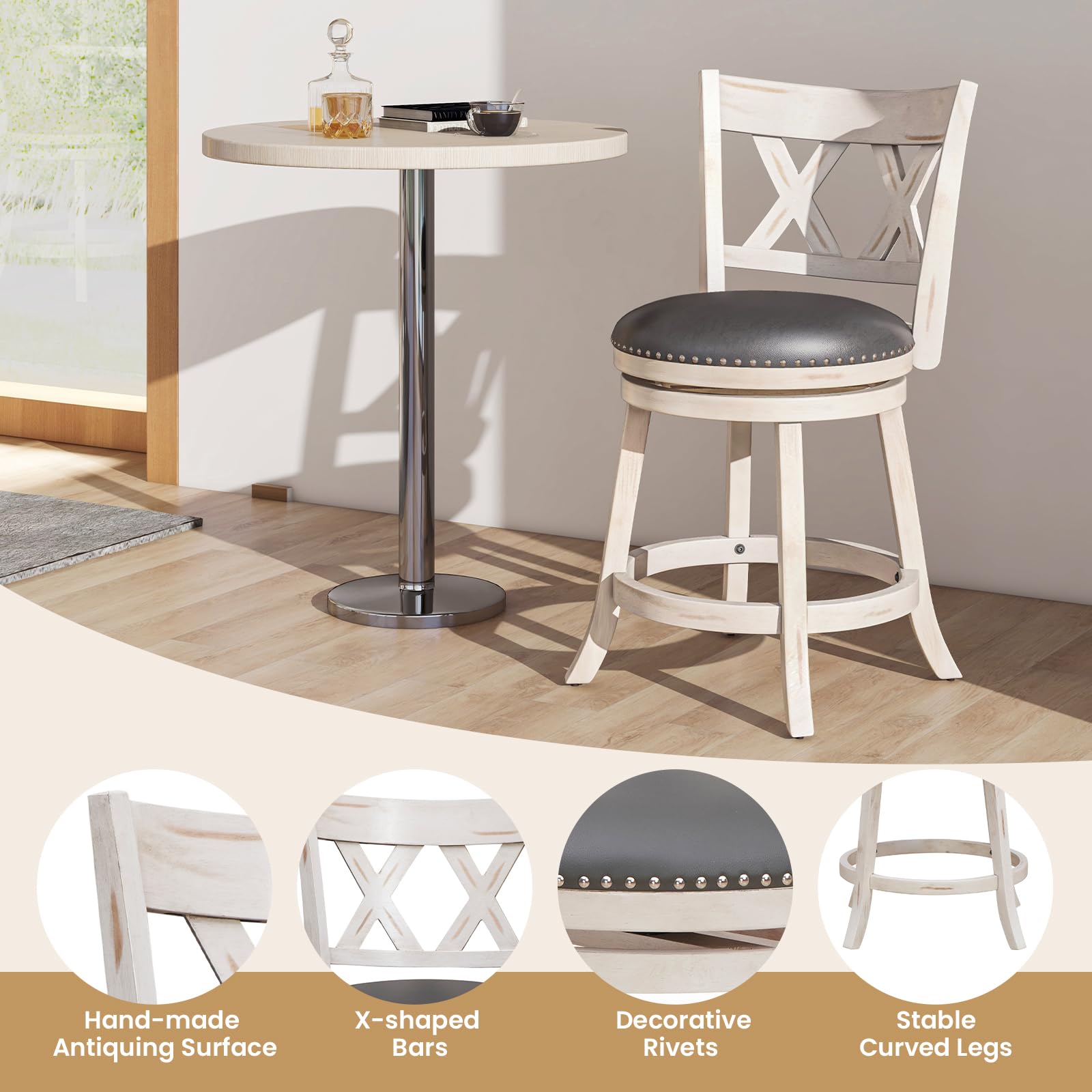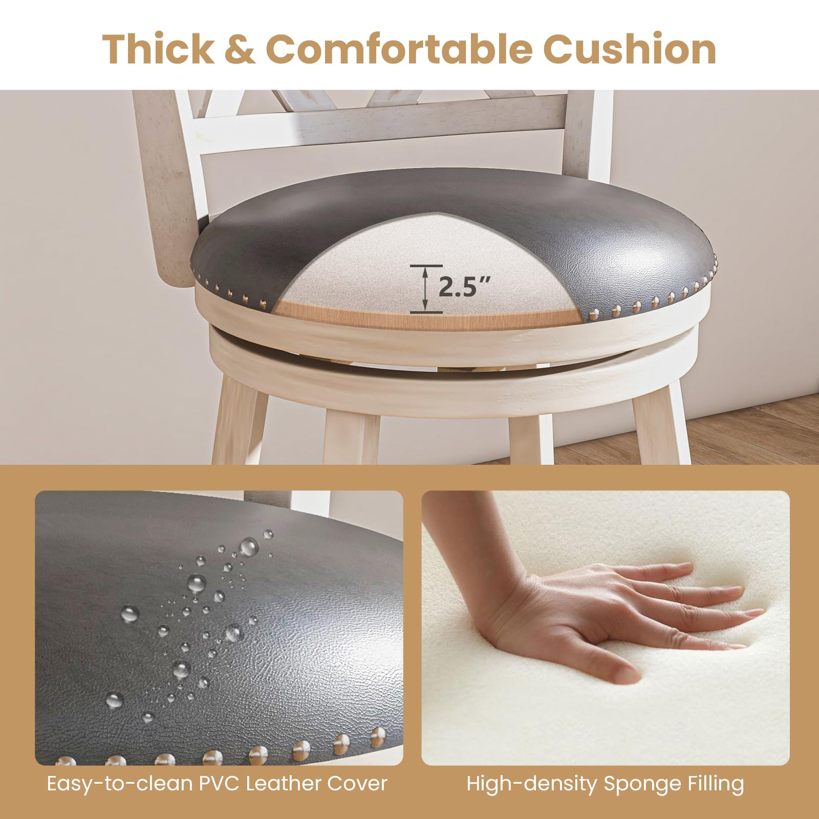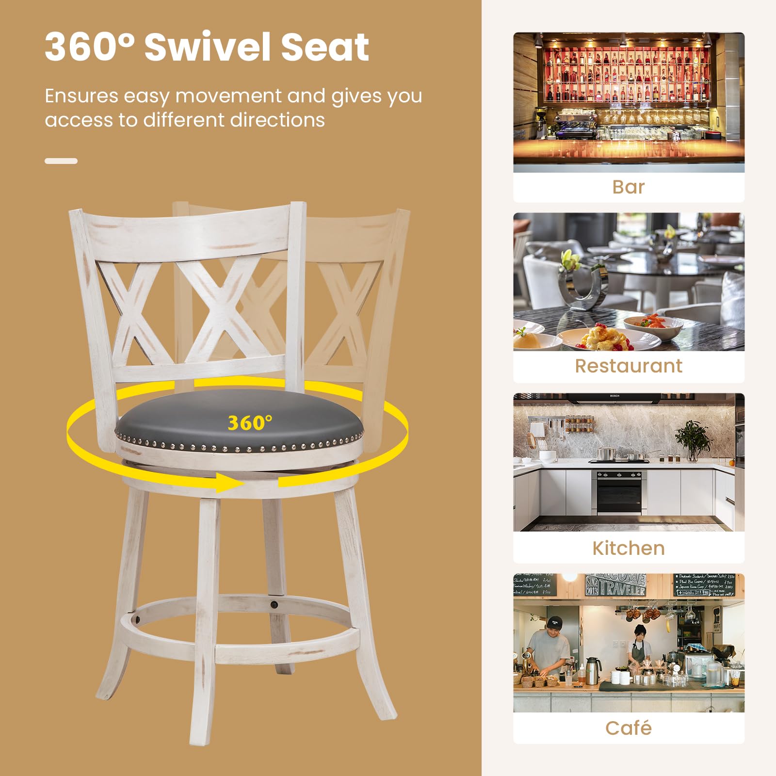 Our swivel stool set of 4 will be the ideal decoration for your home bar or kitchen island. It has hand-antiqued surface, X-shaped design and attractive rivets. And the swivel seat provides a fun alternative to any boring seating and brings more convenience. With curved backrest, upholstered seat and round footrest, it offers you a comfortable sitting experience. Moreover, the premium rubber wood frame makes each stool strong and durable enough to bear a weight up to 300 lbs.
