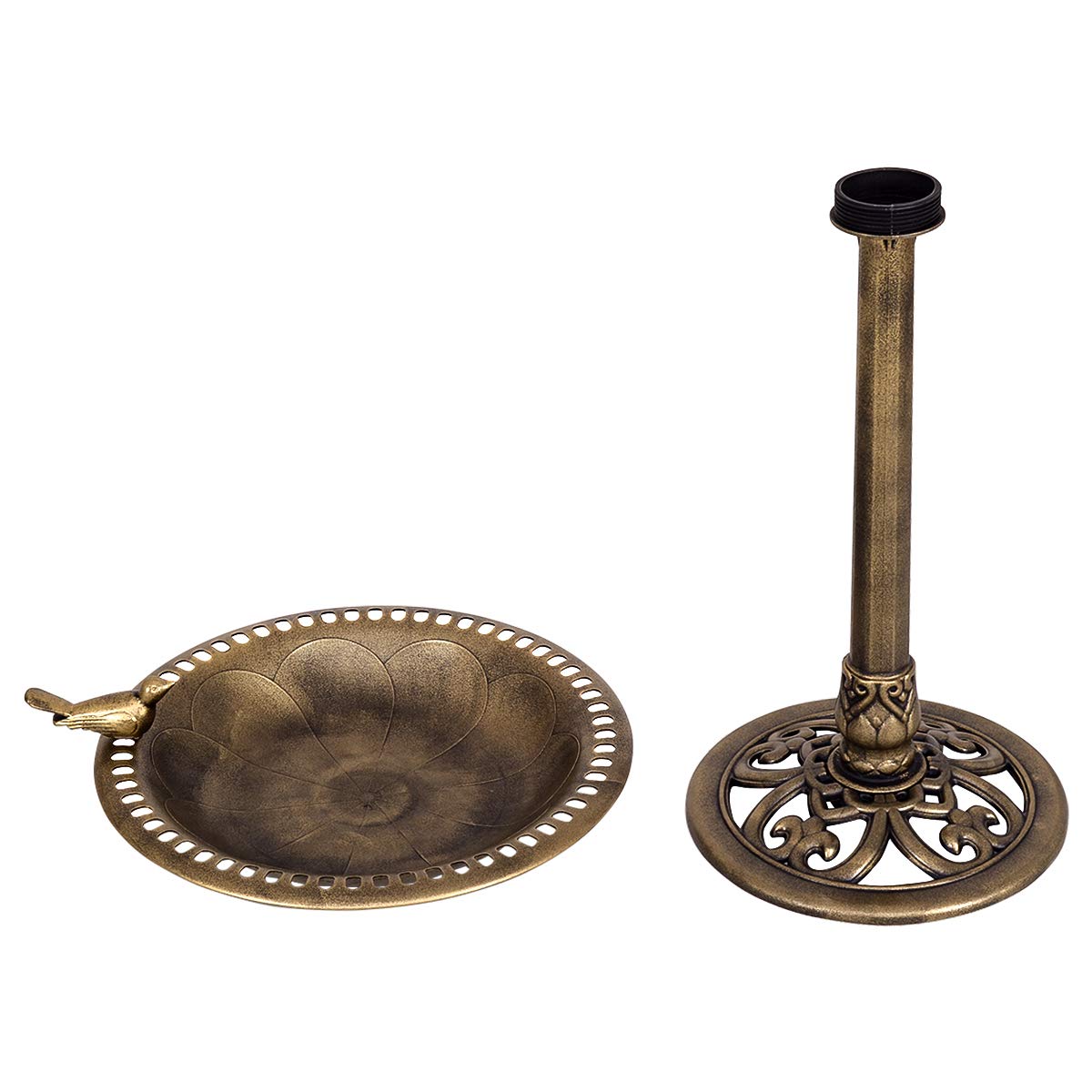 Add a decorative touch to your outdoor living. Often mistaken for metal with its attractive copper verdigris effect this pedestal bird bath is constructed of tough weather and frost-resistant resin! Features decorative Fleur-de- Lys accents, scroll work, and heart-shaped designs on base and hexagonal pedestal. Generously sized bowl is embellished with scalloped shapes inside and out; 2" depth is perfect for allowing smaller birds to bathe. Small rectangular cut-outs along edge of bowl allow birds of all sizes to easily perch. Open design of base allows grass or other surfaces to remain visible. Add weight/stability by filling the center pedestal pole and base with sand or water. Hexagonal center pedestal cleverly threads into base and bowl sections for easy no tool assembly. Three ground stakes provided for additional stability.