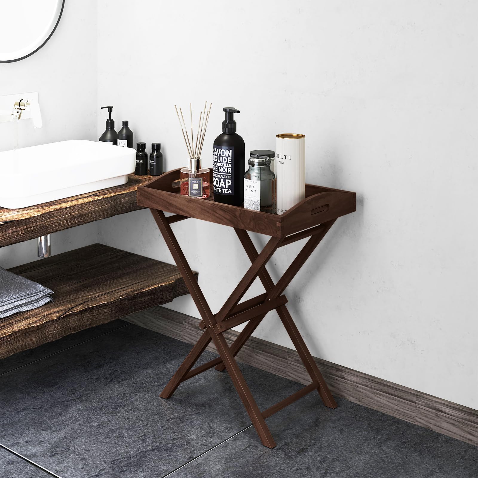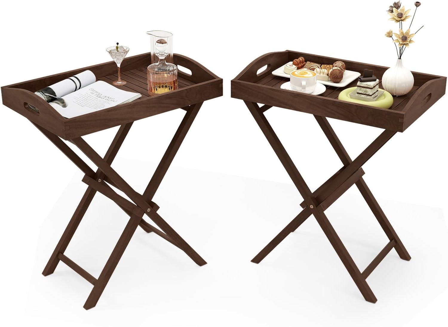 Upgrade your living space with our premium teak wood foldable tray table. Flaunting a chic design with rich wood grains, this bistro table not only adds a touch of sophistication but is built to last. Perfect for small spaces, its foldable functionality means you can stow it away easily, or set it up in seconds for guests. The removable tray, enhanced with sleek handles, makes serving effortless and stylish. With a formidable strength to hold up to 150 lbs, it's ideal for any occasion - be it a cozy morning coffee or an elegant side table for your living room. Make it yours and enjoy maximum convenience!