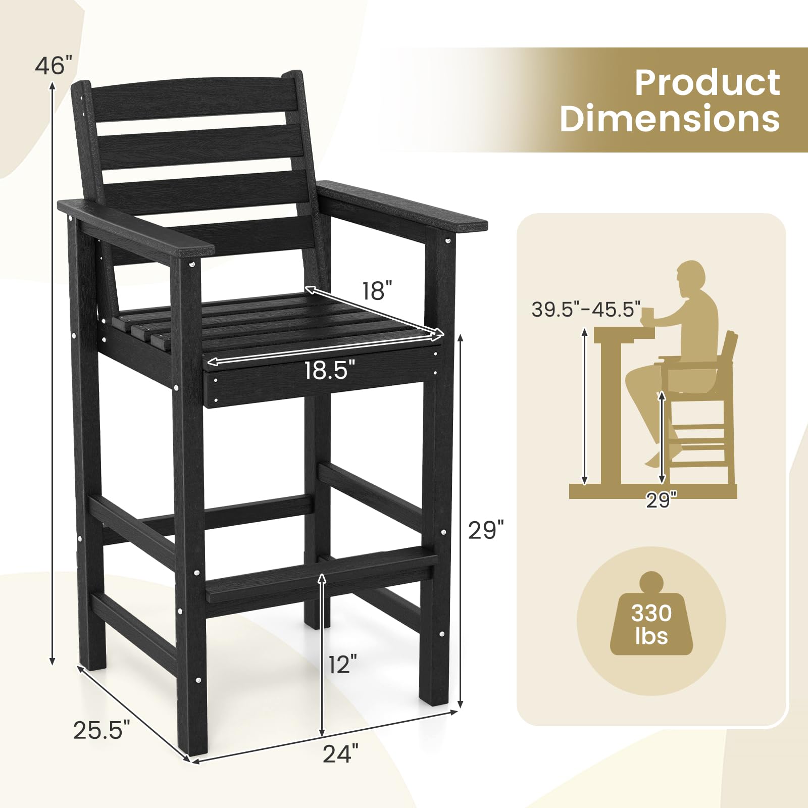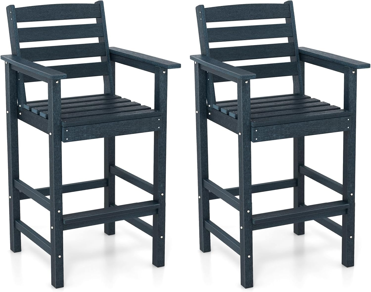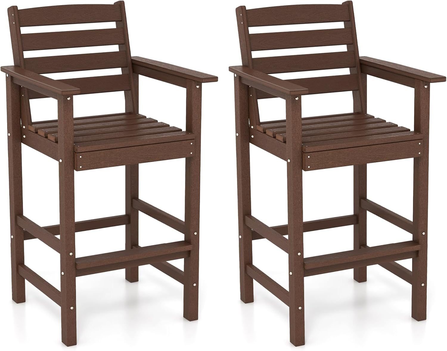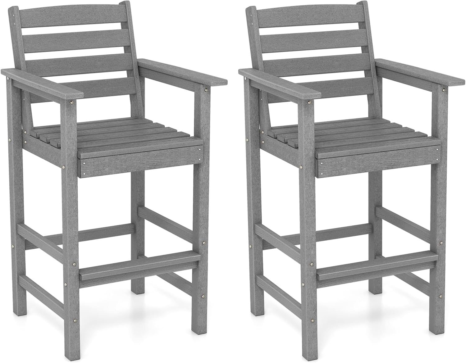 Transform your outdoor space with our premium set of 2 HDPE bar stools! Crafted for outdoor living enthusiasts, these high top patio chairs are made from high-quality HDPE material and feature rust-resistant stainless steel screws, ensuring daily use without fading or damage. Designed for comfort and style, they boast Adirondack-style backrests, wide armrests, and footrests for optimal relaxation. The faux wood grain finish adds a touch of nature to any environment, making them a versatile choice for both home and public settings. Ideal for use with tables ranging from 39.5” to 45.5” high, these bar height chairs will elevate your outdoor seating area with both functionality and style. Upgrade your outdoor decor with these outdoor bar stools today!