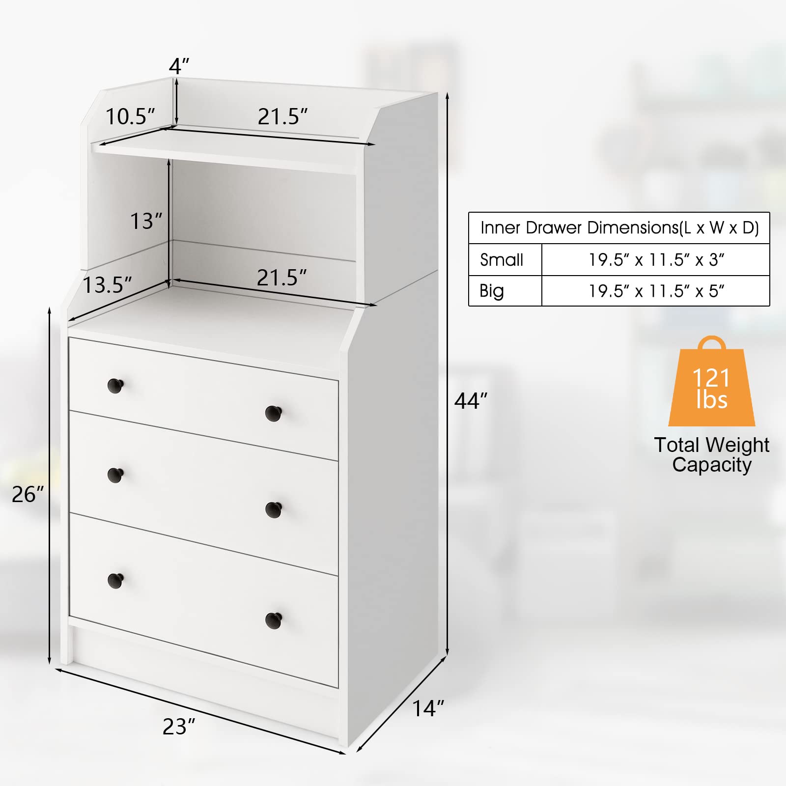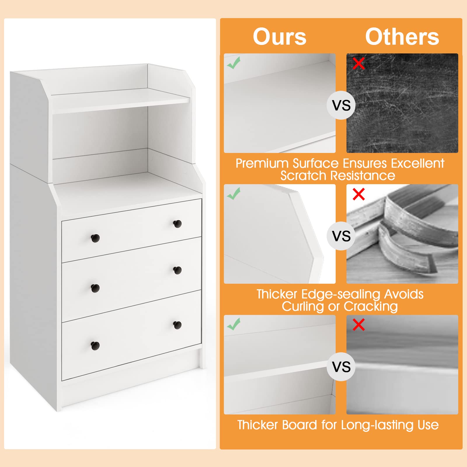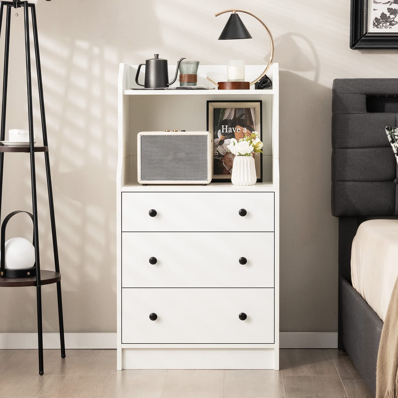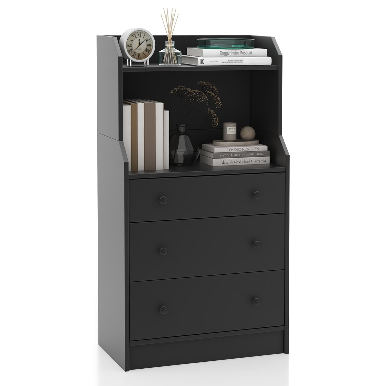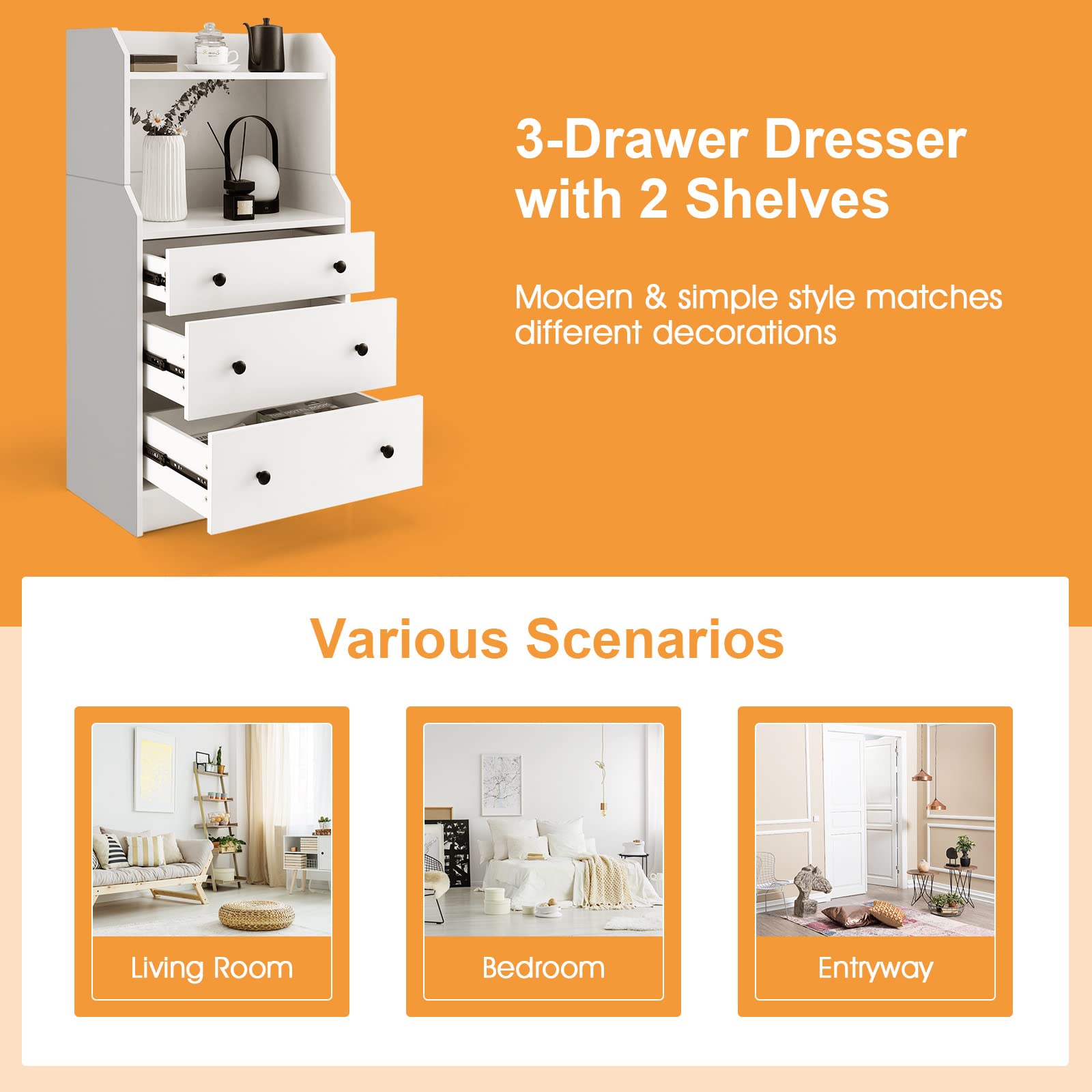 Are you looking for a versatile dresser to expand your storage space? Well, look at this 3-drawer dresser with 2 shelves. With an additional open shelf, the floor cabinet not only accommodates unsightly sundries, but also is suitable for displaying ornaments or holding some grab-to-go items at the entryway. And with modern appearance and functional design, it will be more than a storage organizer, but a decorative piece to accent your taste! What’s more, equipped with anti-toppling device and non-slip foot pads, you don’t have to worry about the storage dresser being wobbling or tipping over. In all, you must be glad to have this tall dresser in your home!