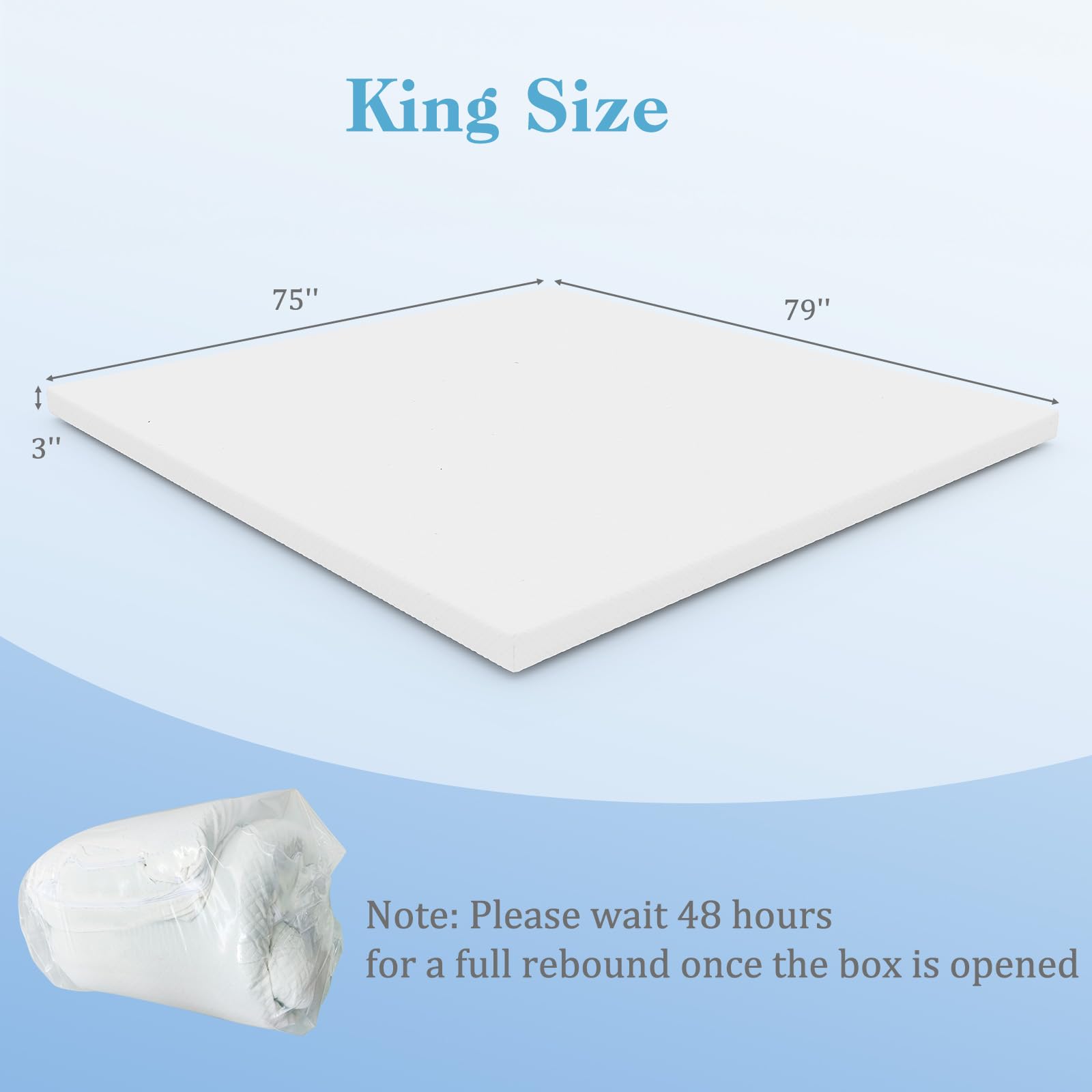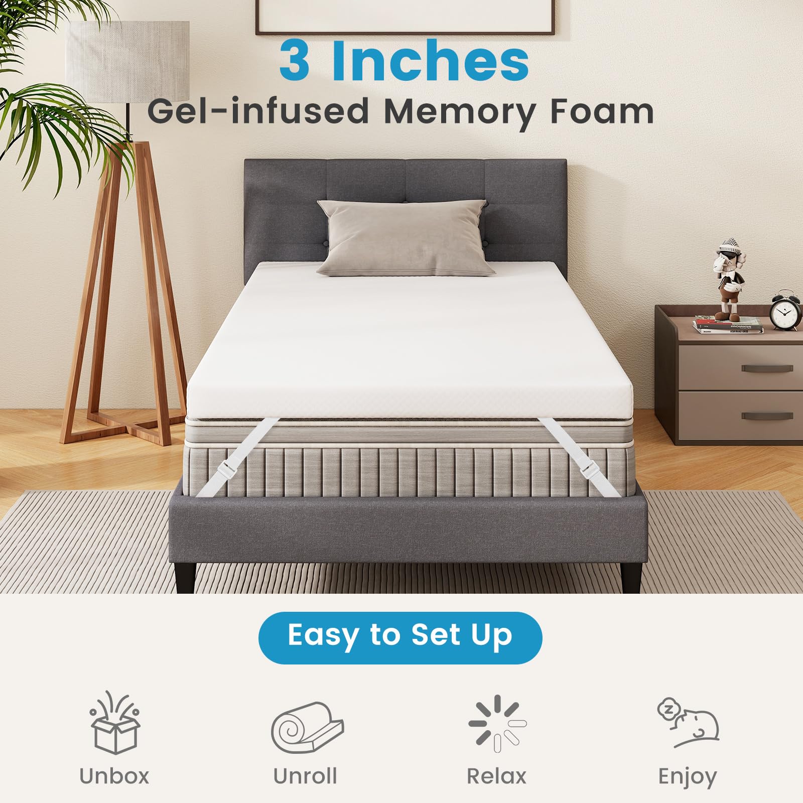 Upgrade your sleep experience with our 3-inch gel-infused memory foam mattress topper, designed for both comfort and convenience.