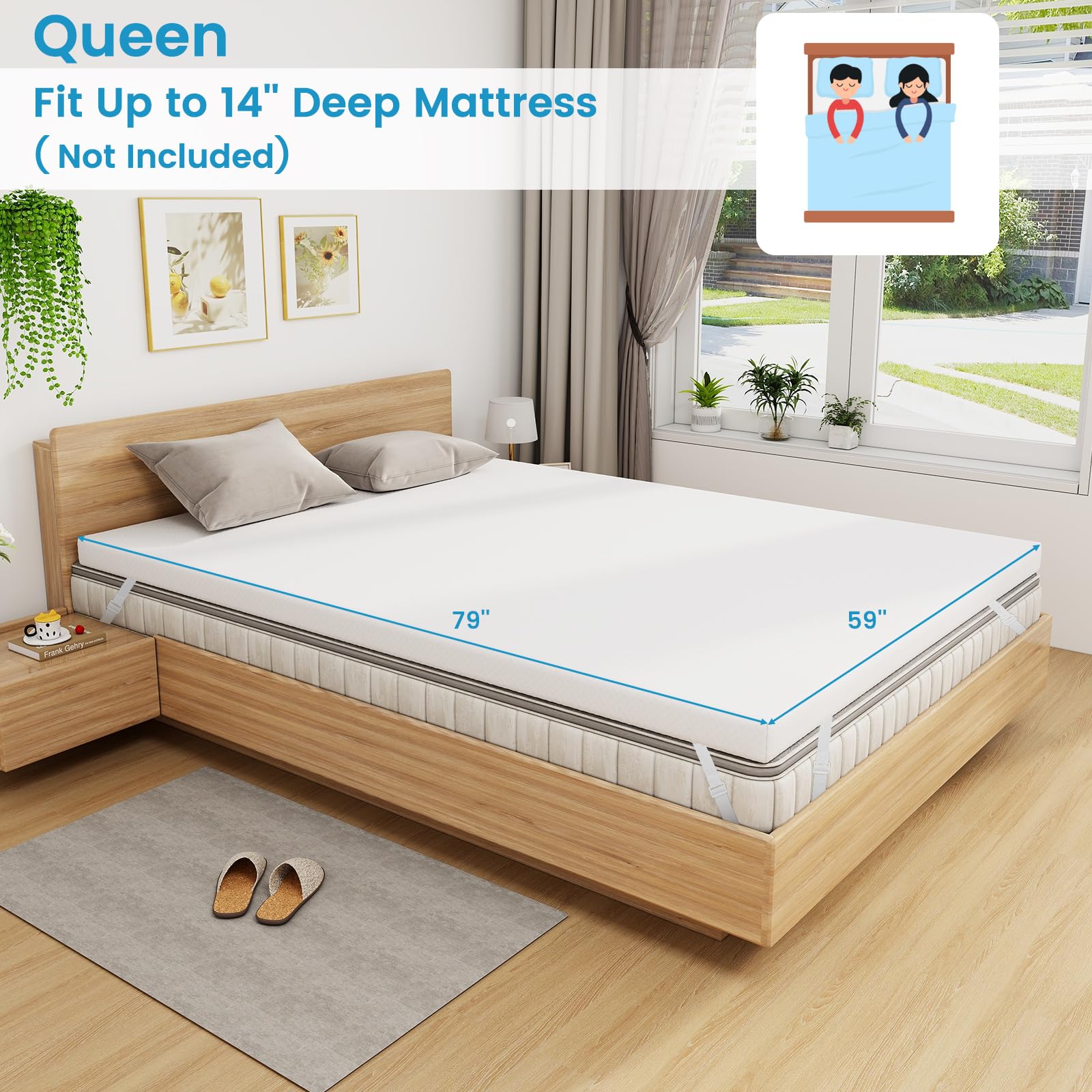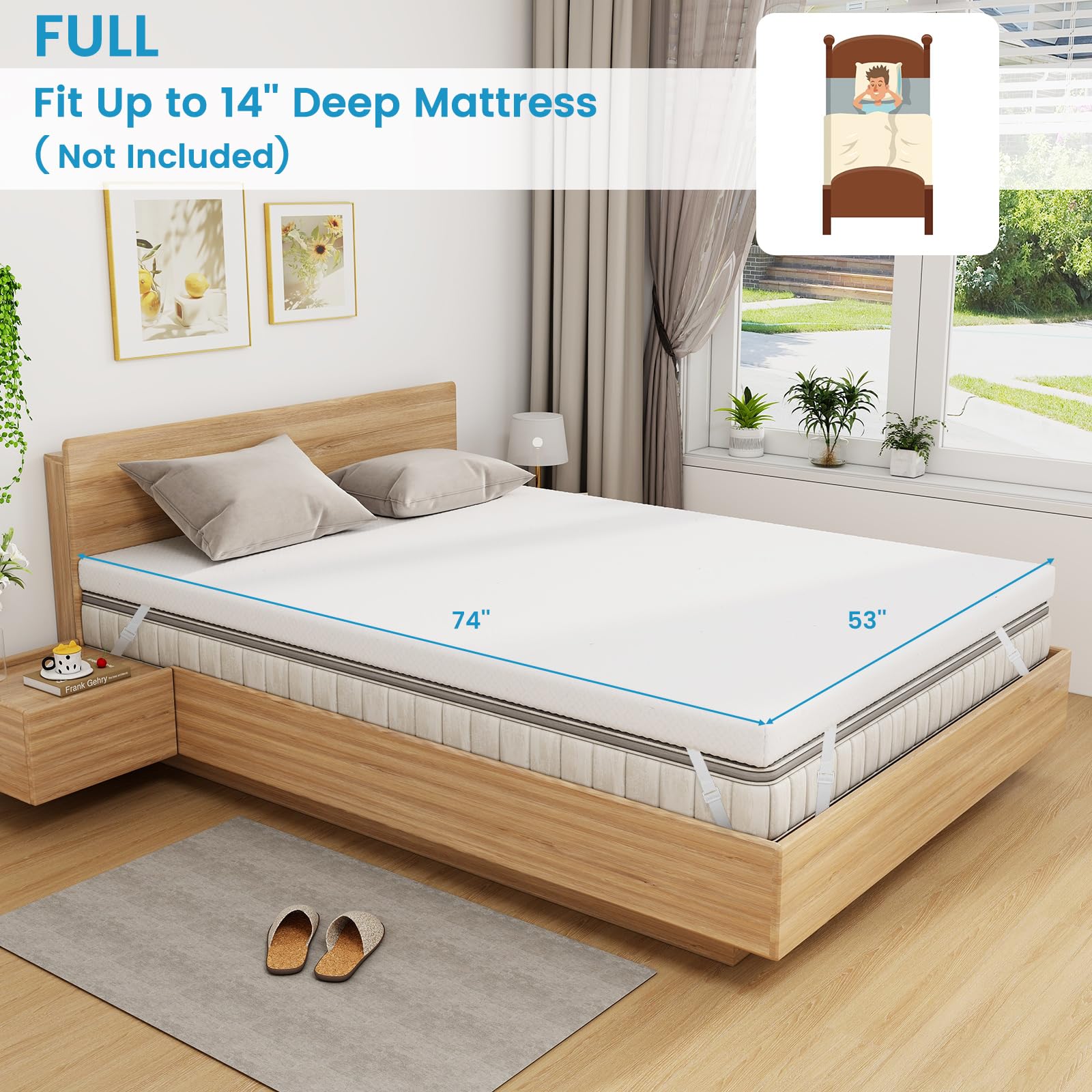 With a gel-infused memory foam layer, this bed topper reduces heat and enhances comfort. It evenly distributes body weight, alleviates pressure points, and relaxes muscles. Moreover, this mattress pad includes a zippered, machine-washable cover for easy maintenance, keeping your sleeping environment clean and fresh. The adjustable elastic straps and an anti-slip bottom securely hold the topper in place, eliminating any movement during the night.