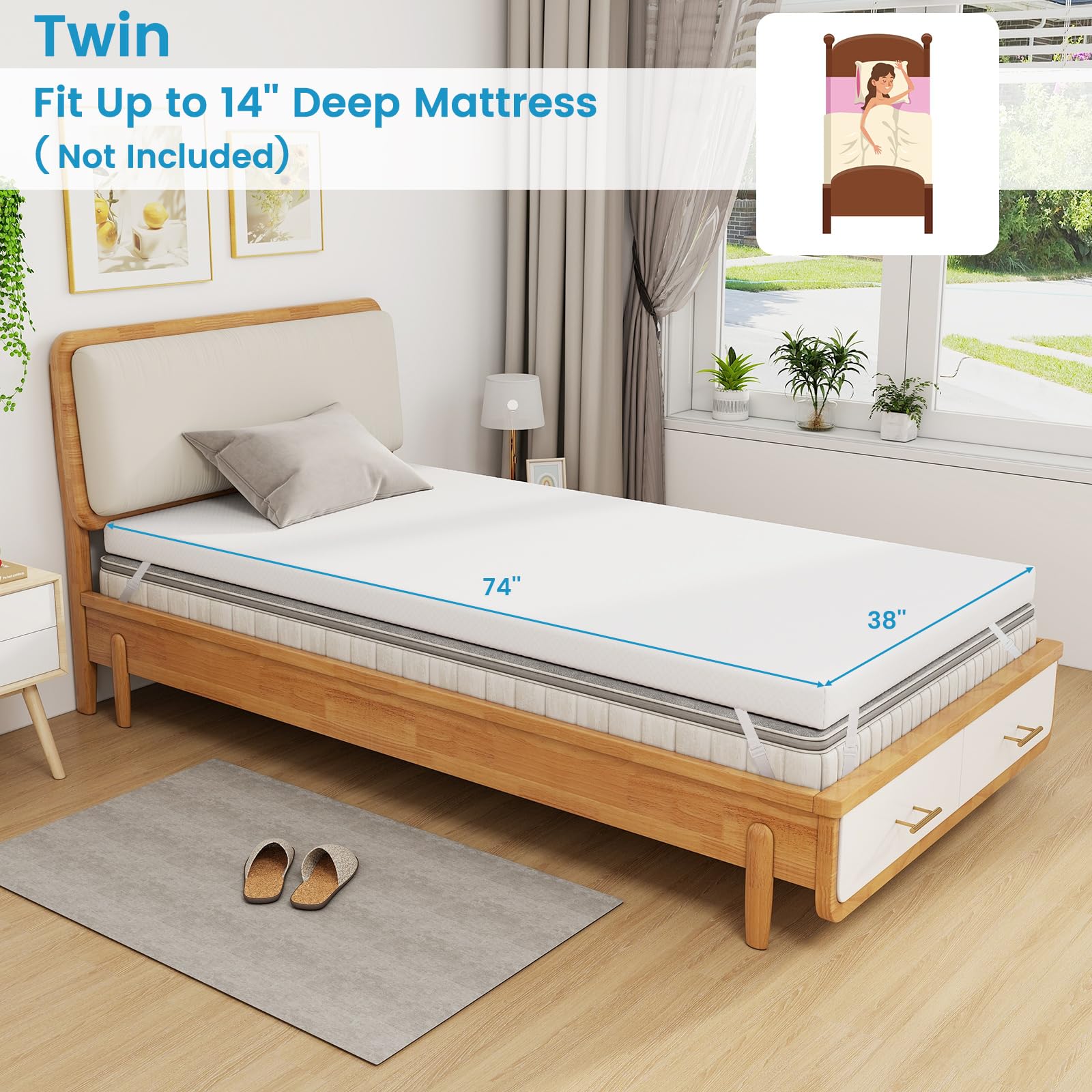 The adjustable elastic straps make it fit up to 14" deep mattress (not included)