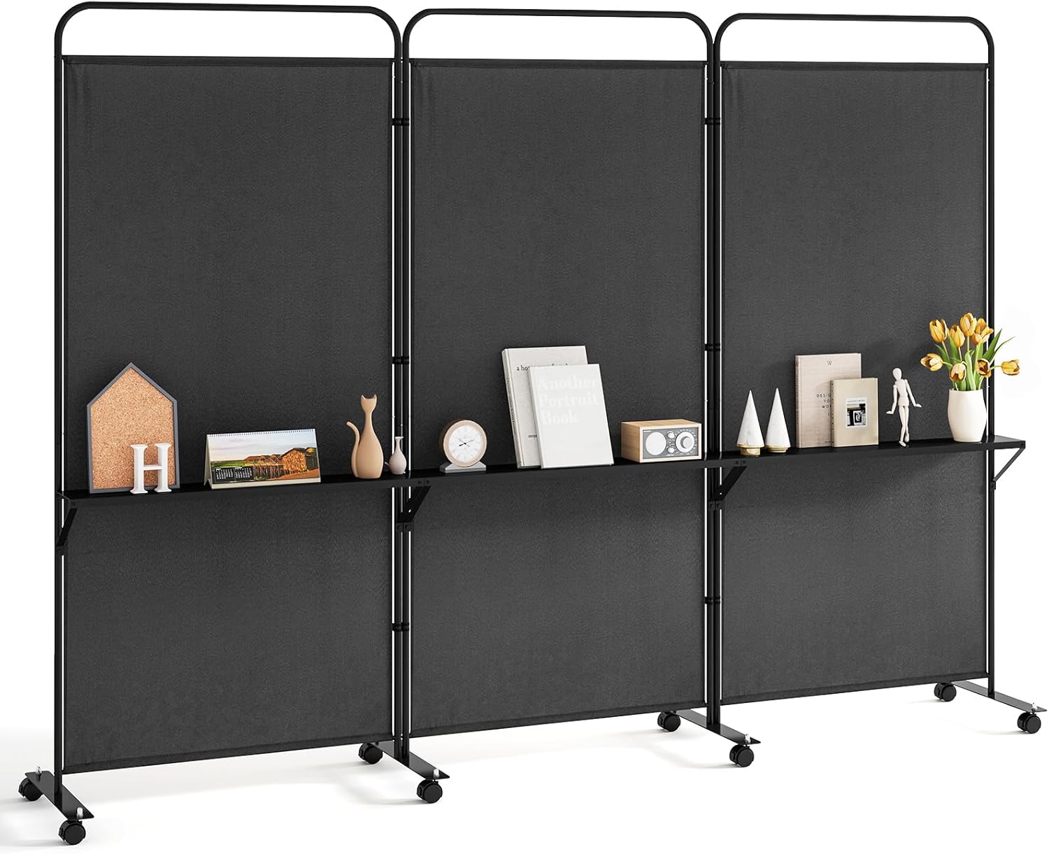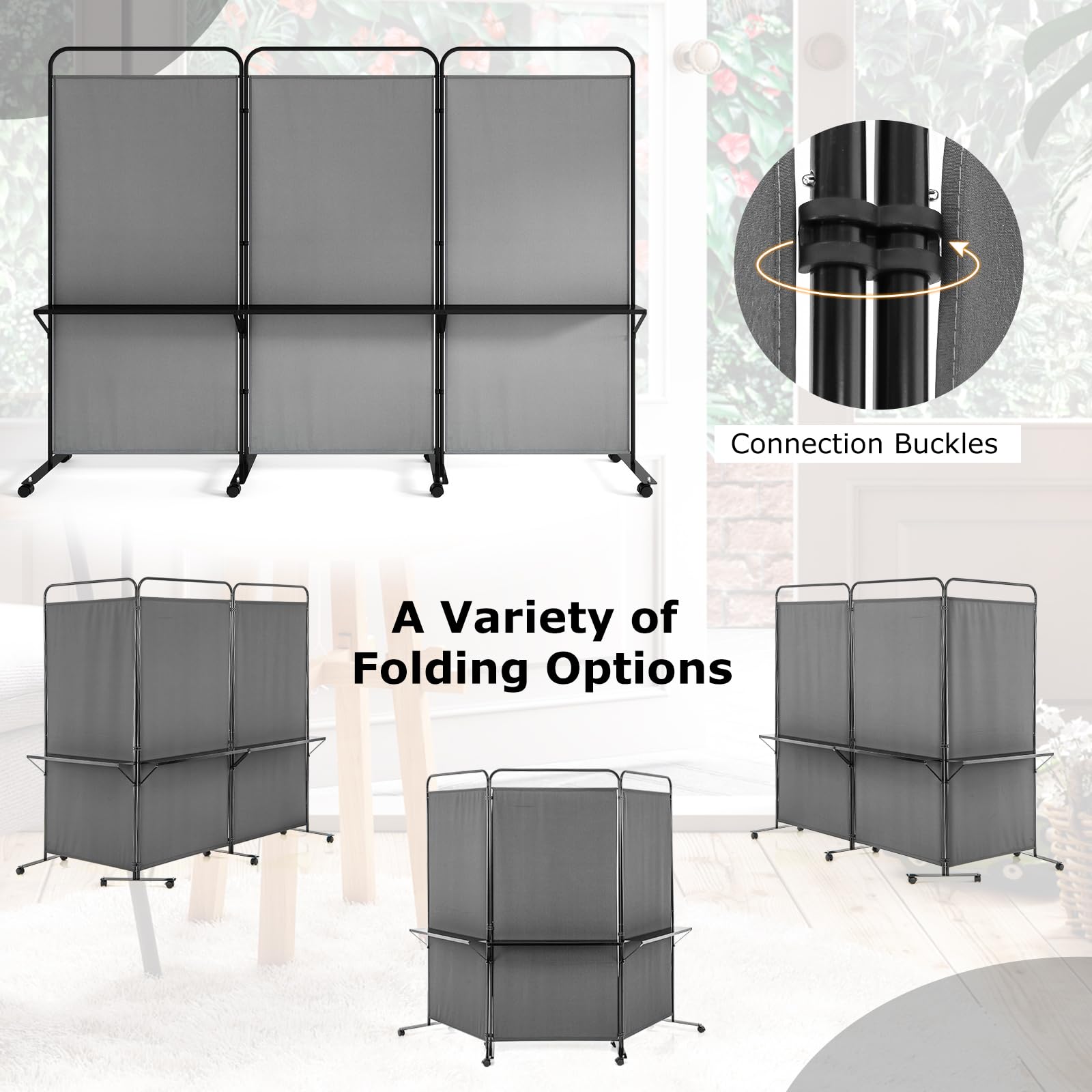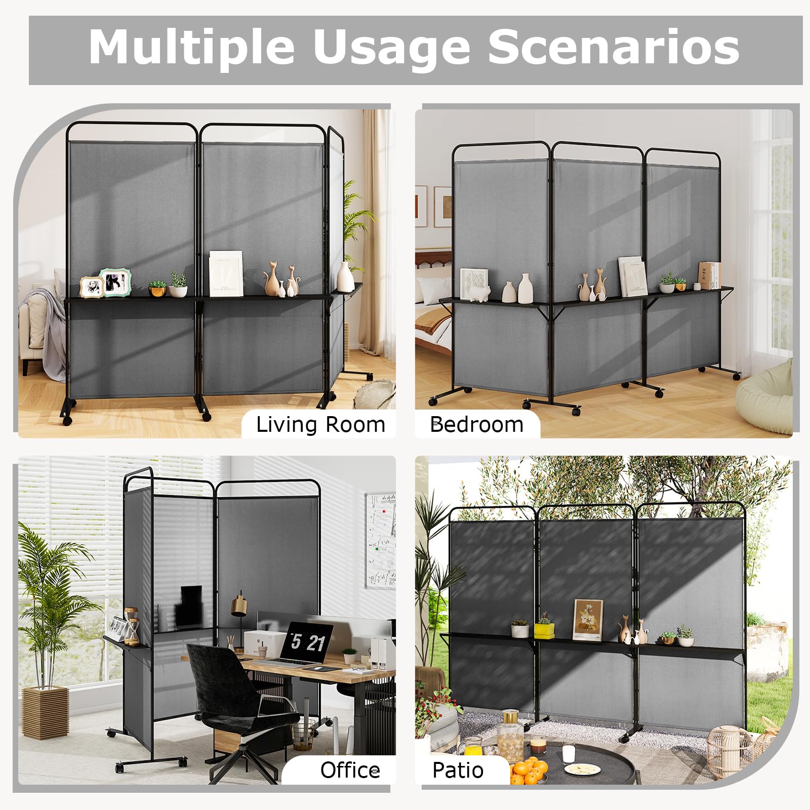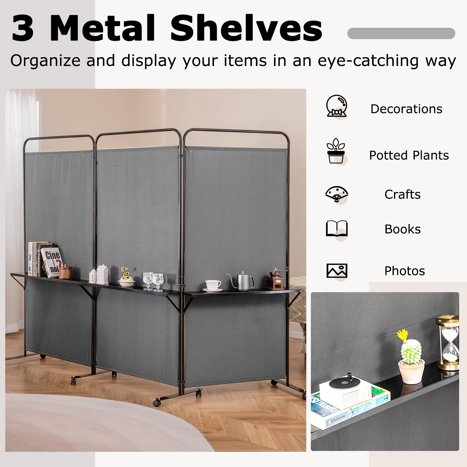 Transform your space effortlessly with this versatile 3-panel room divider. Designed for both privacy and organization, it features three sturdy metal shelves to neatly display and store your essentials. The high-quality polyester fabric offers a soft yet durable touch while ensuring full coverage and easy maintenance. Built with a powder-coated metal frame, this partition ensures long-lasting use. With lockable wheels for stability and smooth movement, you can adjust your space seamlessly. Plus, the 180° swivel hinges allow for flexible folding options, making it easy to create a private and functional area anywhere in your home or office.