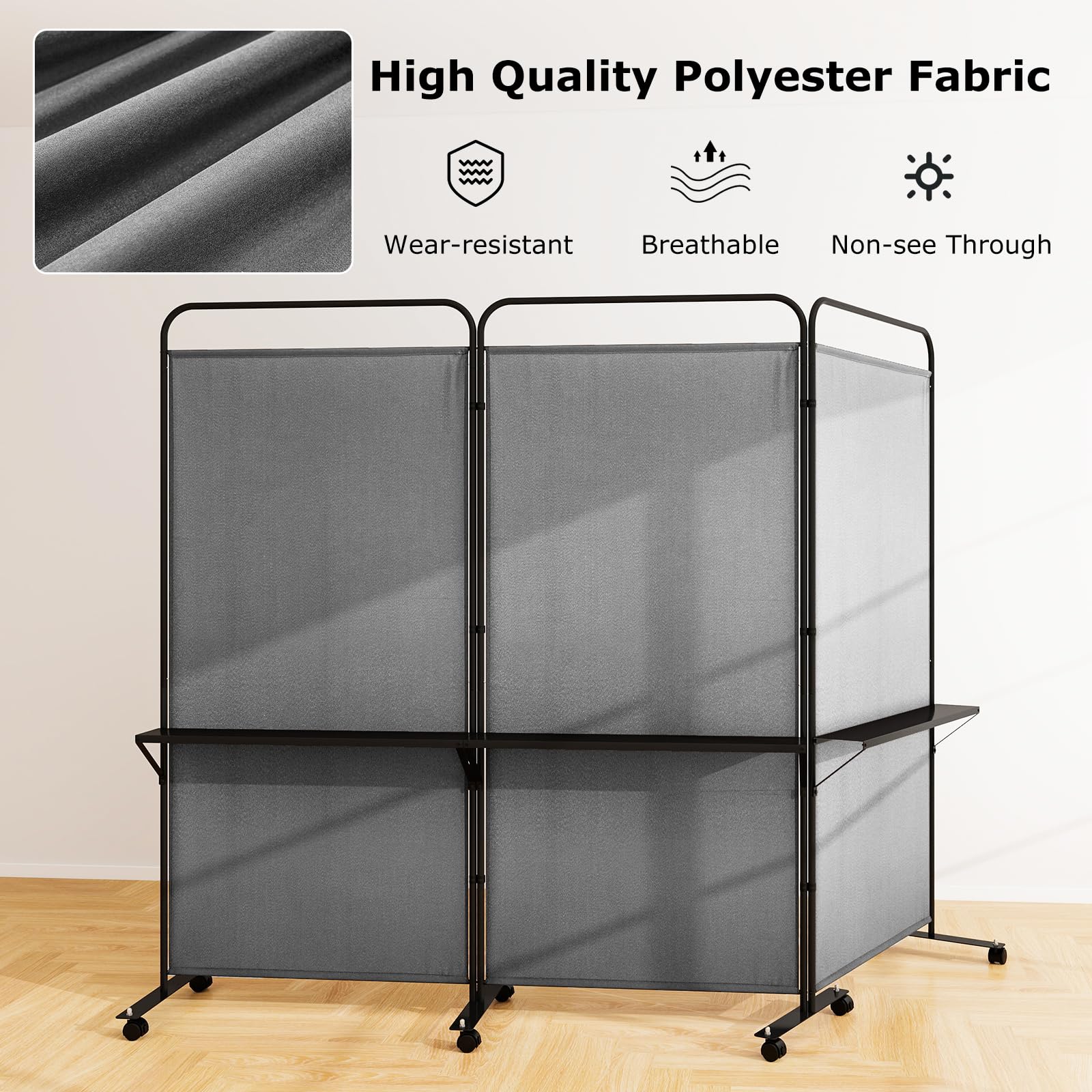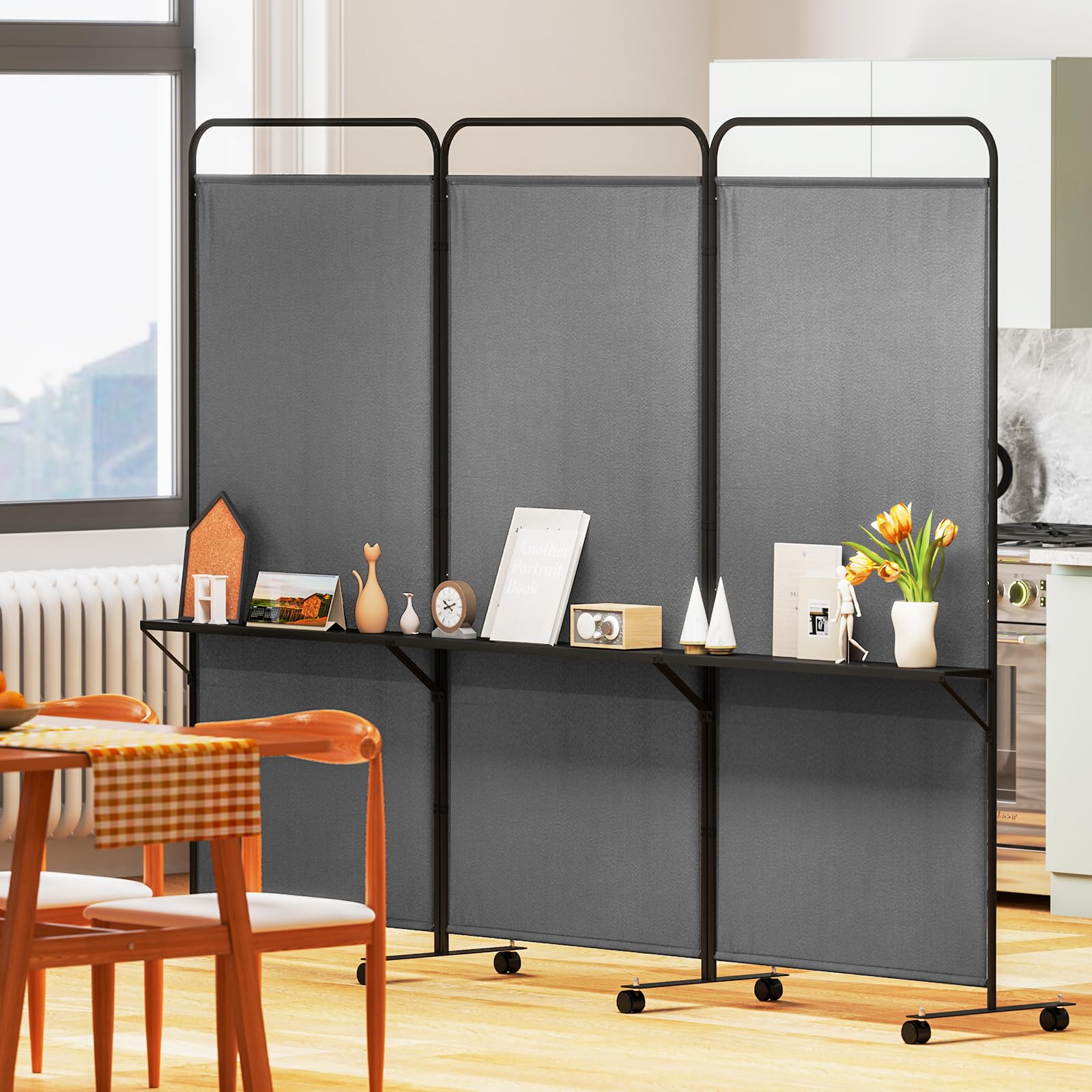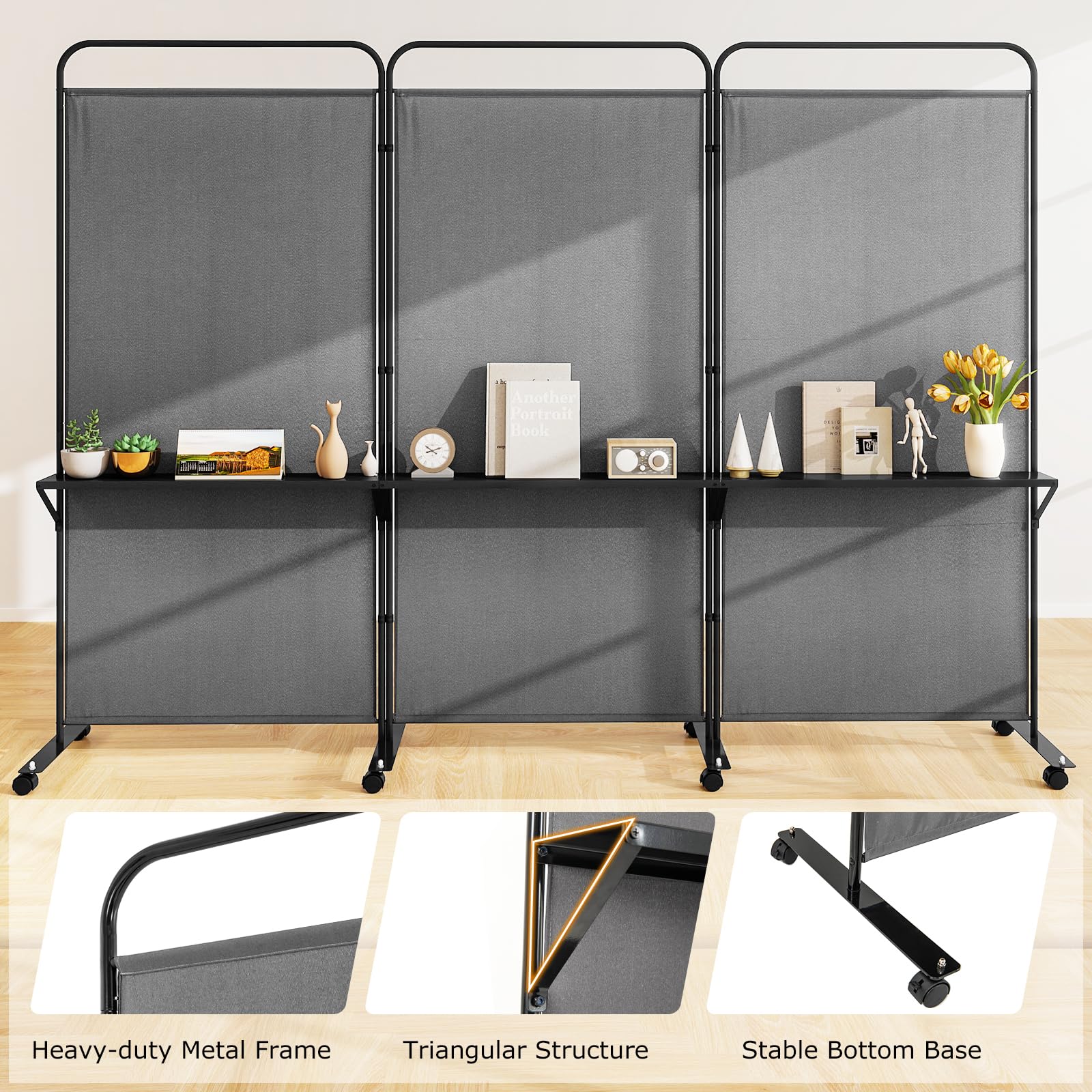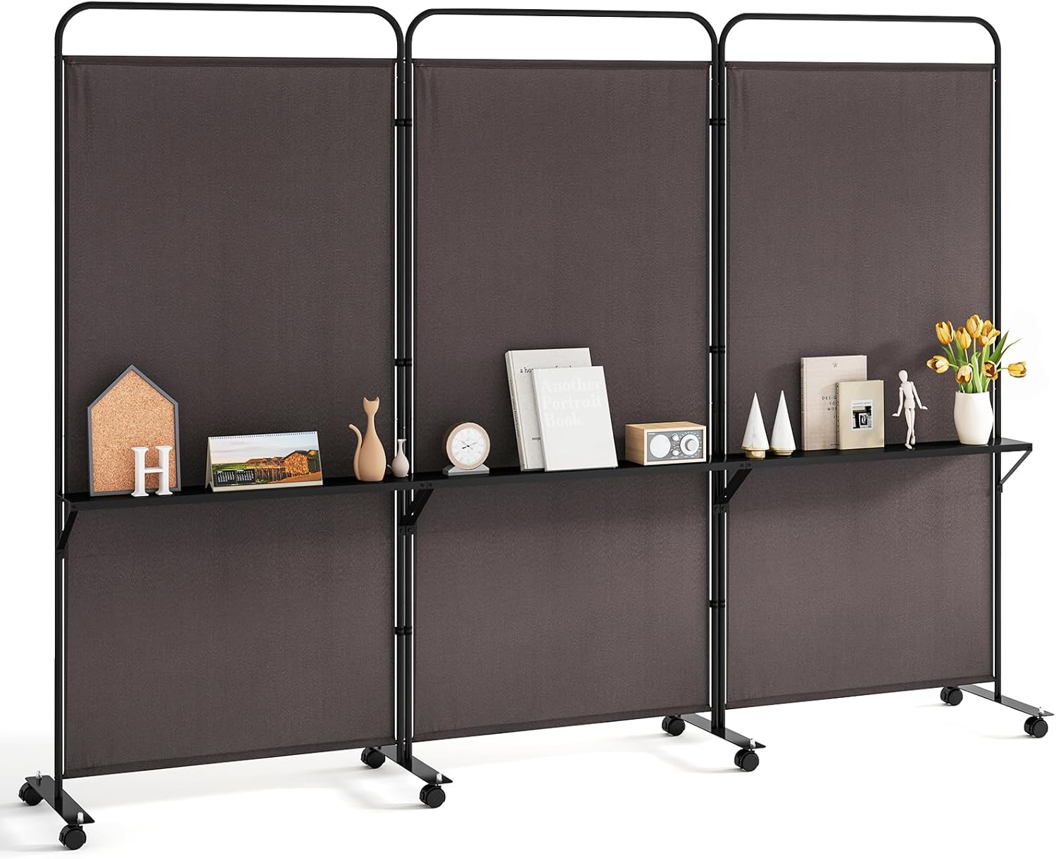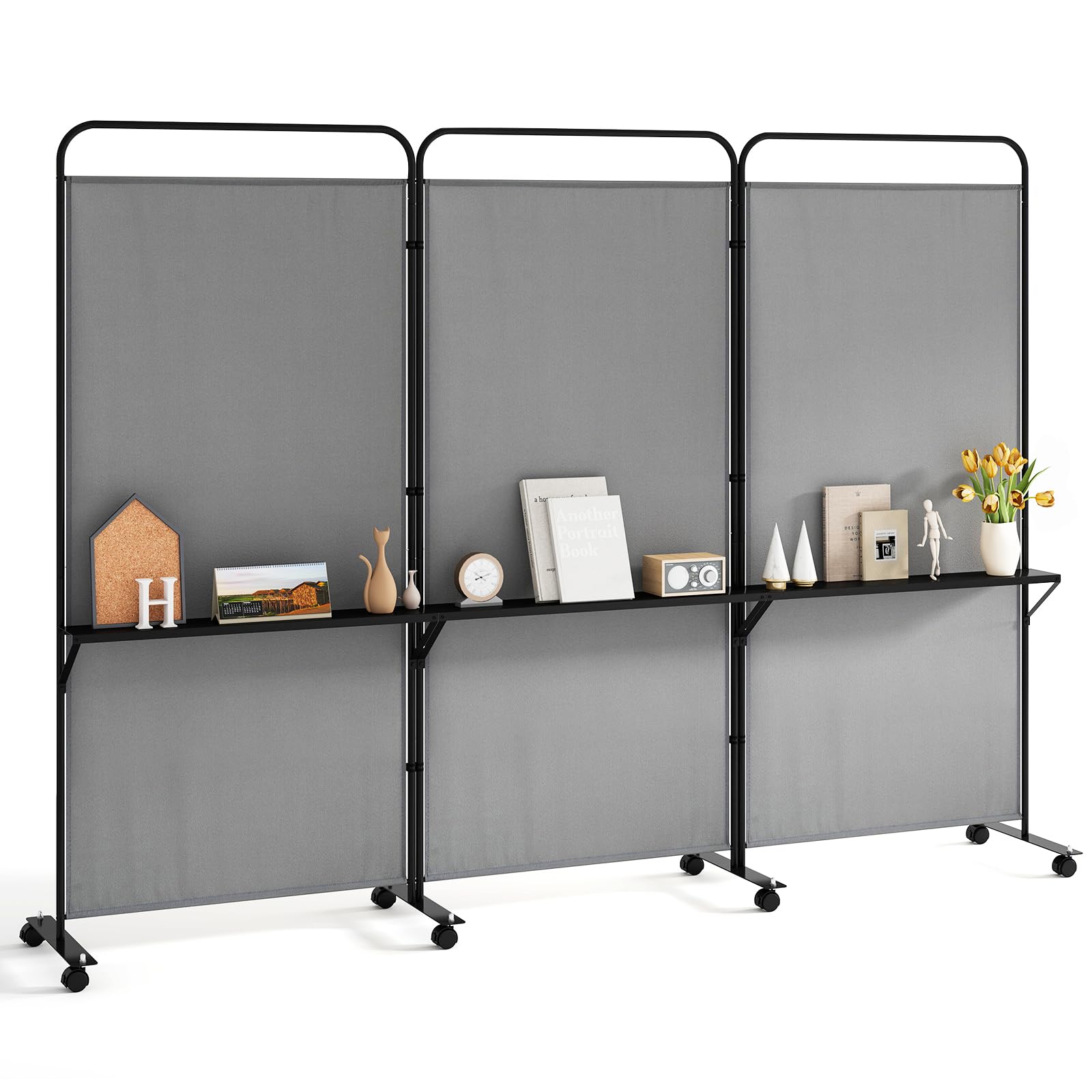 Transform your space effortlessly with this versatile 3-panel room divider. Designed for both privacy and organization, it features three sturdy metal shelves to neatly display and store your essentials. The high-quality polyester fabric offers a soft yet durable touch while ensuring full coverage and easy maintenance. Built with a powder-coated metal frame, this partition ensures long-lasting use. With lockable wheels for stability and smooth movement, you can adjust your space seamlessly. Plus, the 180° swivel hinges allow for flexible folding options, making it easy to create a private and functional area anywhere in your home or office.