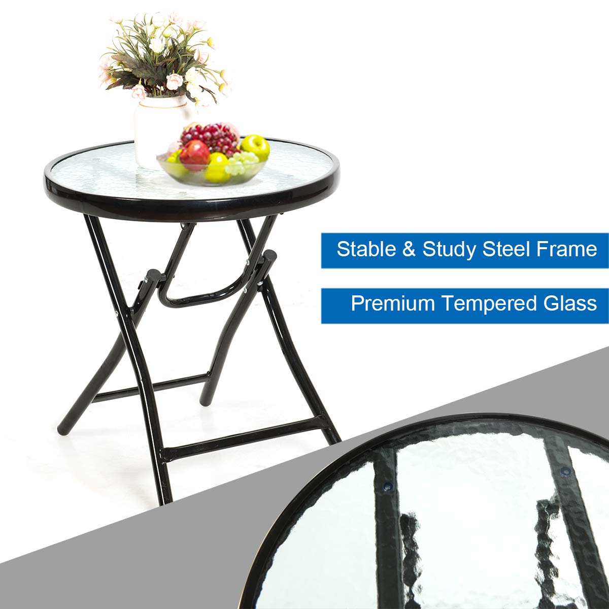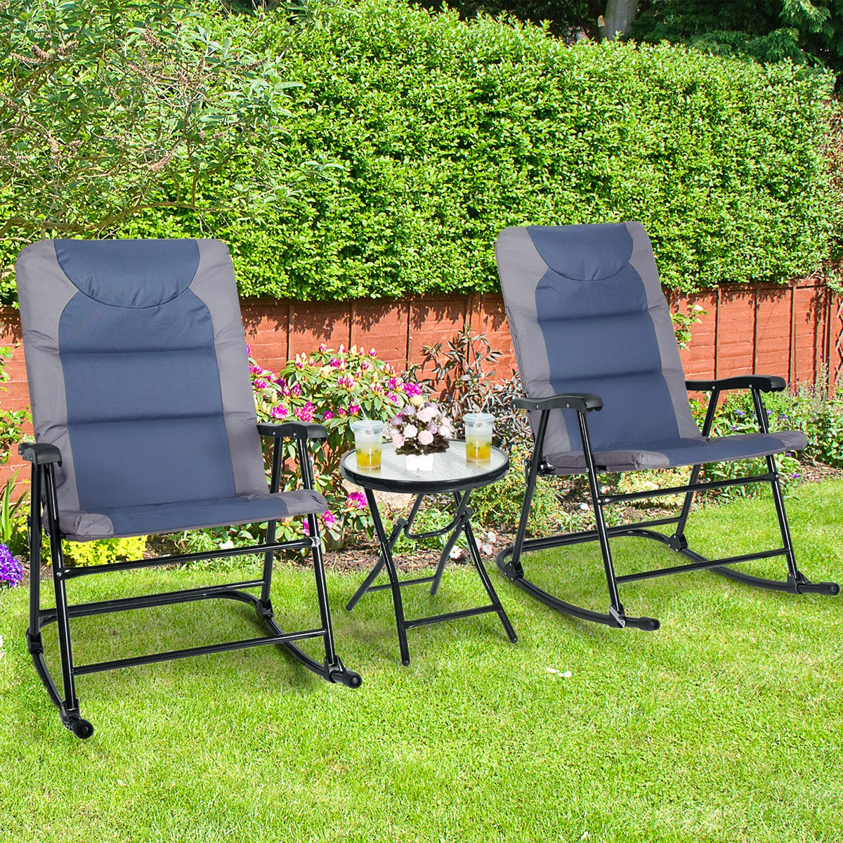 The combination of 2 rocking chairs and 1 glass coffee table can make a great addition to your patio or deck. Unlike ordinary chairs, our chairs come with added rocking feature can provide you with more relaxed experience. Solid steel construction and premium PVC fabric ensure long lasting durability. The coffee table comes with tempered glass is perfect for holding drinks or wine. The thick padded cushion, backrest and headrest offer optimum comfort. Equipped with locking pins, the chairs will be more stable to ensure your safety during using. You can also bring this outdoor furniture set with you when you go out for camping. This fabulous folding rocking chair and table set will make your outdoor life more relaxed and enjoyable.