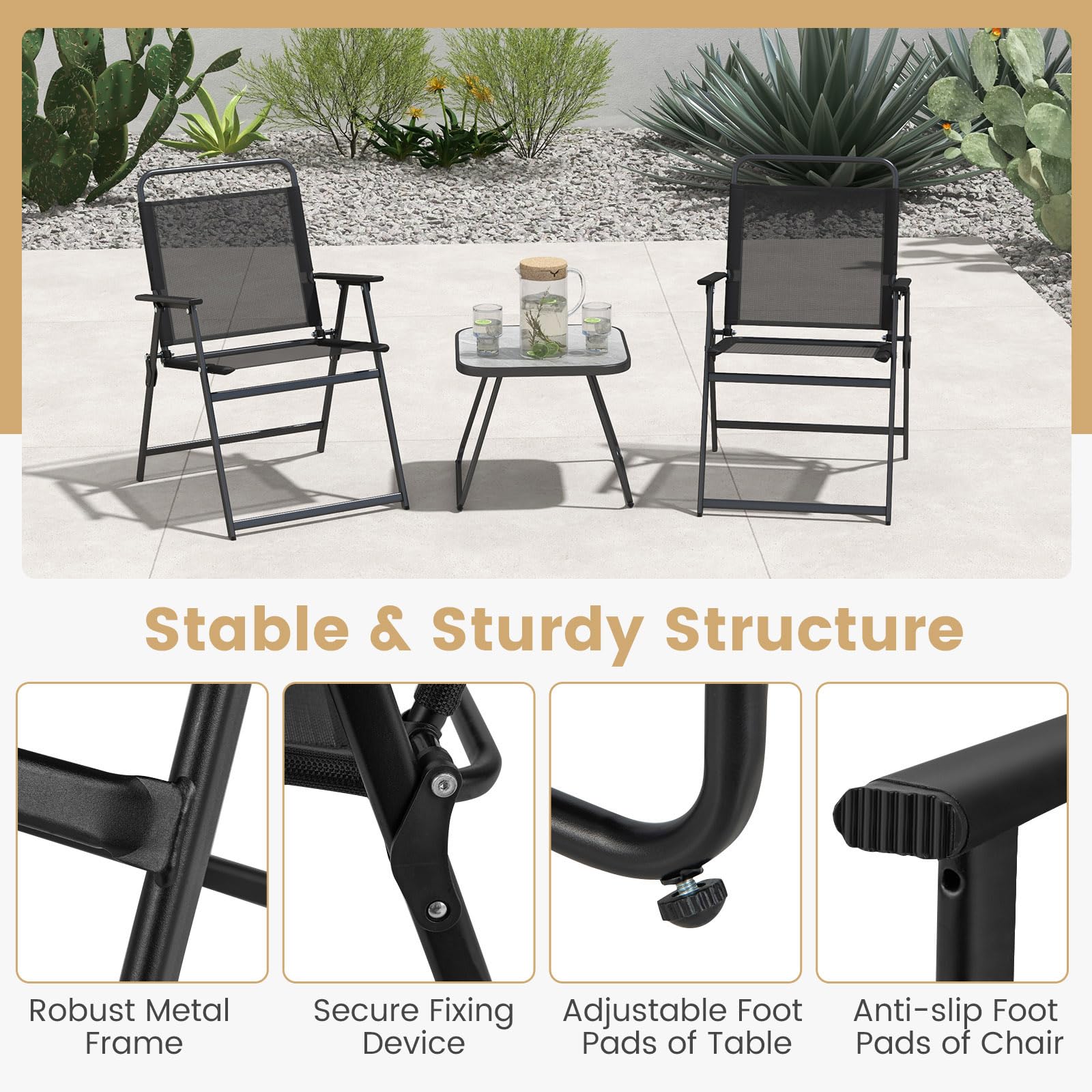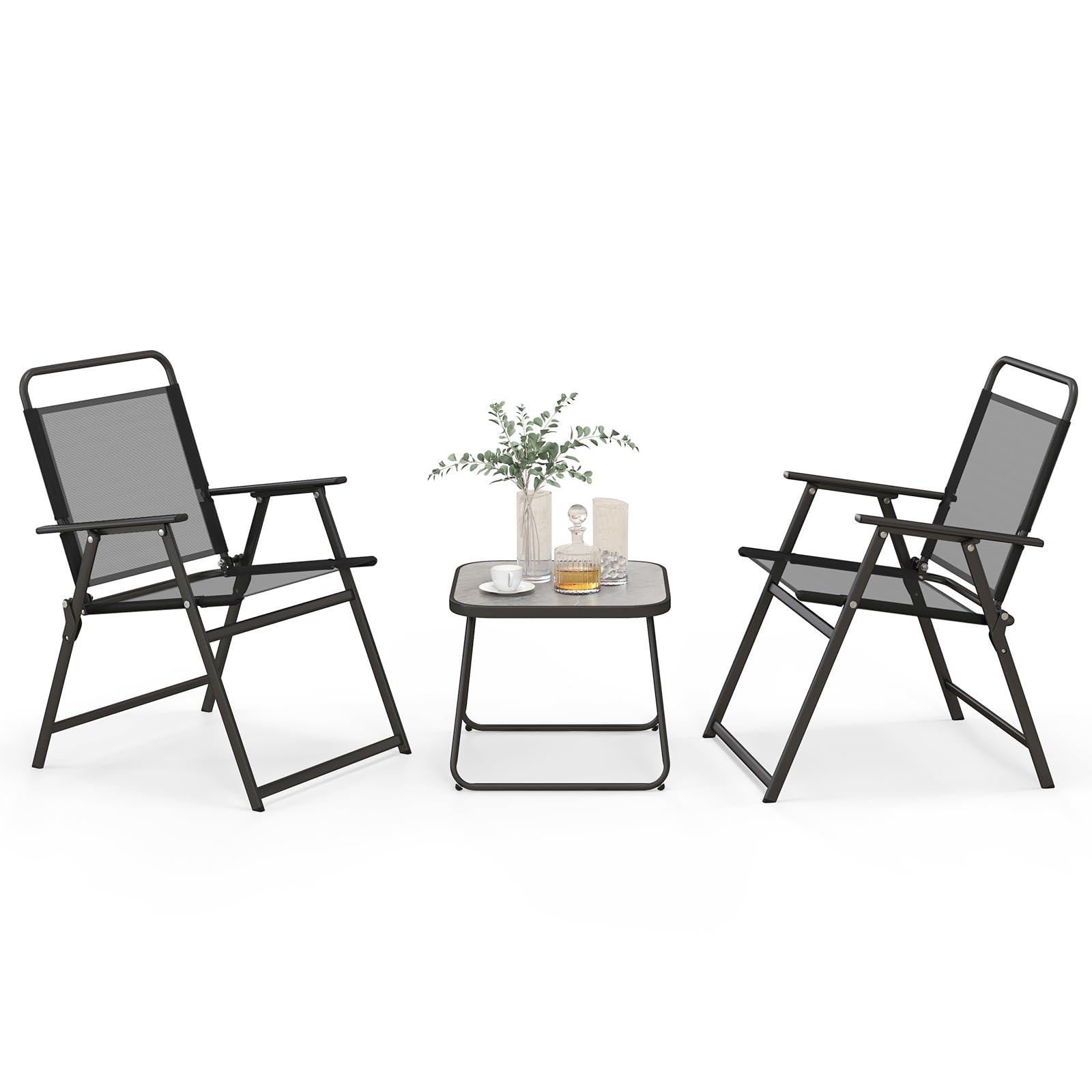 - [Multi-scene Application]: This outdoor conversation set includes 2 folding chairs and a coffee table, creating a relaxing place for you and your friends. With a sleek appearance and modern design, the 3-piece bistro set blends well into your balcony, yard, deck, and poolside.
