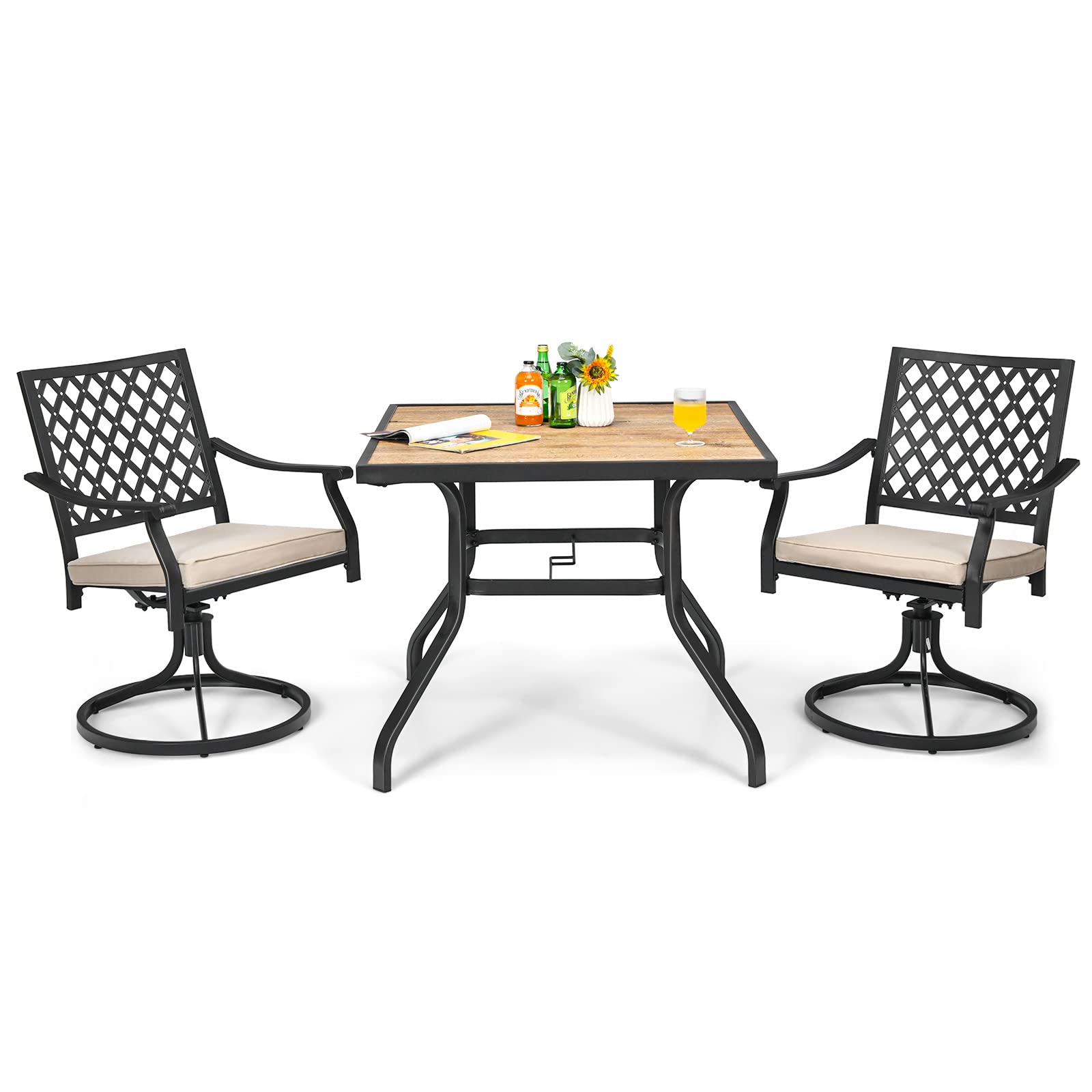 Both the table and chairs are constructed of heavy-duty steel frame, ensuring the super high stability. And the well-coated surface highly prolongs the service life. In addition, the ergonomic seat with rocking and swiveling functions offers you endless comfort. And the cozy cushions filled with high-density sponge make you more relaxed. The appealing appearance with elegant backrest patterns makes the dining set quite eye-catching in all outdoor places. It will be a perfect addition for your backyard, balcony, deck or poolside.