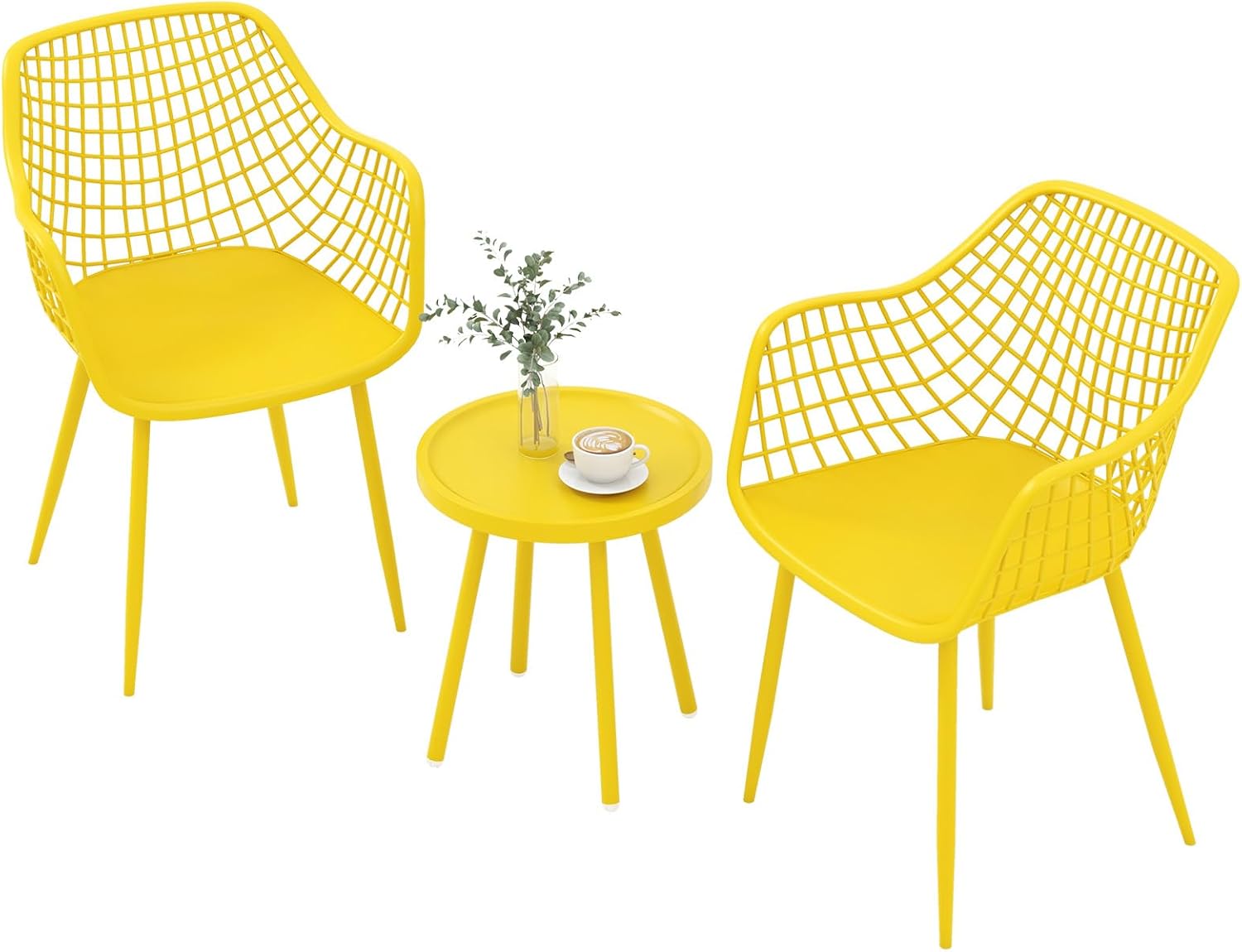 Elevate your outdoor moments with this exquisite 3-piece patio chair set. This bistro set features PP seat and tabletop, which can withstand extended use and remain beauty. The ergonomic design of the chairs with contoured seats and breathable backrests assures comfort during long periods of relaxation, while the uniquely designed concave coffee table securely holds your beverages and essentials. Moreover, the sturdy metal structure and adjustable footpads offer strong support and high safety. Make this versatile set part of your living space and transform your environment into a sanctuary of tranquility.