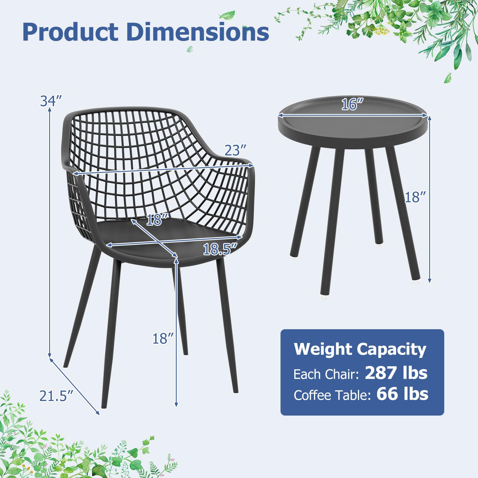 - [Perfect for Outdoor & Indoor Use]: This 3-piece furniture set is a wonderful addition to any space in need of a relaxing touch, including your porch, backyard, or living room. Dimension of each chair: 21.5”x 23” x 34” (L x W x H). Dimension of coffee table: 16” x 18” (Dia x H).