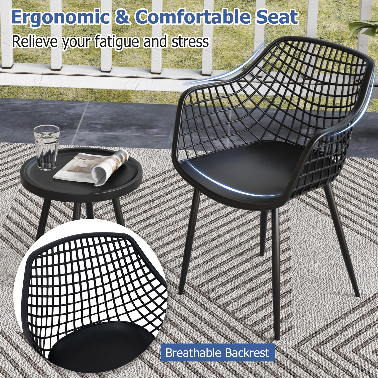 - [High-Quality PP Material]: Crafted with premium PP material, the seat and tabletop of this patio set is anti-fading, waterproof, smooth and wear resistant. The PP seat and tabletop allows you to enjoy the fresh feeling and robust performance through all seasons.