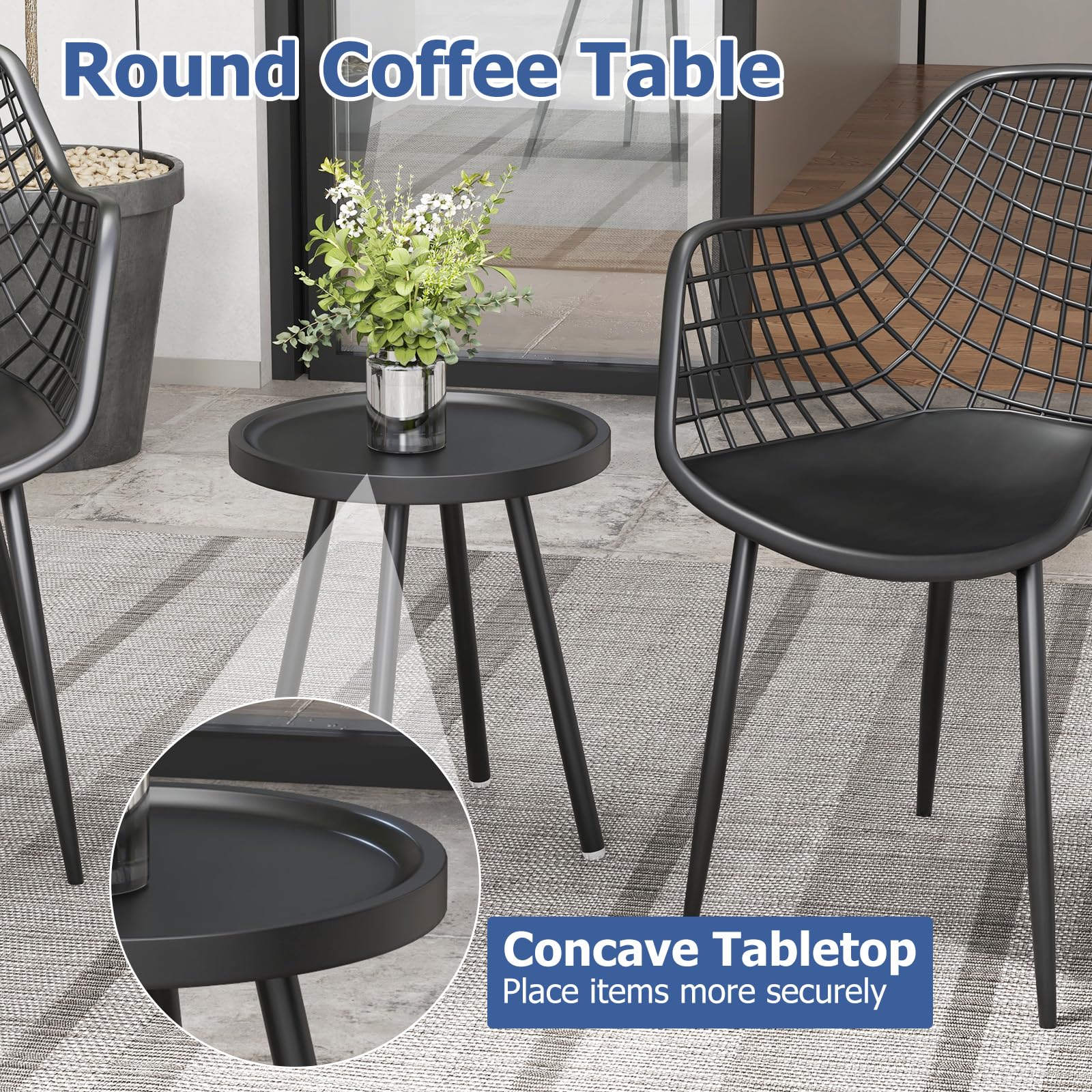 - [Small Side Coffee Table]: The bistro set includes a uniquely designed round coffee table with concave tabletop, which will place items more securely. Its smooth, curved edges complement the sleek design of the accompanying chairs.