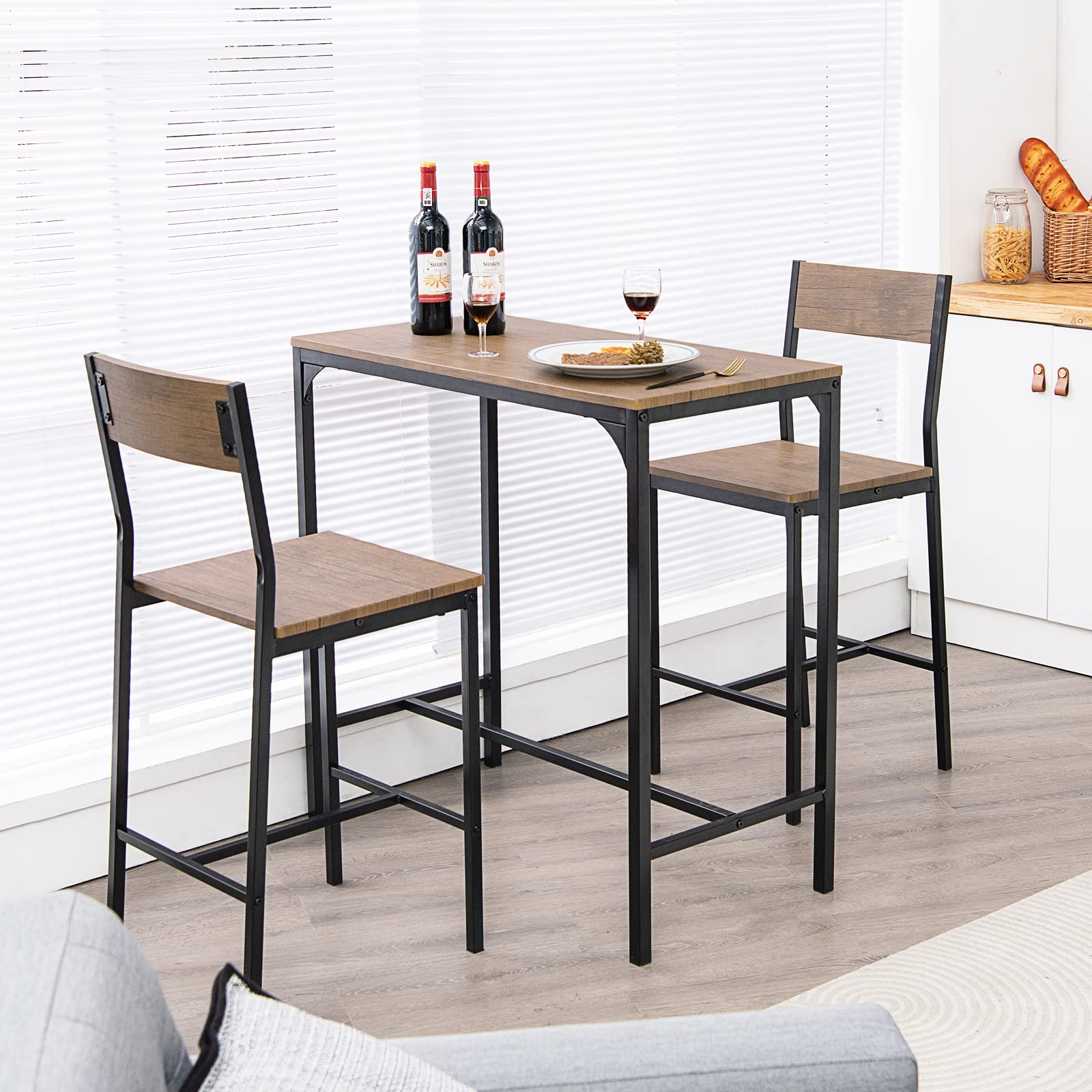 Our stylish bar table set starts delightful family time and friends gathering, allowing to enjoy entertainment all together. Moreover, the bistro table set combines natural beauty of the wood grain and simple lines to match seamlessly with any room styles. In order to save more space, the stools can be tucked under the table when not in use. Specially-designed ergonomic backrest provides you with much more comfort when sitting on the chair. The solid steel frame and durable MDF tabletop through delicate craftsmanship ensure long service time. Owning this well-designed bar table set makes it easier to enjoy delicious food and have a good time with your family and friends.