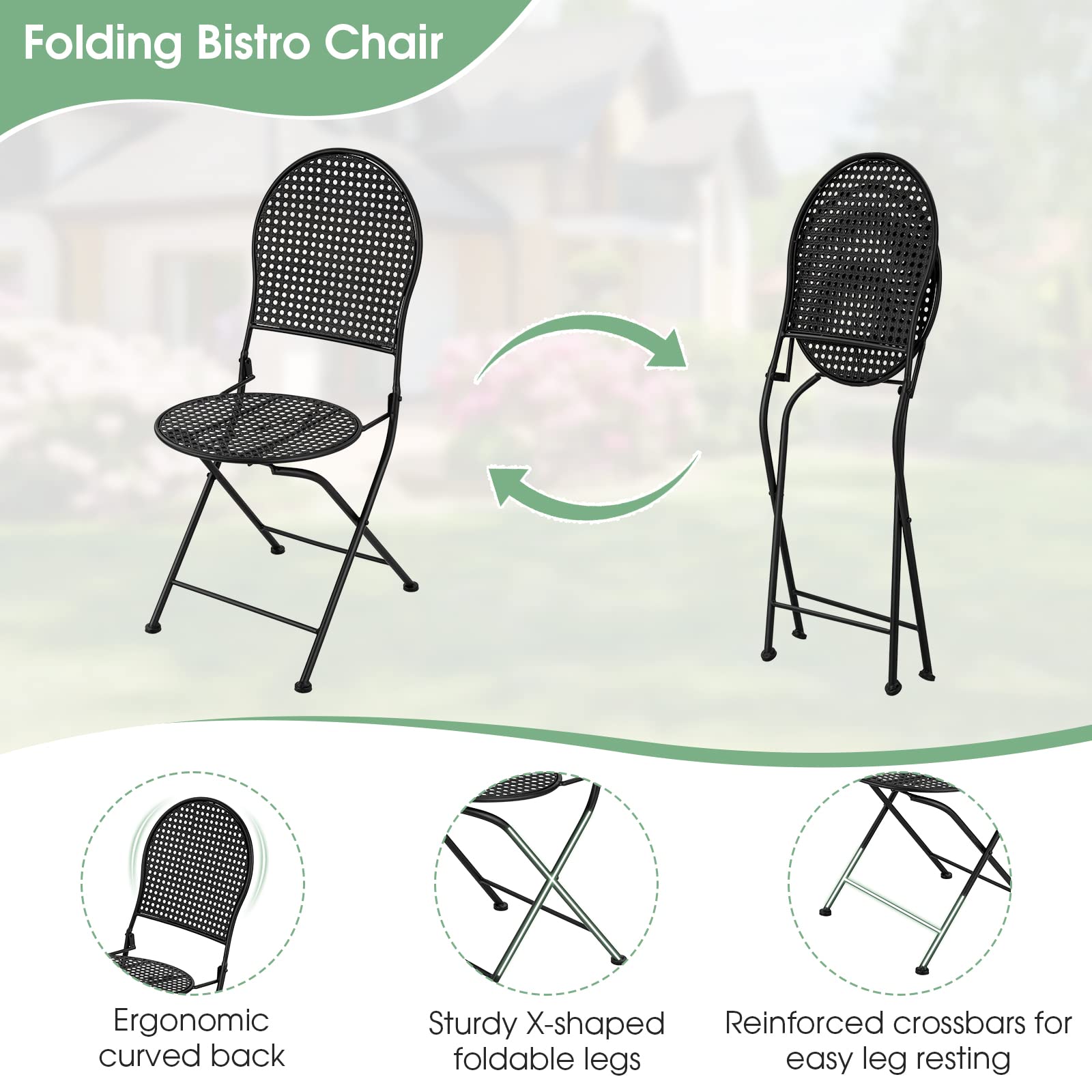 Our indoor and outdoor 3-piece table and chair set include a round table and two folding chairs, ideal for enjoying friendly conversation and coffee with beloved ones. With its minimalist and classic design, this outdoor table set of 3 will add a touch of glamour to your spaces. When not in use, the chairs can be folded up quickly, which is perfect for small indoor and outdoor spaces such as balconies or apartments. T Besides, the surface of the round hole design is not easy to accumulate water so it can support years of usage.
