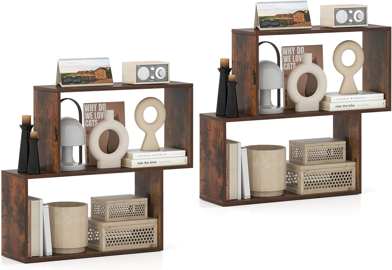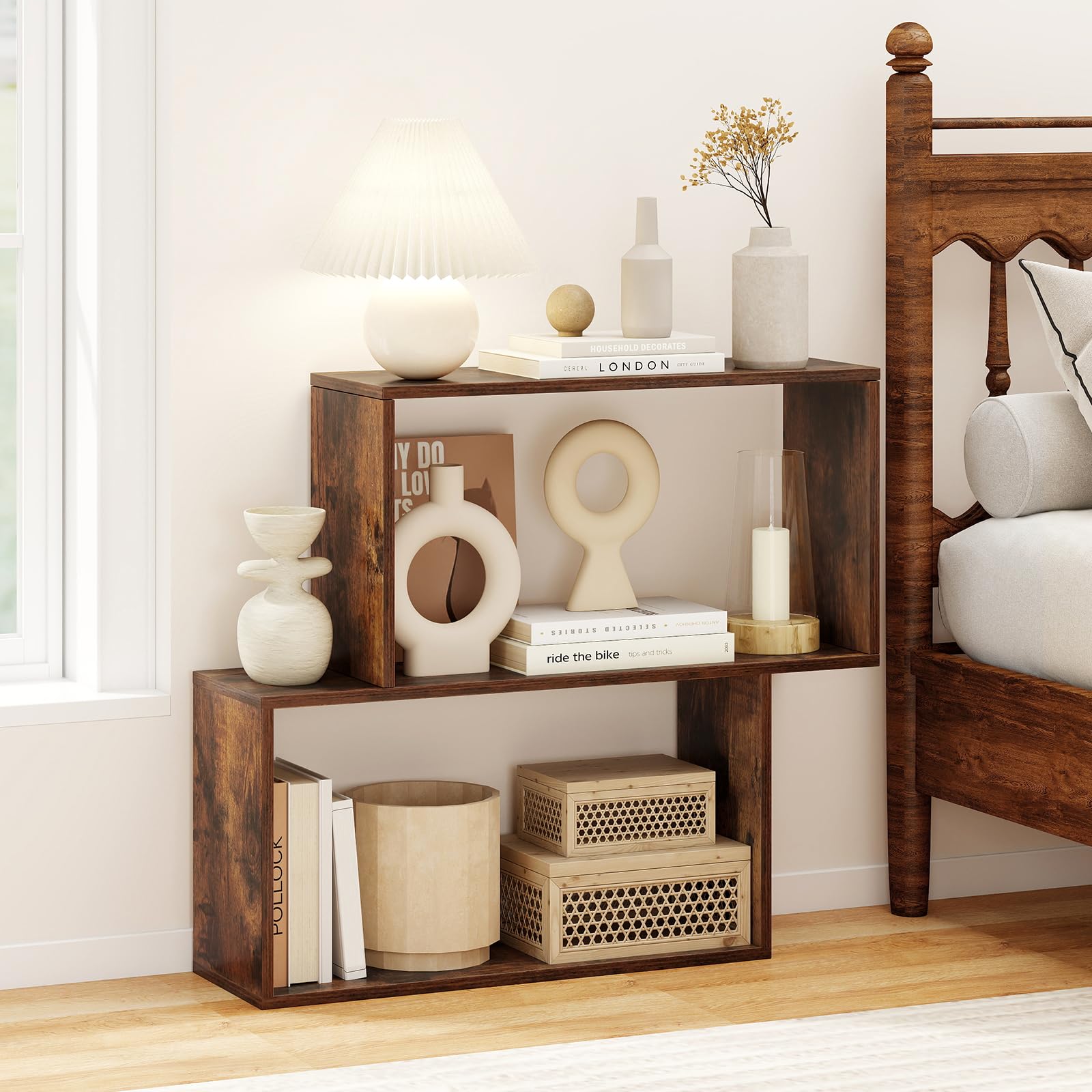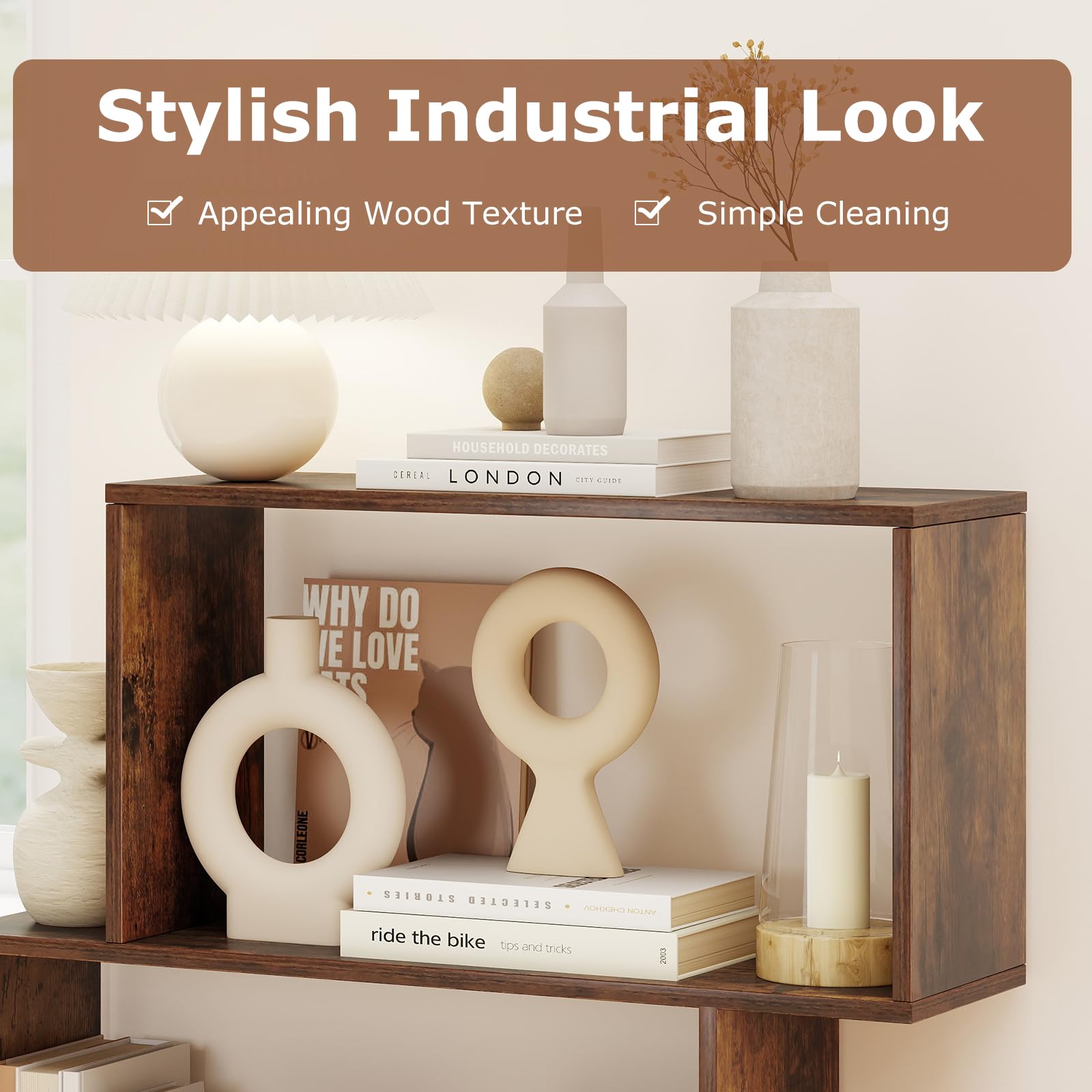 Upgrade your living room, study room, or bedroom with this unique geometric open shelf—a versatile bookshelf that combines style and function in one modern package. Boasting 3-tier ample storage space, it offers the perfect spot for books, photo frames, ornaments, while the open shelves provide easy access to all your favorite items. Designed with safety and stability in mind, this robust storage organizer comes equipped with 2 anti-tipping devices and non-slip foot pads for worry-free daily use. Whether as a display shelf, bookcase, nightstand, or sofa side table, its space-saving design is the perfect addition to any space. Finished with an easy-to-clean surface and user-friendly details, this geometric bookshelf is truly built for both convenience and style.