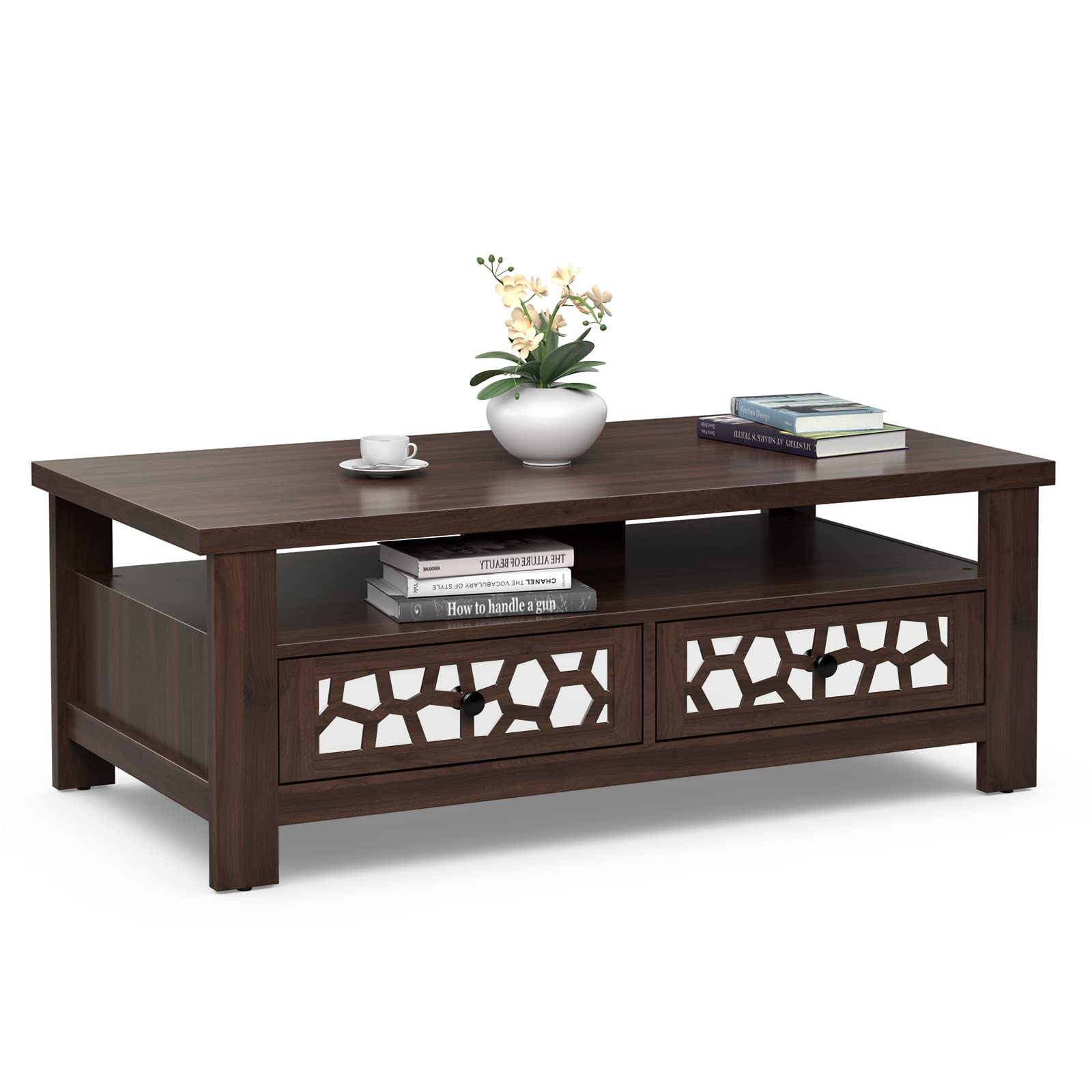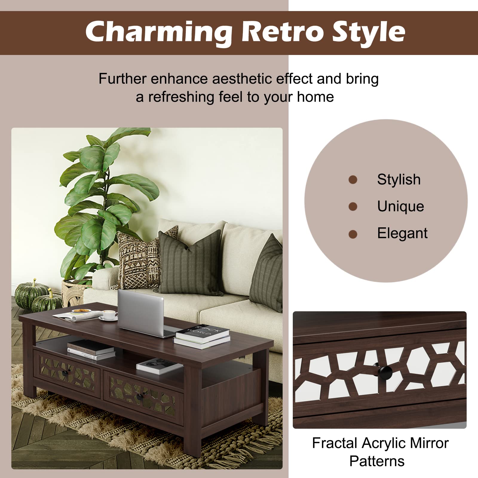 This coffee table combines storage, display and decoration all into one. Wide tabletop, open shelf and 2 large drawers provide you with multiple storage options for a variety of daily supplies and decorative items. Thanks to durable wood board and 5 support legs, the coffee table ensures a rugged and stable structure. Besides, the versatile coffee table is a perfect collocation for various activities, such as chatting, working and dining. More, its elegant design with acrylic mirror patterns will perfectly match well with other furniture and add aesthetic beauty to your living surroundings, whether in your living room or reception room.
