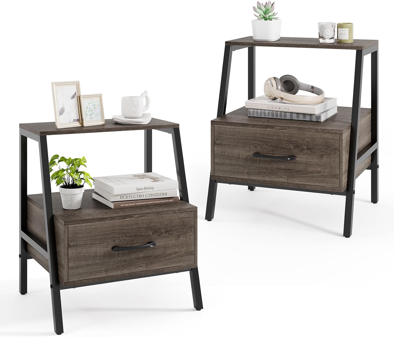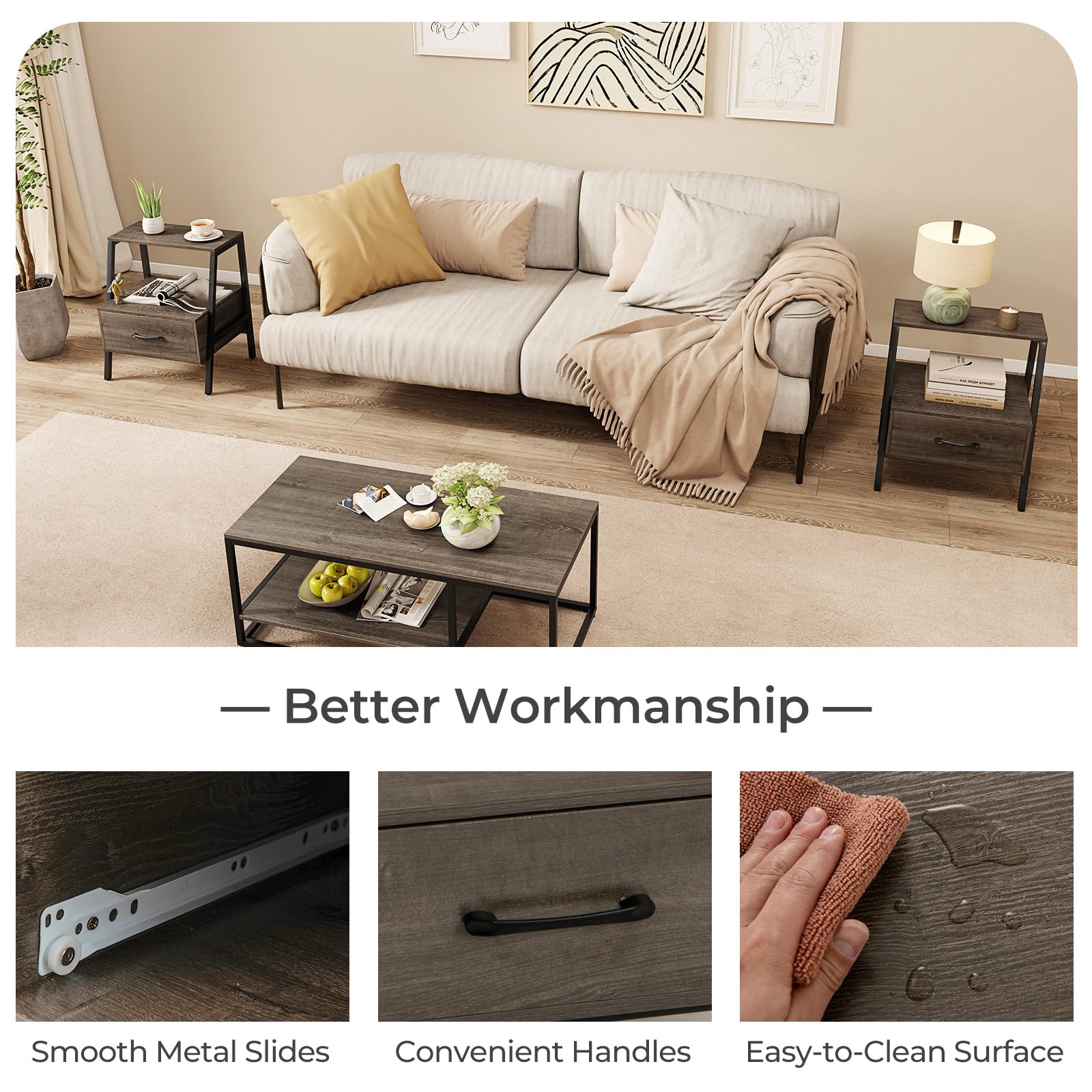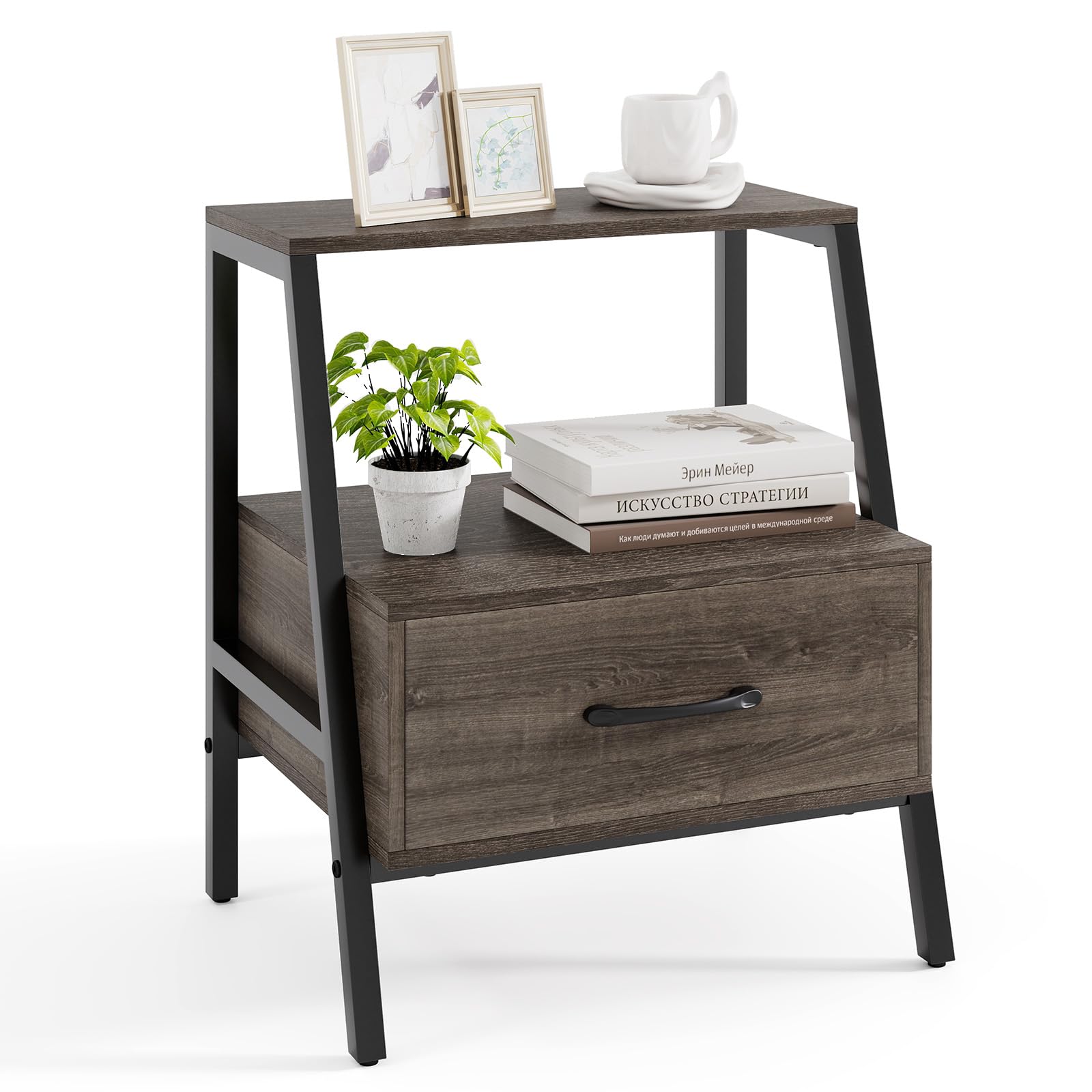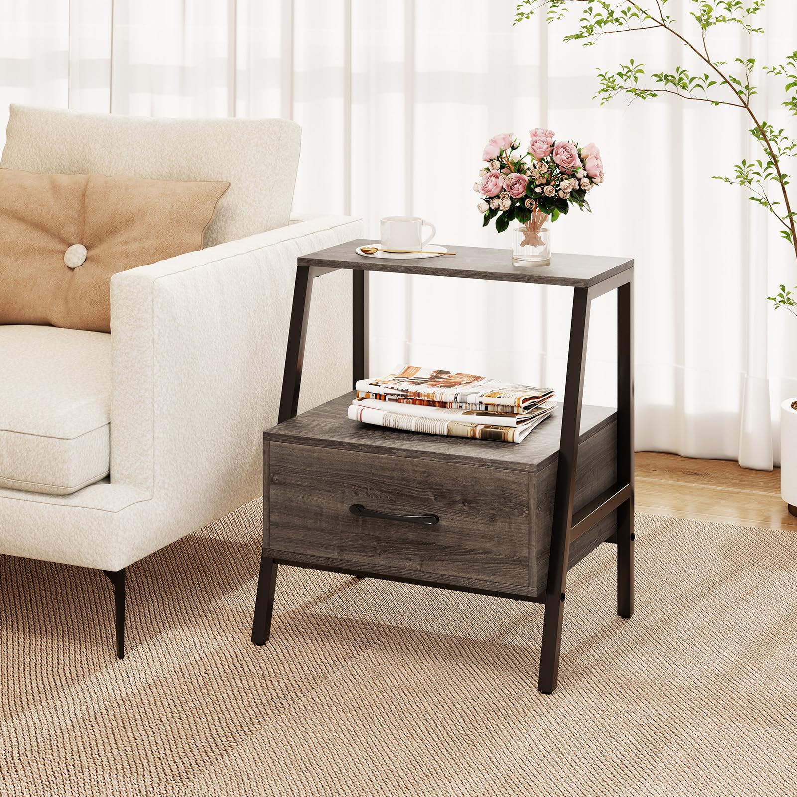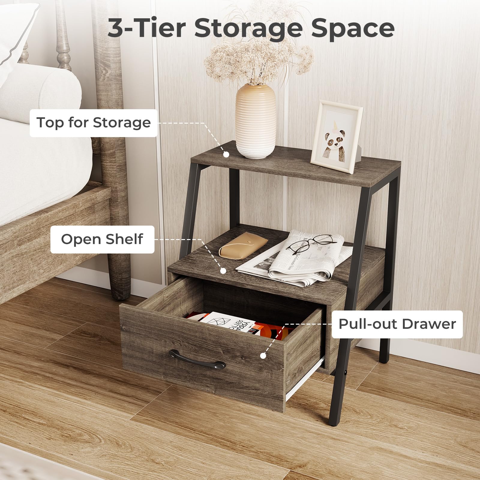 This farmhouse-style side table combines style and function in a compact 3-tier design. It features a wide top surface, an open shelf, and a pull-out drawer to keep your essentials organized and within reach. The rustic wood finish and clean lines blend easily with farmhouse, modern, or transitional décor. The powder-coated metal frame and trapezoidal structure provide reliable stability and durability. Perfect for use as a nightstand or end table, it fits well in bedrooms, living rooms, or home offices. Smooth drawer slides, an easy-grip handle, and a water-resistant surface make daily use simple and maintenance easy.