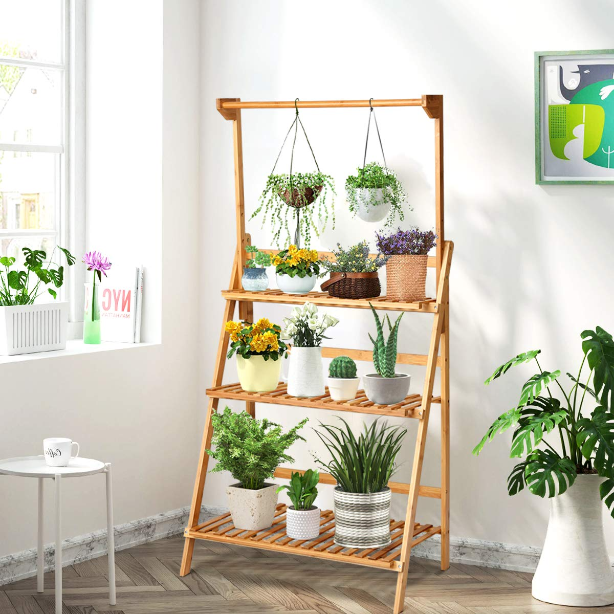 Attractive Hanging Design Equipped with an elegant hanging rod is a perfect design that allows plants to hang and provide plenty of space for display. The plant stand has three layers, each of which has a different height and width and can be placed with different sizes of plants. The triangular structure enhances the stability of the plant stand without shaking.