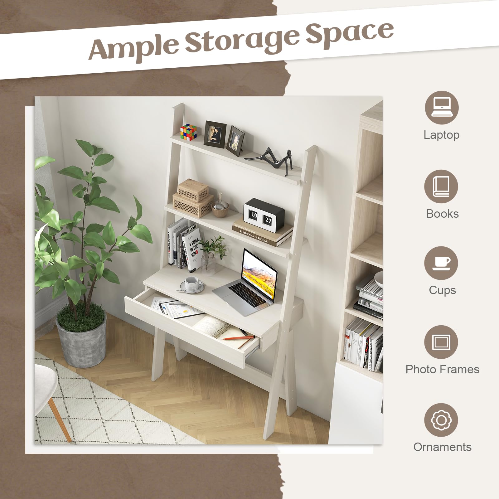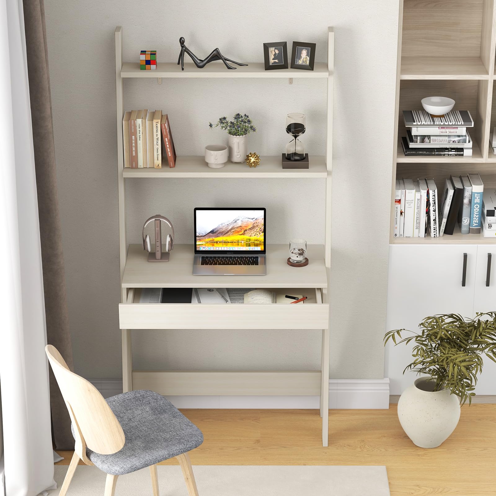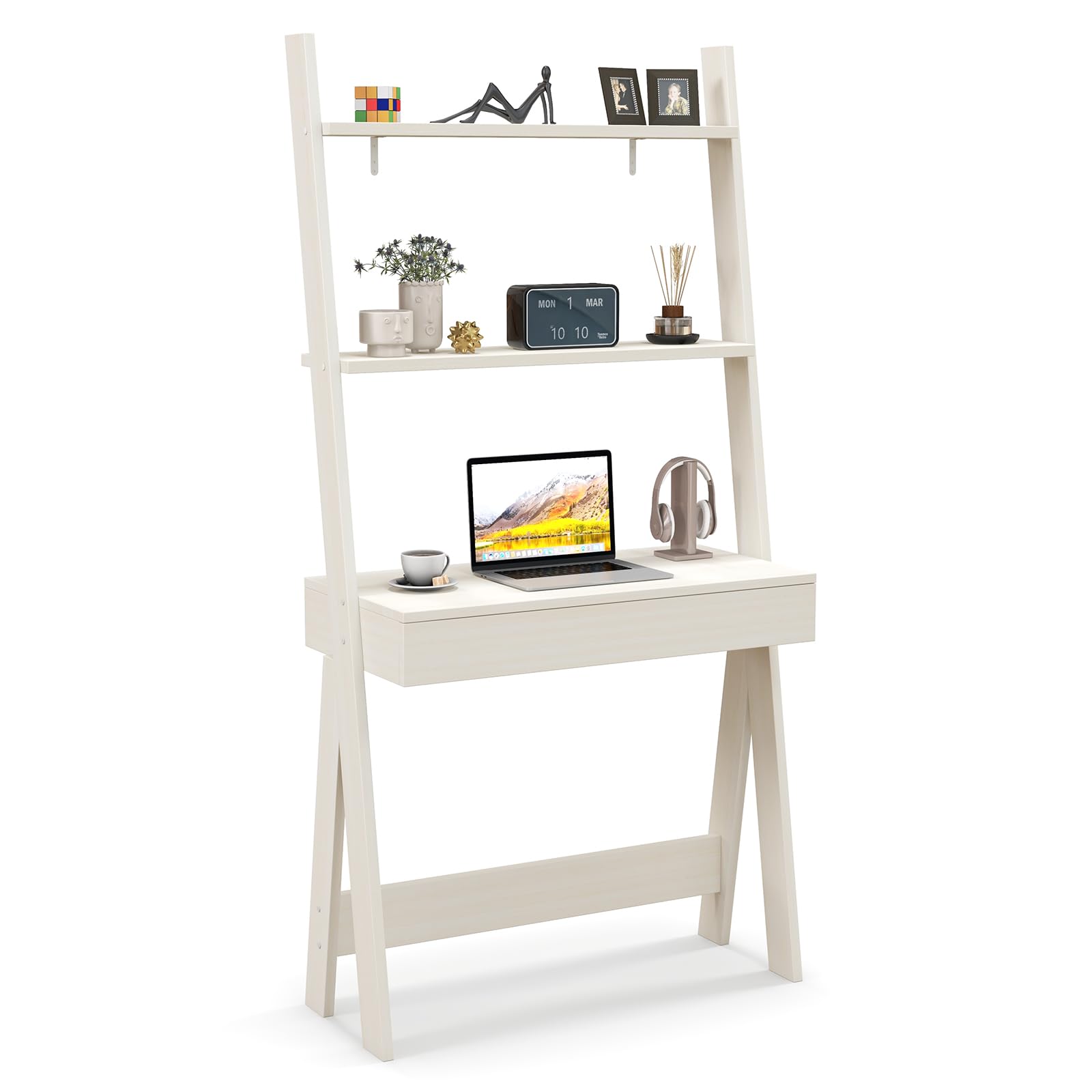 - [3-Tier Ladder Desk] : Designed with 3 open shelves, this ladder desk provides you with sufficient storage space to put various items and make them within reach. Besides, the ladder desk only takes up a little footprint because of its vertical shape.