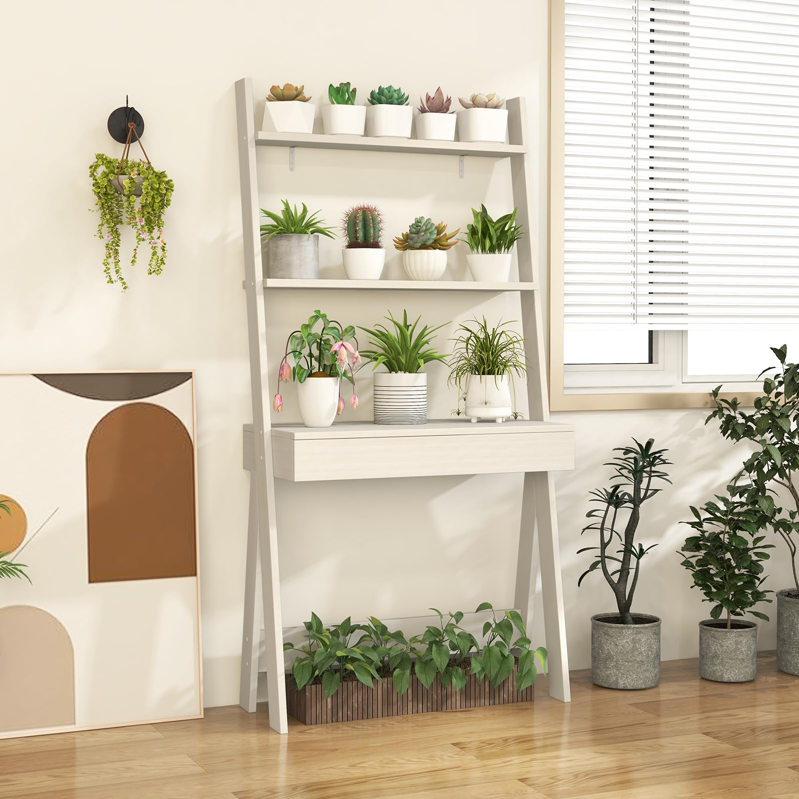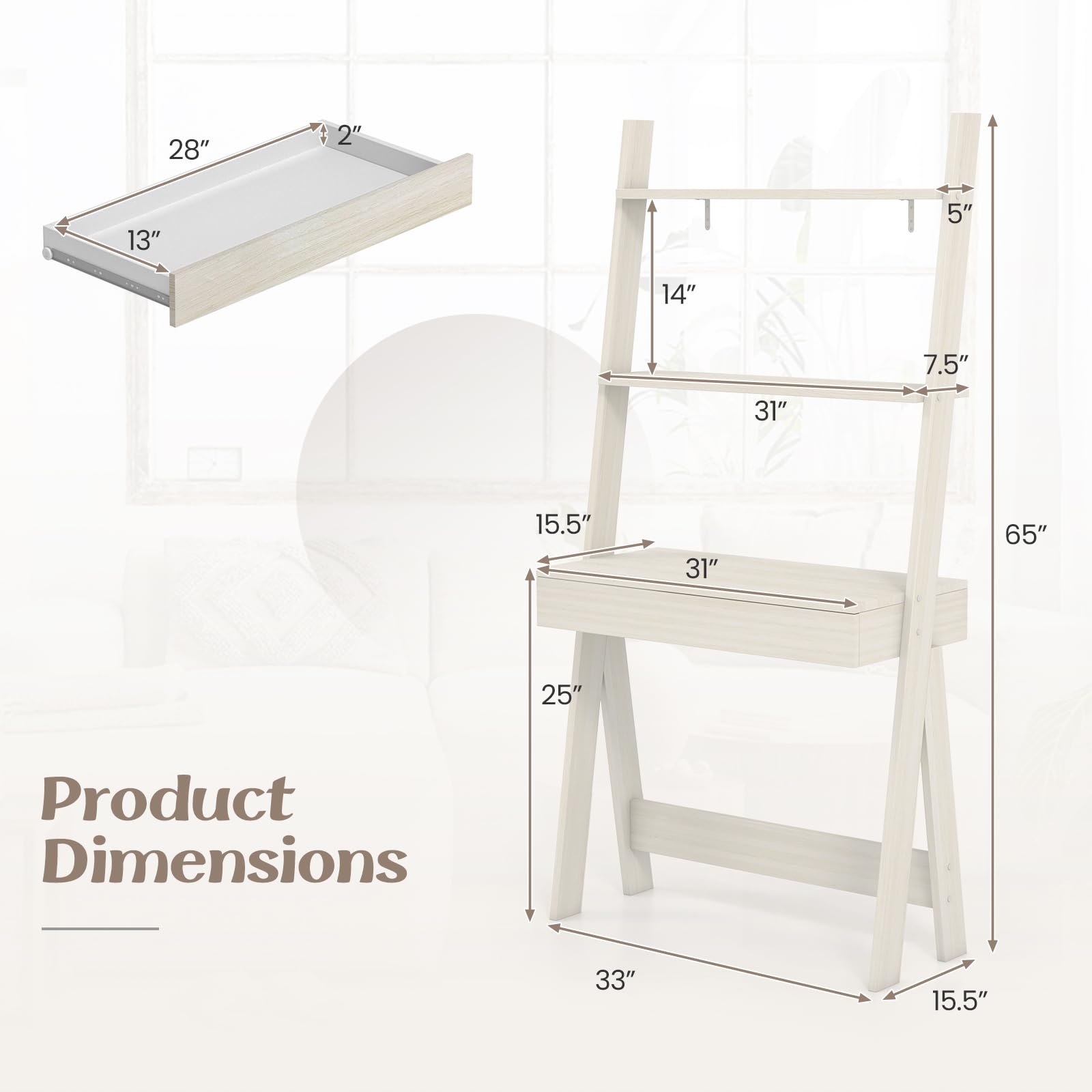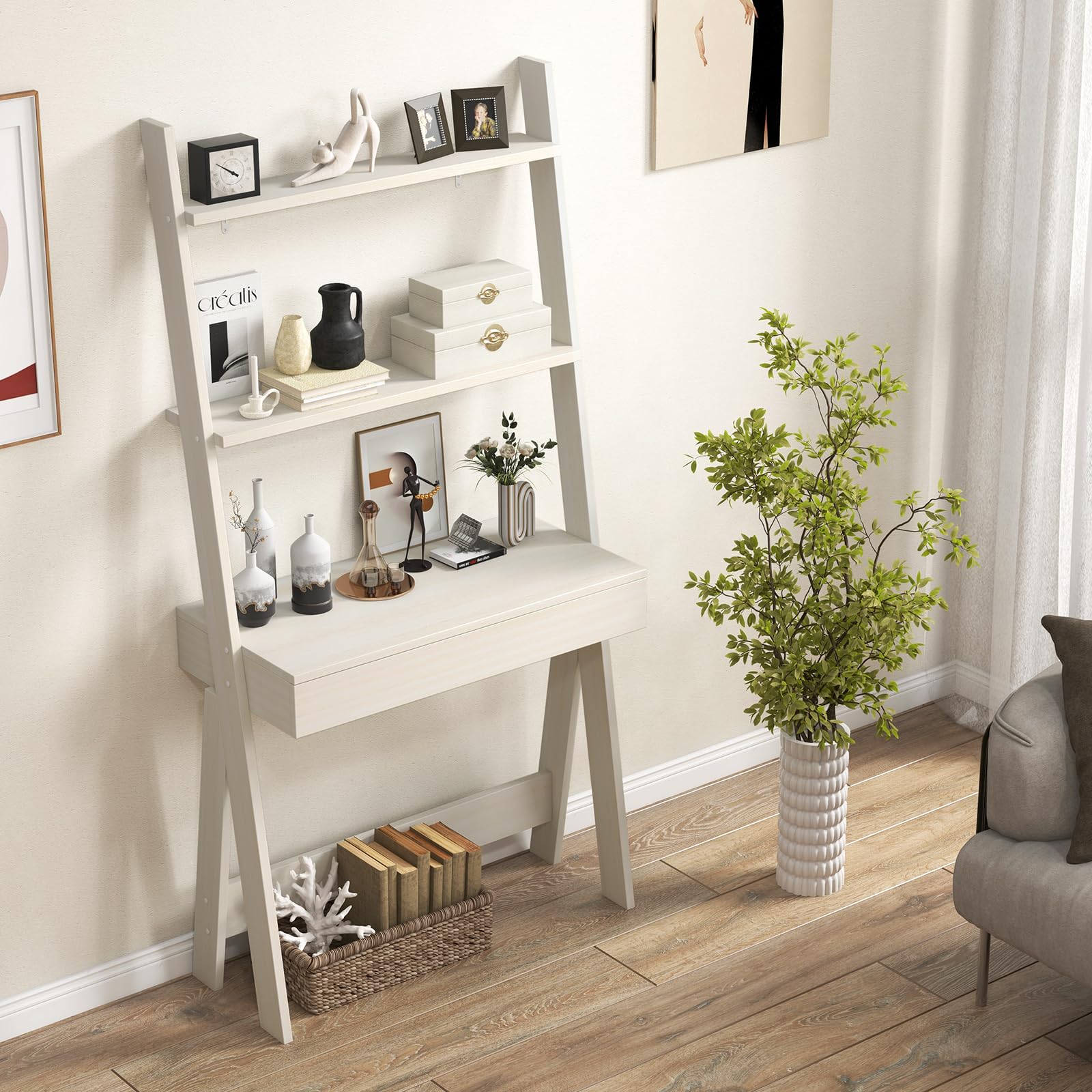 - [3-Tier Ladder Desk] : Designed with 3 open shelves, this ladder desk provides you with sufficient storage space to put various items and make them within reach. Besides, the ladder desk only takes up a little footprint because of its vertical shape.
