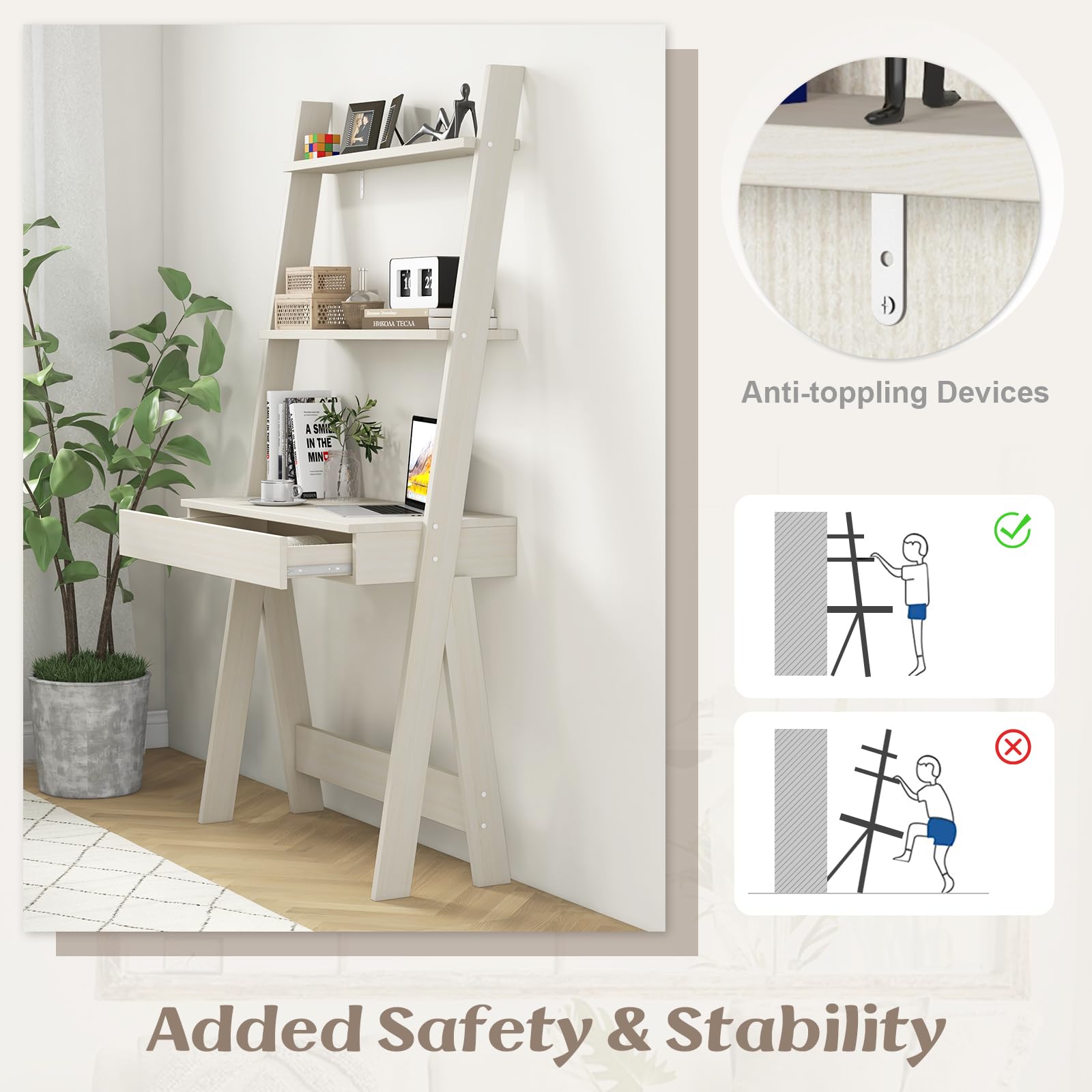 Featuring a large drawer and 3 open shelves, this freestanding bookcase can accommodate different items while keeping them neat and clean. No matter whether you want to put this ladder shelf in the living room, bedroom or kitchen, it will always fit thanks to its compact vertical shape. During use, the anti-tipping device prevents this bookcase from wobbling and shaking for safe protection.