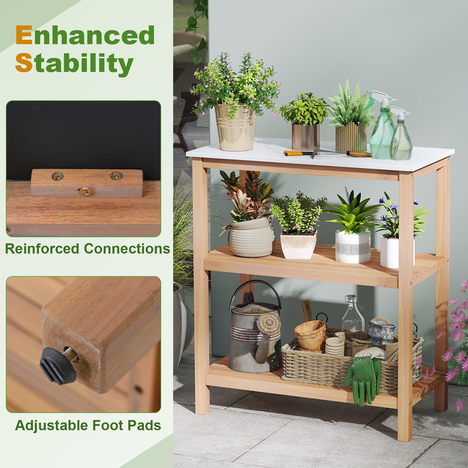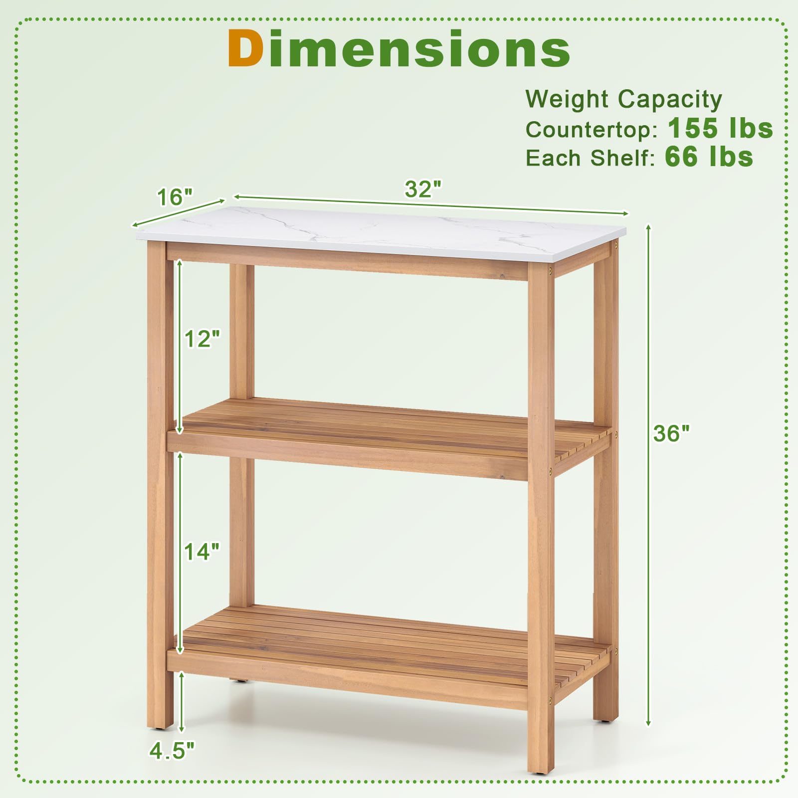 Enhance your gardening experience with our versatile outdoor potting bench table! Crafted from solid acacia wood, the potting table ensures long-lasting durability and resilience for outdoor use. The chic faux marble resin countertop is oil-proof and waterproof, ensuring hassle-free maintenance, and it is reinforced by a honeycomb structure for sturdy support. The gardening workstation also features two slatted storage shelves, keeping your gardening essentials organized and easily accessible. Not just a garden planting table, but a multipurpose storage rack fits various outdoor settings from backyards to balconies and even greenhouses.