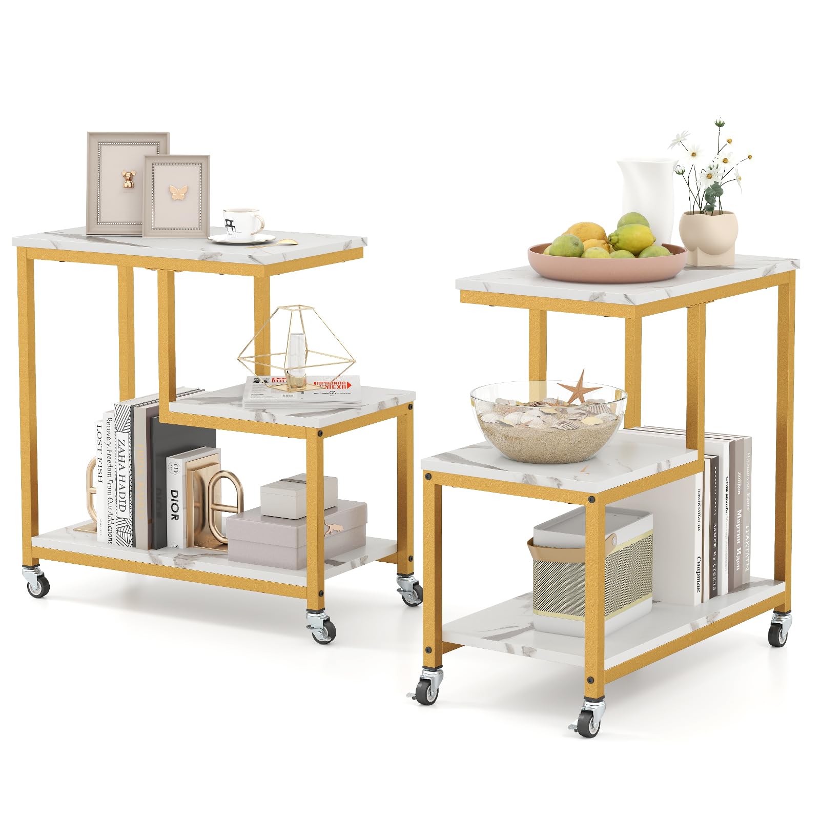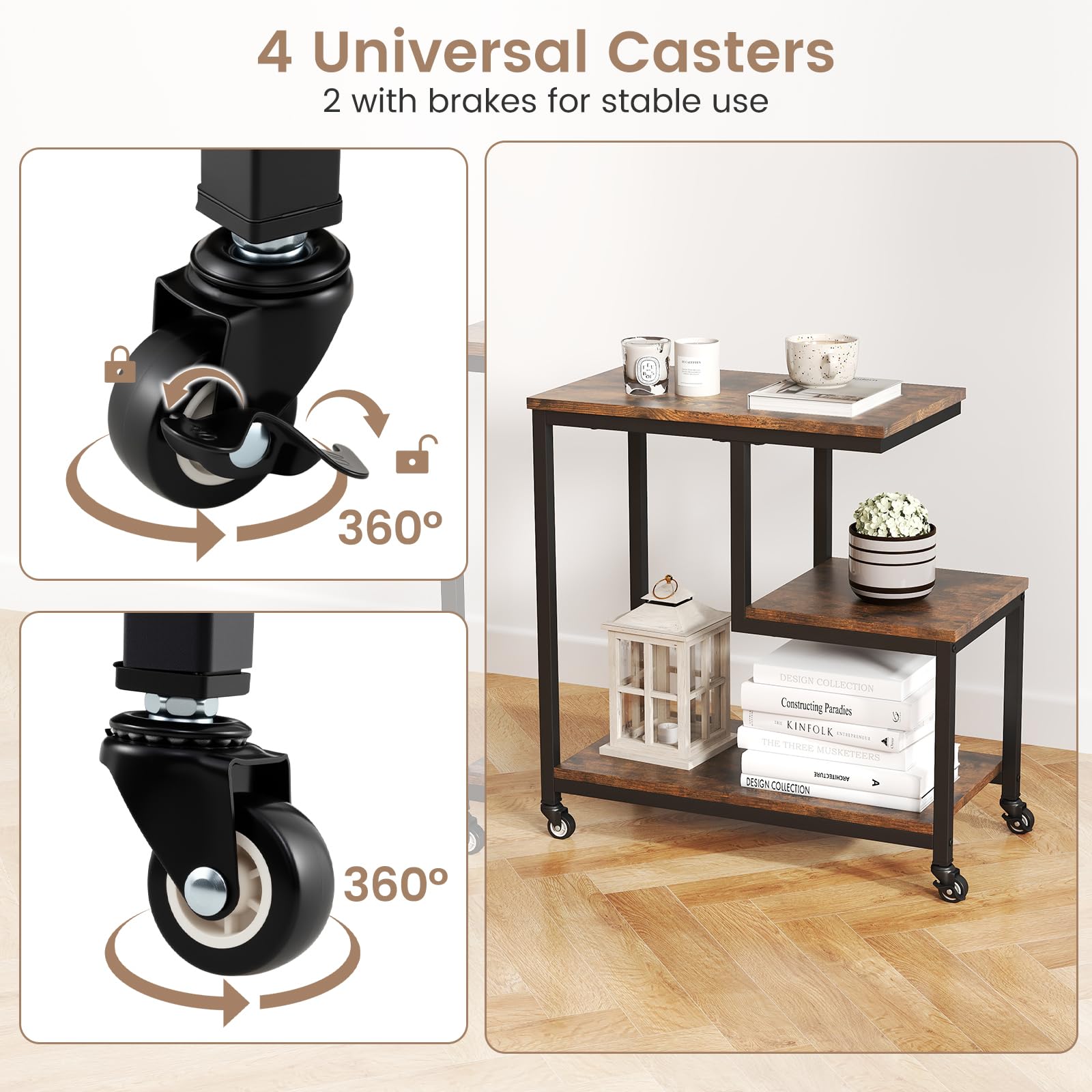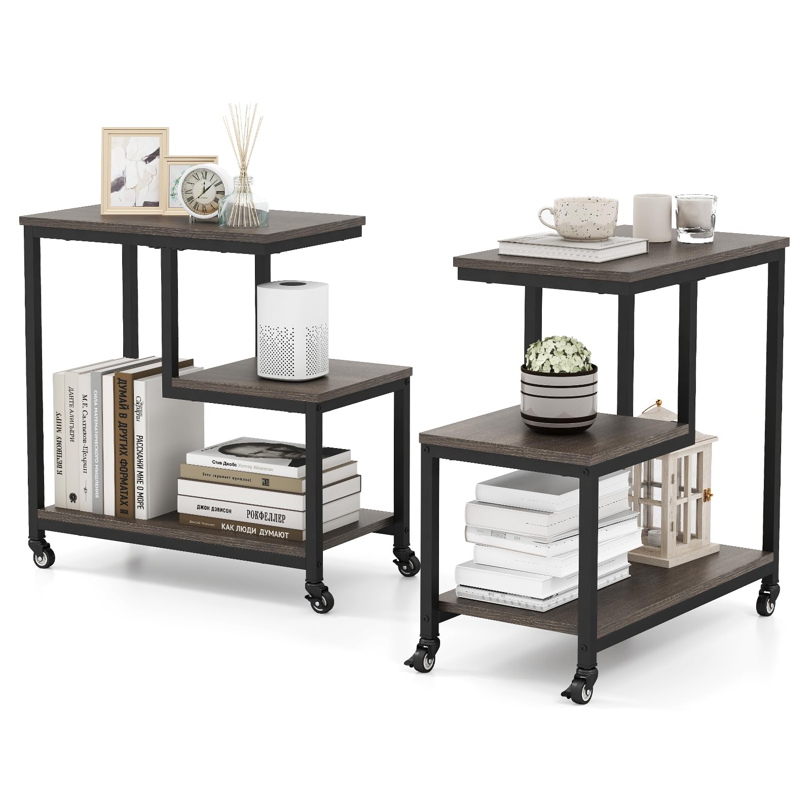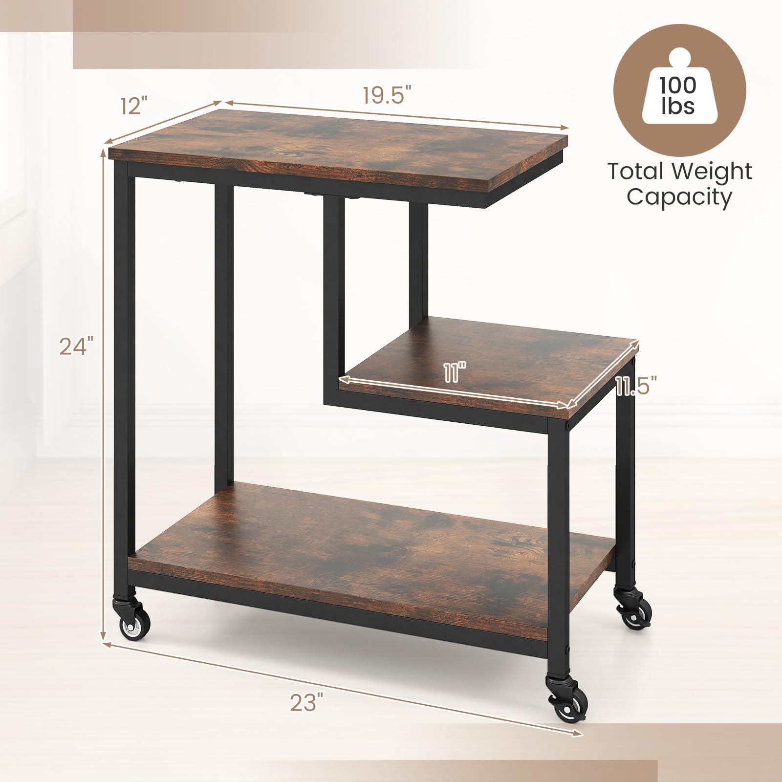 This G-shaped end table is crafted to captivate and charm, exhibiting a unique design that captures attention from every angle. Complement and customize your space by pairing it with additional tables for innovative layouts. It offers substantial storage with 3 tiers of shelving, perfect for organizing and showcasing everything from books to decorations. Besides, this side table also is equipped with 4 smooth-rolling casters for easy movement; 2 of which lock to provide stability as needed. Built with a robust metal frame and thick, high-quality boards, the couch table supports up to 100 lbs and requires low maintenance. With its versatility, it transitions effortlessly from a chic side table to a functional printer stand or stylish nightstand, making it an essential addition to living rooms, bedrooms, or offices.