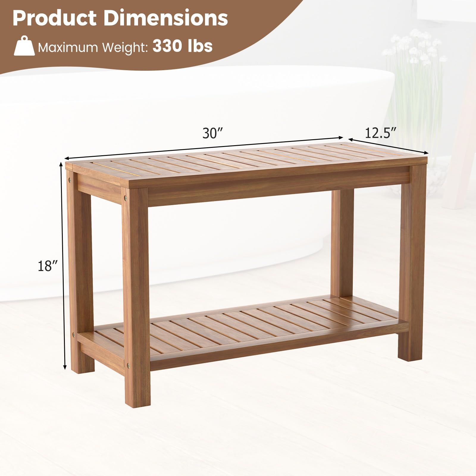 Crafted from teak wood, the teak shower bench stands out for its unmatched sturdiness and durability, promising a long-lasting addition to your home. Featuring a 2-tier storage system, the bathroom rack is the epitome of organization. Additionally, the slatted design not only adds a touch of sophistication but also promotes efficient drainage, making it ideal for areas like bathrooms or poolside settings. Also, the large bench can be used as a shoe bench or entryway storage shelf as you need. Built to last, our teak wood bathroom rack boasts thickened boards that significantly enhance its stability. Moreover, the water-based painting allows you to keep the bath spa seat looking pristine with minimal effort.