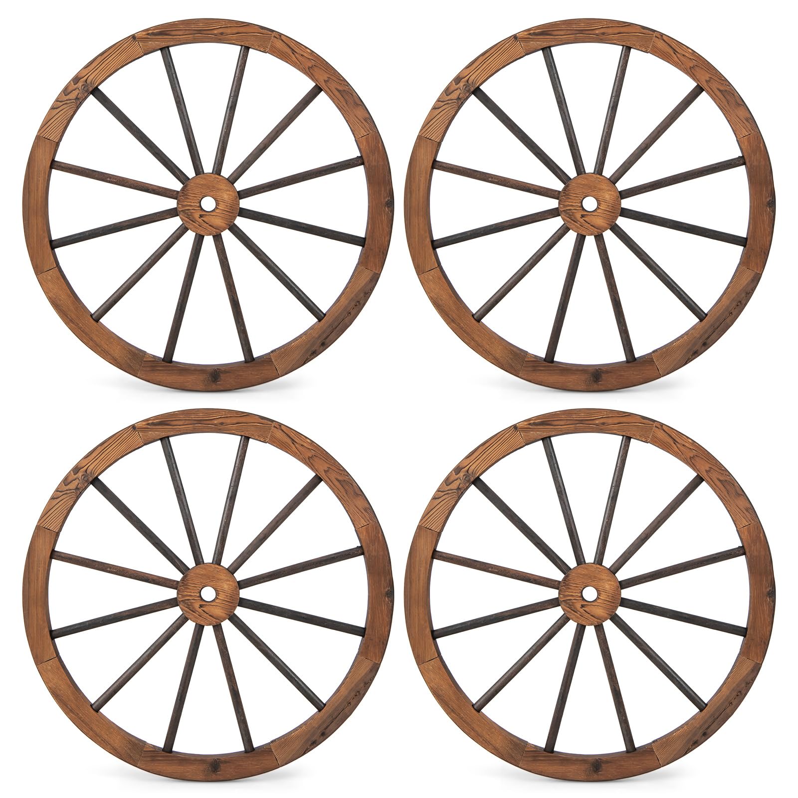 - 【Carbonization Treatment】: Through meticulous carbonization treatment, the water content of the wagon wheel decor is significantly reduced. With this treatment, these wooden wheels will last much longer and can be displayed outdoors for years. And there is a layer of varnish to enhance water-resistance.