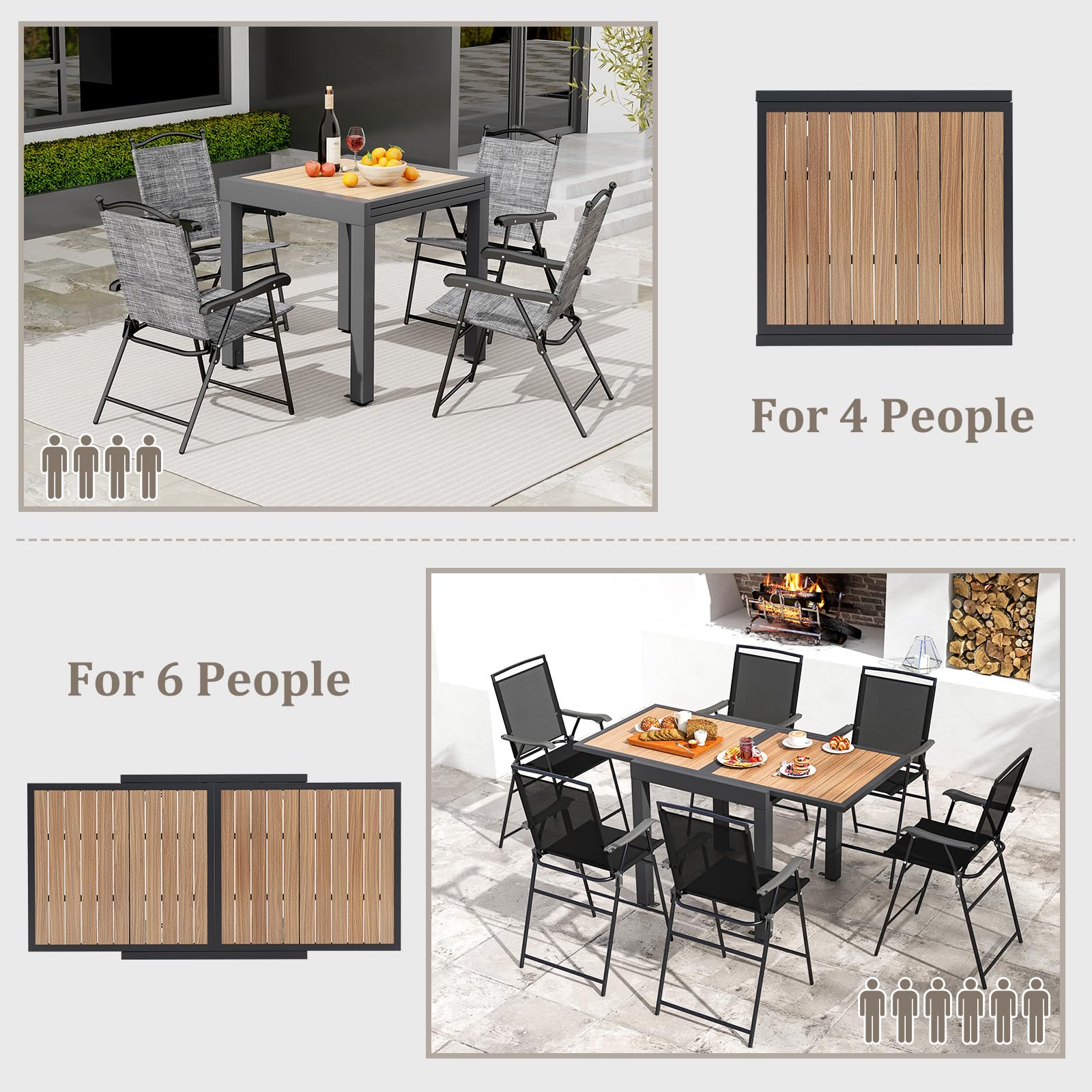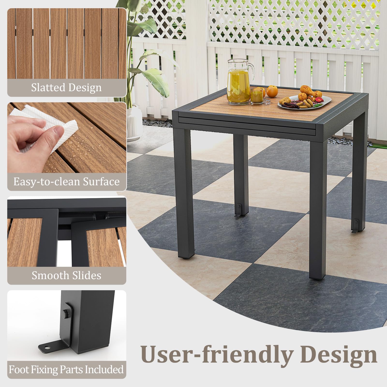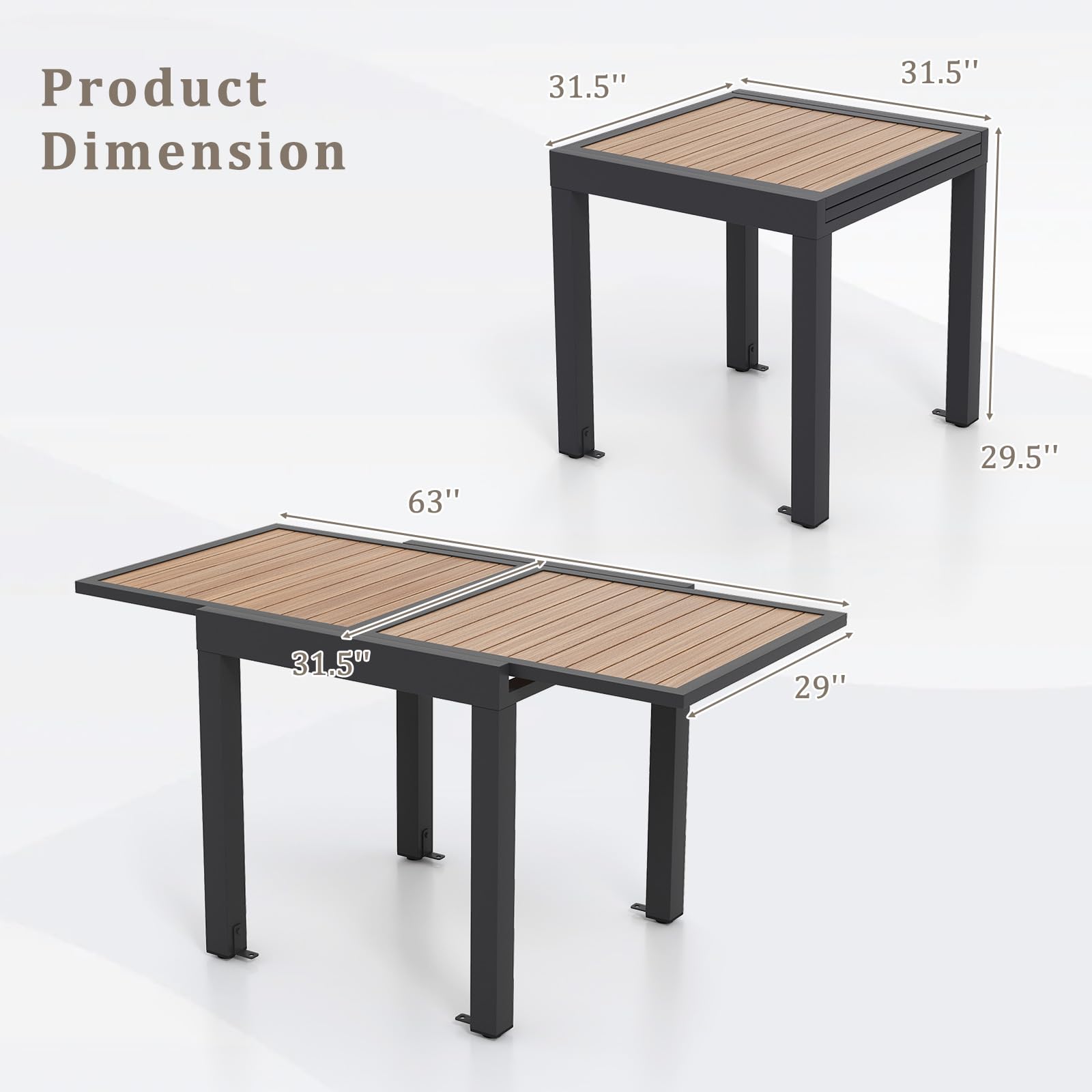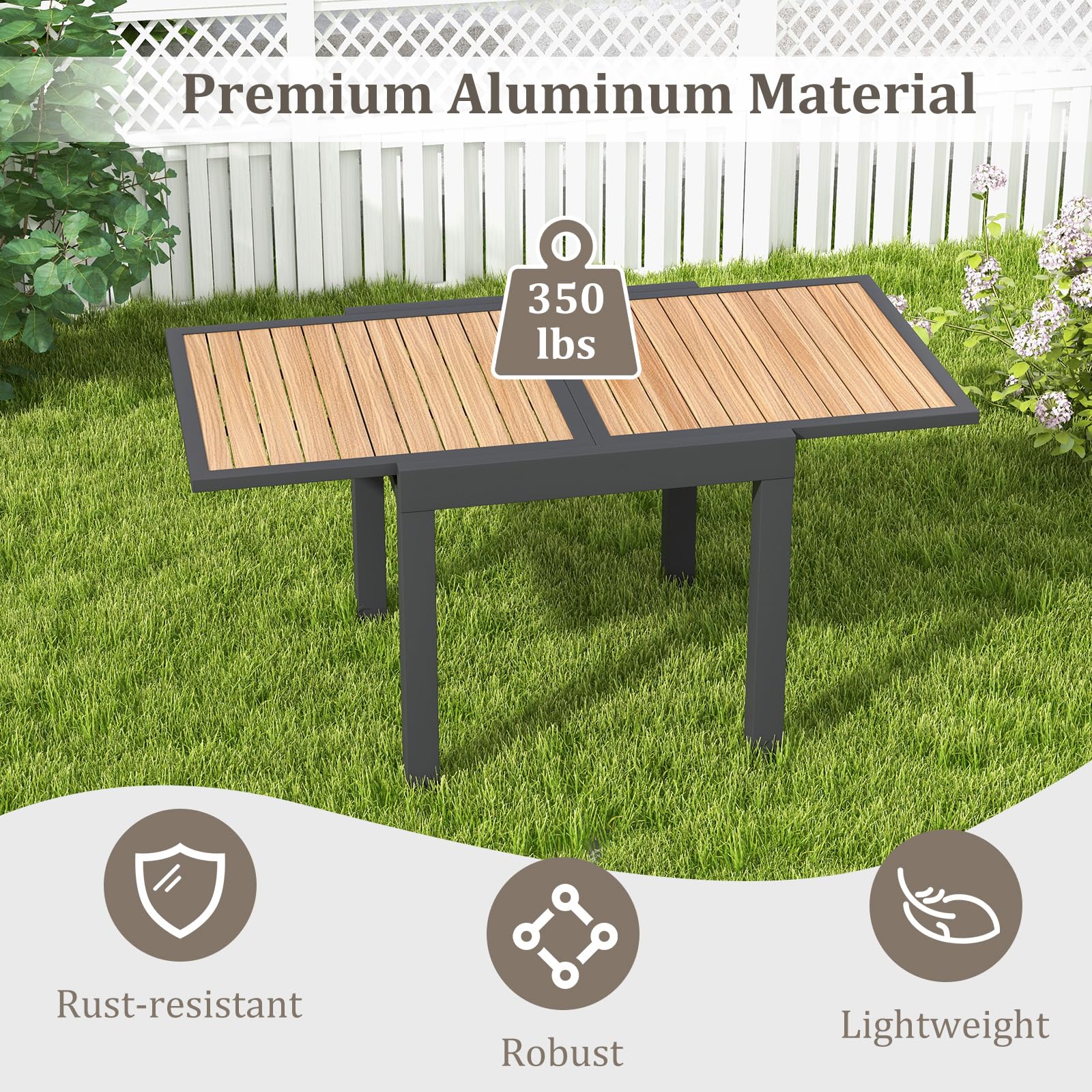 Discover the versatility of our extendable tabletop, perfect for hosting gatherings in different spaces. Featuring a unique design that effortlessly extends from 31.5 to 63 inches for intimate gatherings. Moreover, constructed of premium aluminum material, this table is rust-resistant and can support up to 350 lbs weight for long-lasting durability. Additionally, perfect for a variety of occasions, this versatile table complements any decor style with its sleek slat design and wood-like tabletop. With 4 L-shaped feet, this table provides extra stability.