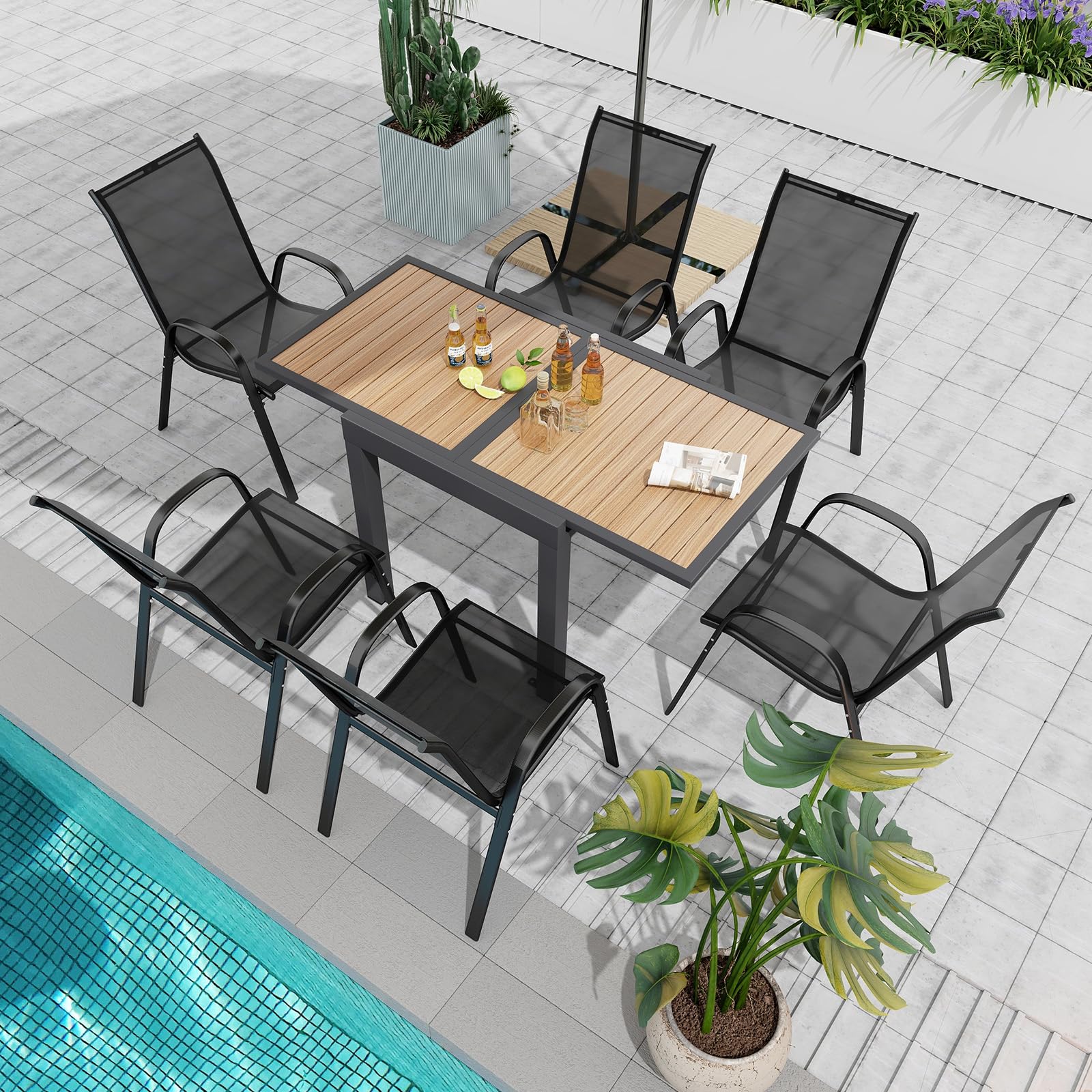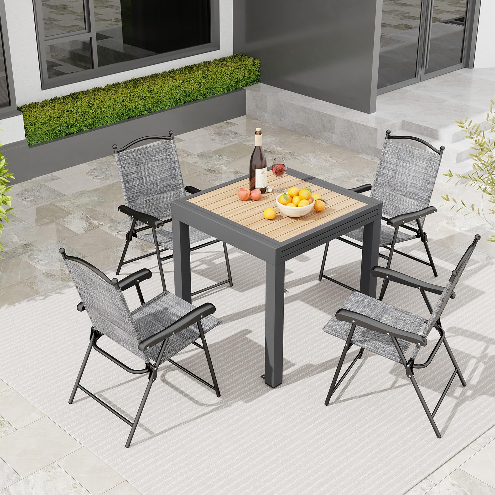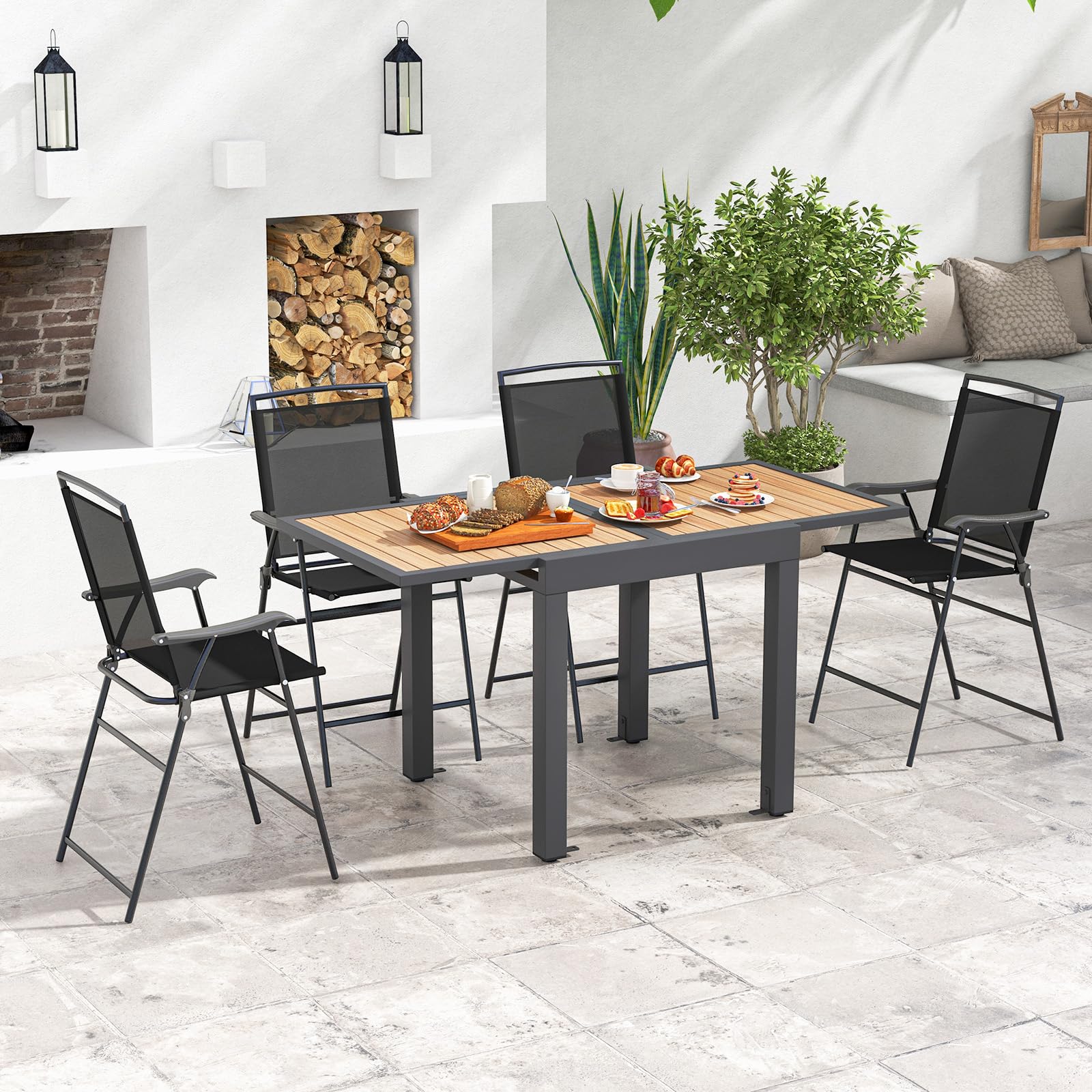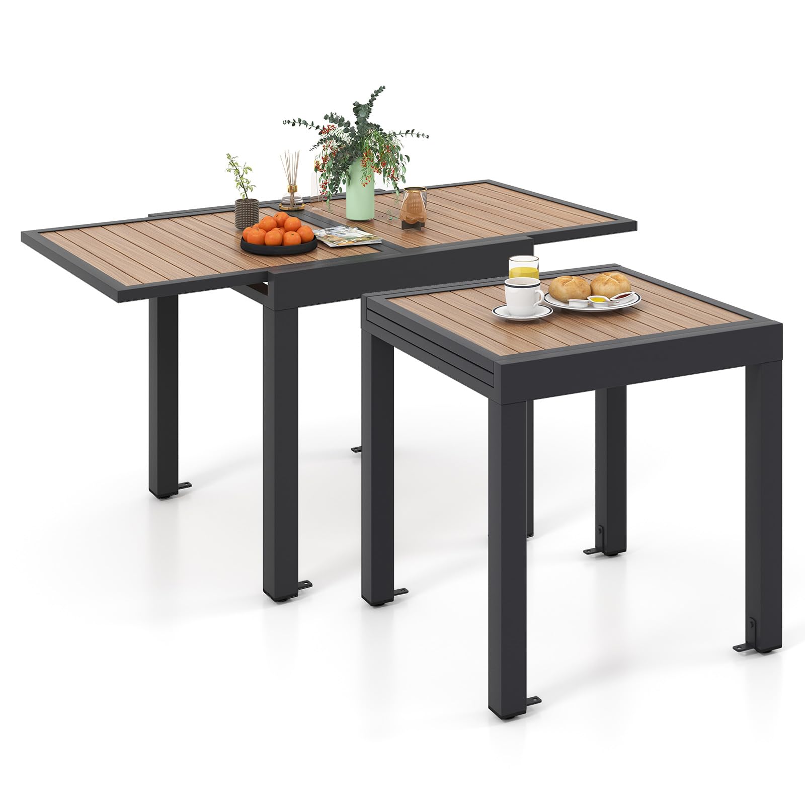 Discover the versatility of our extendable tabletop, perfect for hosting gatherings in different spaces. Featuring a unique design that effortlessly extends from 31.5 to 63 inches for intimate gatherings. Moreover, constructed of premium aluminum material, this table is rust-resistant and can support up to 350 lbs weight for long-lasting durability. Additionally, perfect for a variety of occasions, this versatile table complements any decor style with its sleek slat design and wood-like tabletop. With 4 L-shaped feet, this table provides extra stability.