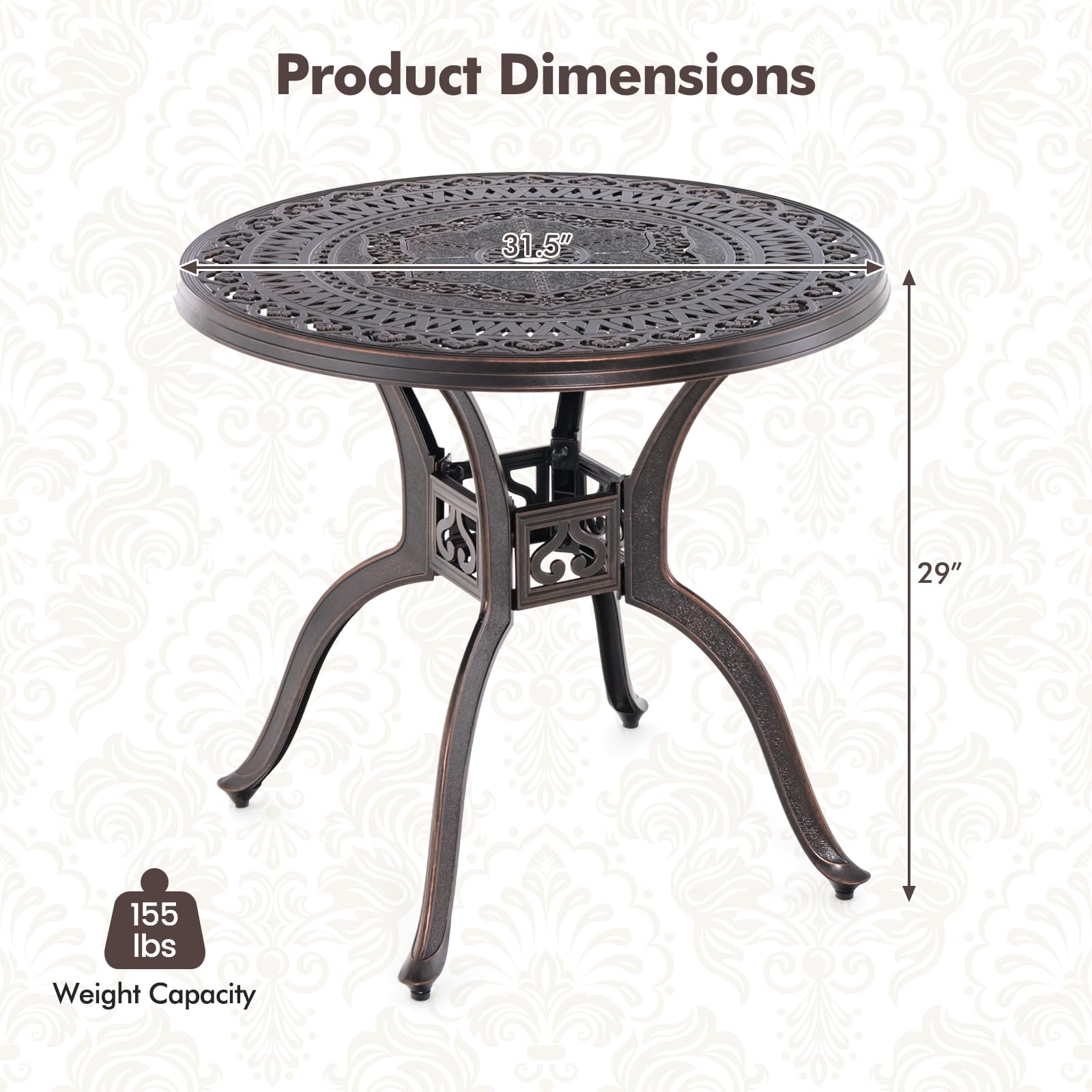 The cast aluminum structure of table is super sturdy and built to last, enduring the test of time outdoors. Centered with a 2" hole, it easily supports most umbrellas for those sunny days. Stability is a promise, thanks to the table’s reinforced build, gracefully curved legs and adjustable footpads. The exquisite tabletop patterns impart sophistication, making it a versatile addition to any outdoor setting. This table is the epitome of outdoor charm, combining strength with a touch of class for your leisure spaces.